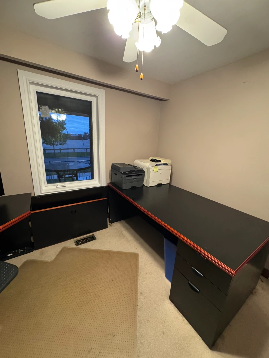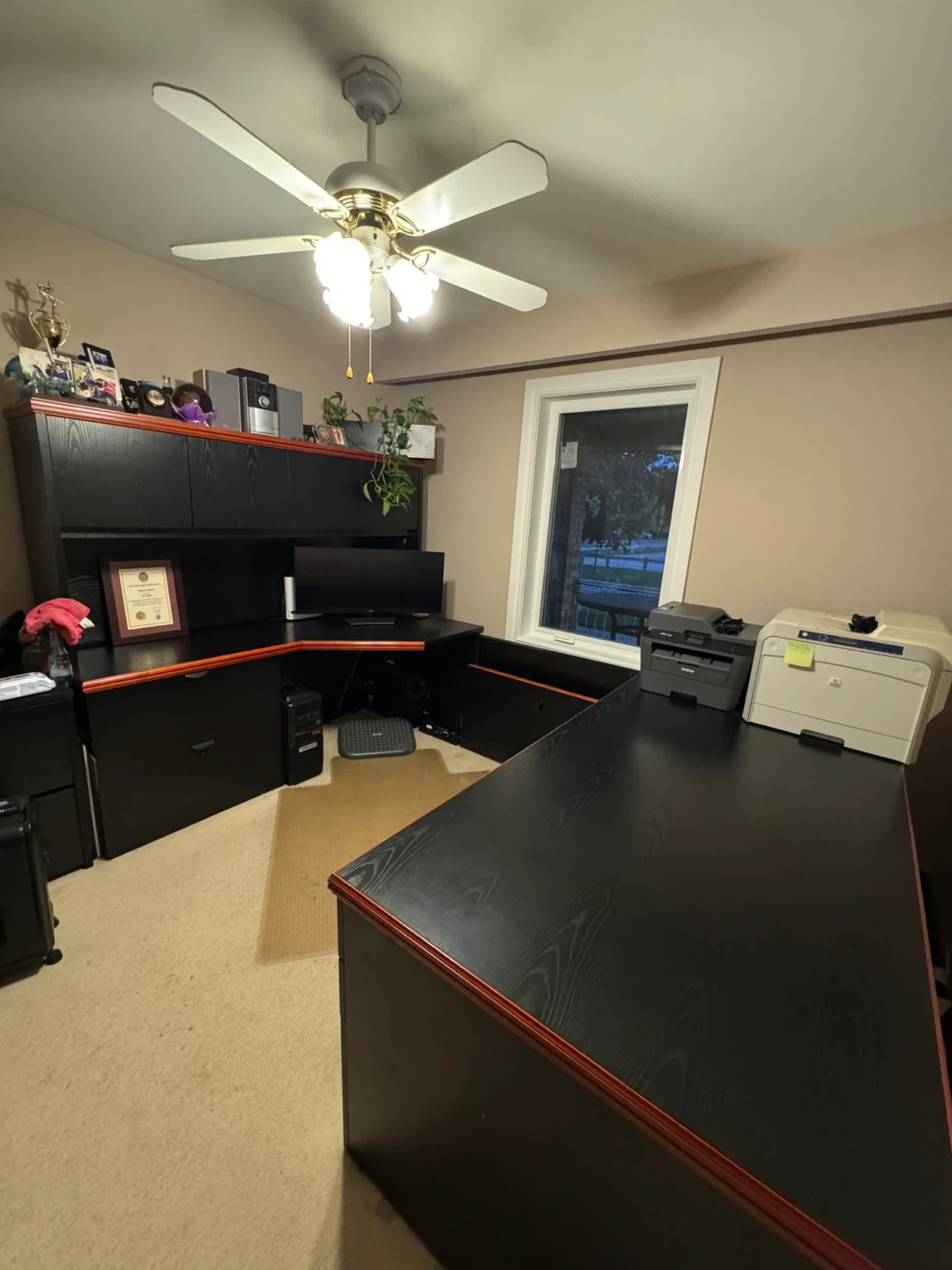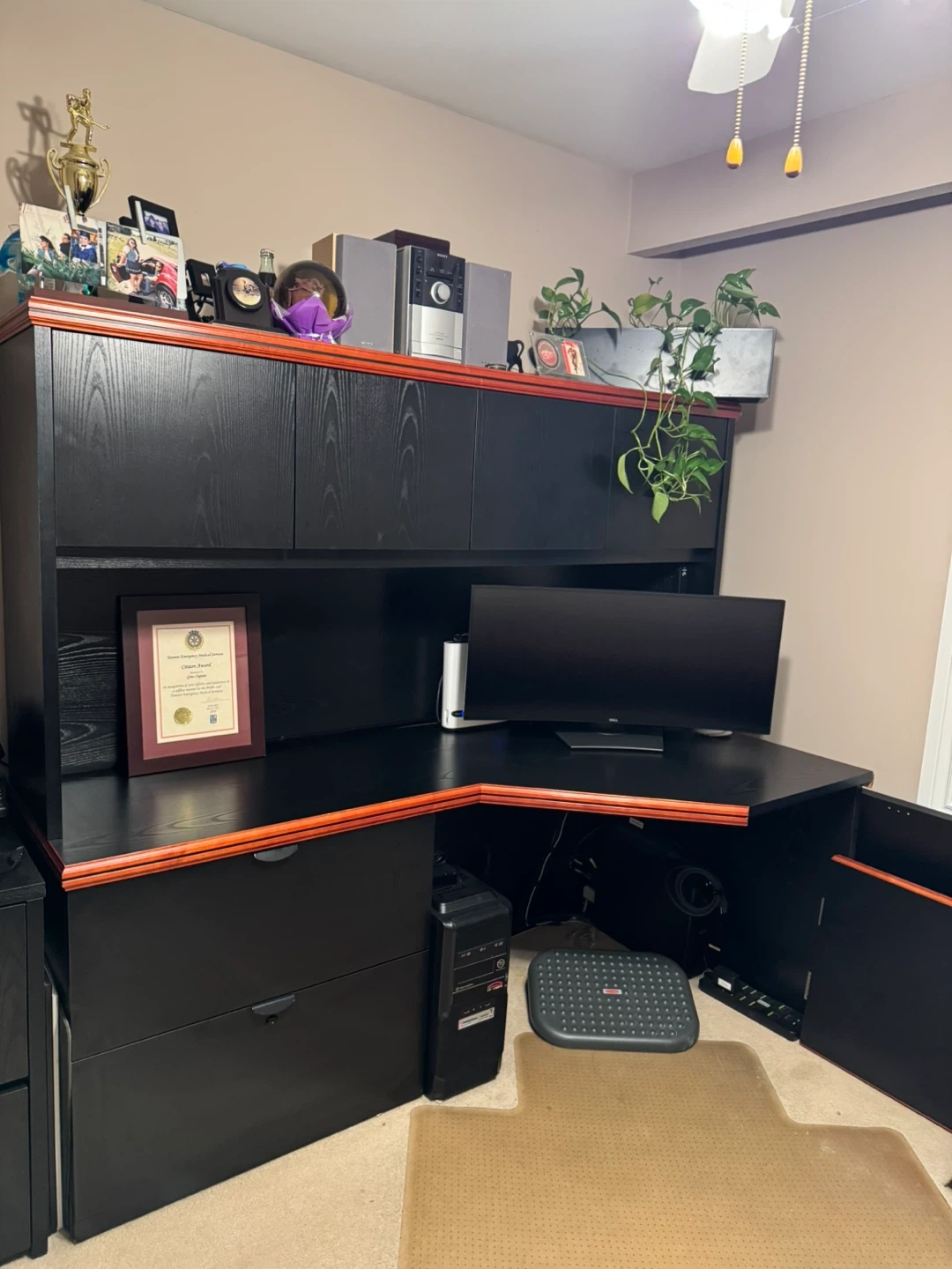 Selling a black office desk with a hutch. It's in very good condition and has plenty of storage space. Perfect for a home office or study area
