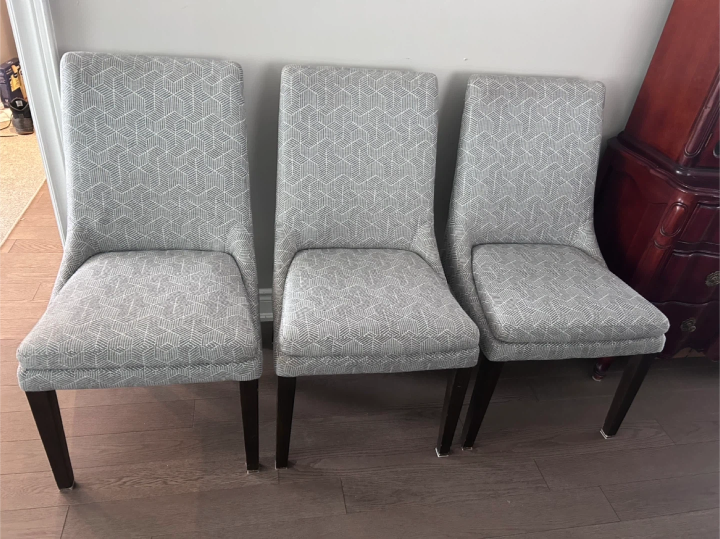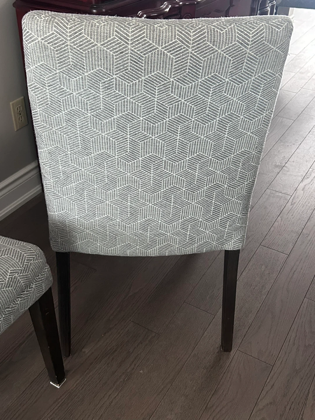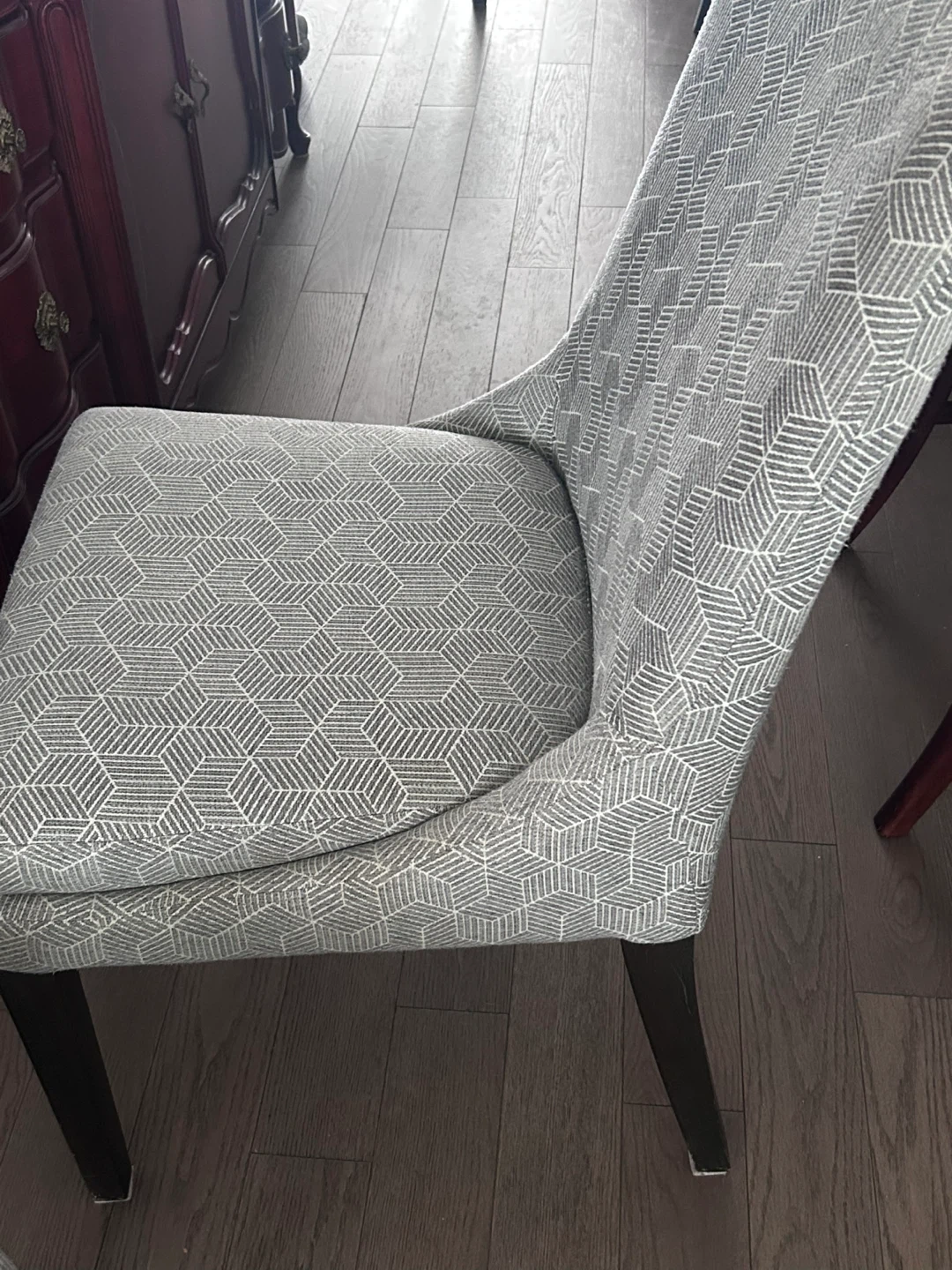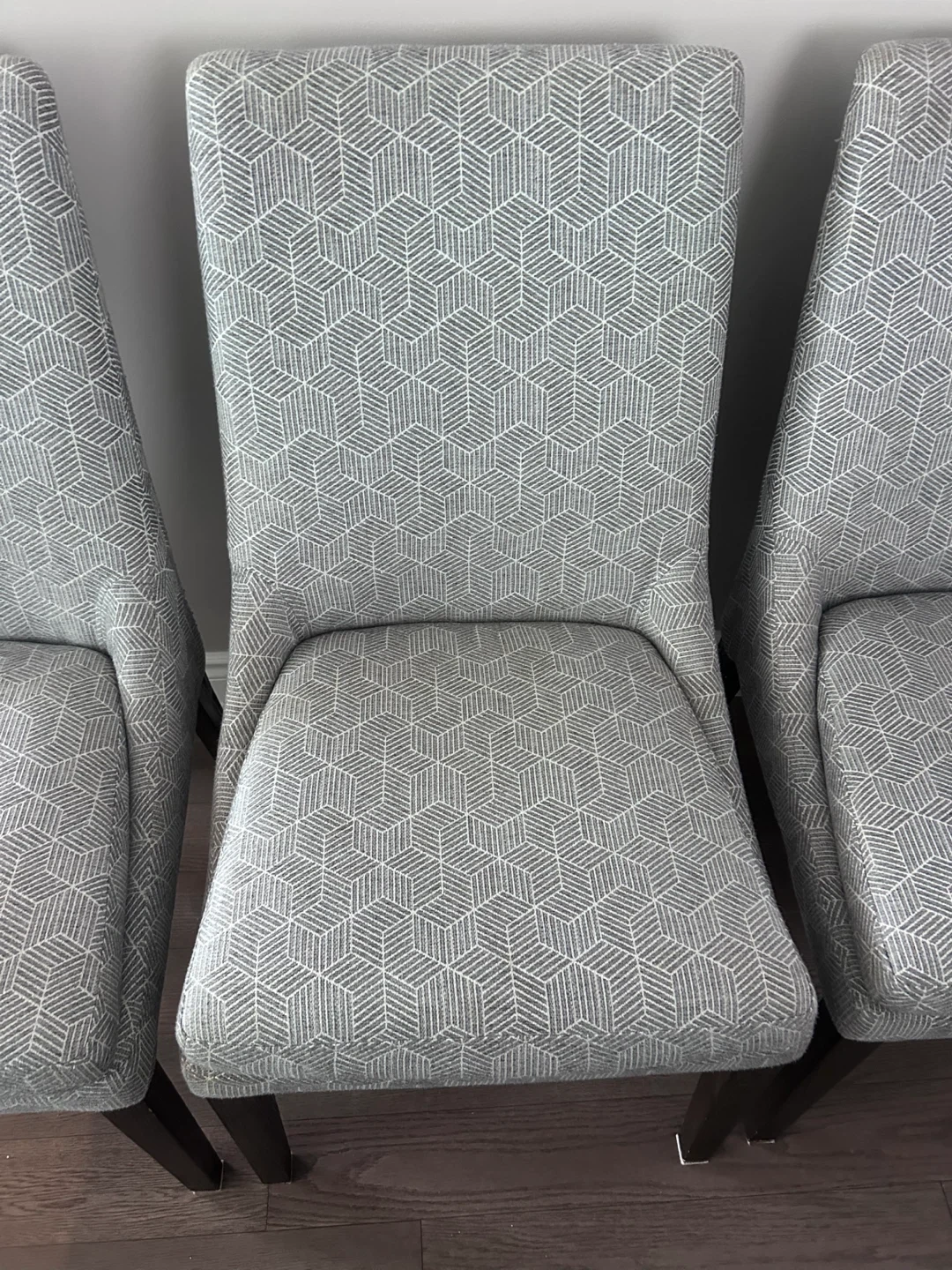 6 very nice dining chairs upholstered in a grey geometric fabric. Chairs have dark wood legs. They're comfortable and stylish for any dining room. They were professionally cleaned before posting, although they have been well kept and are in very good condition.