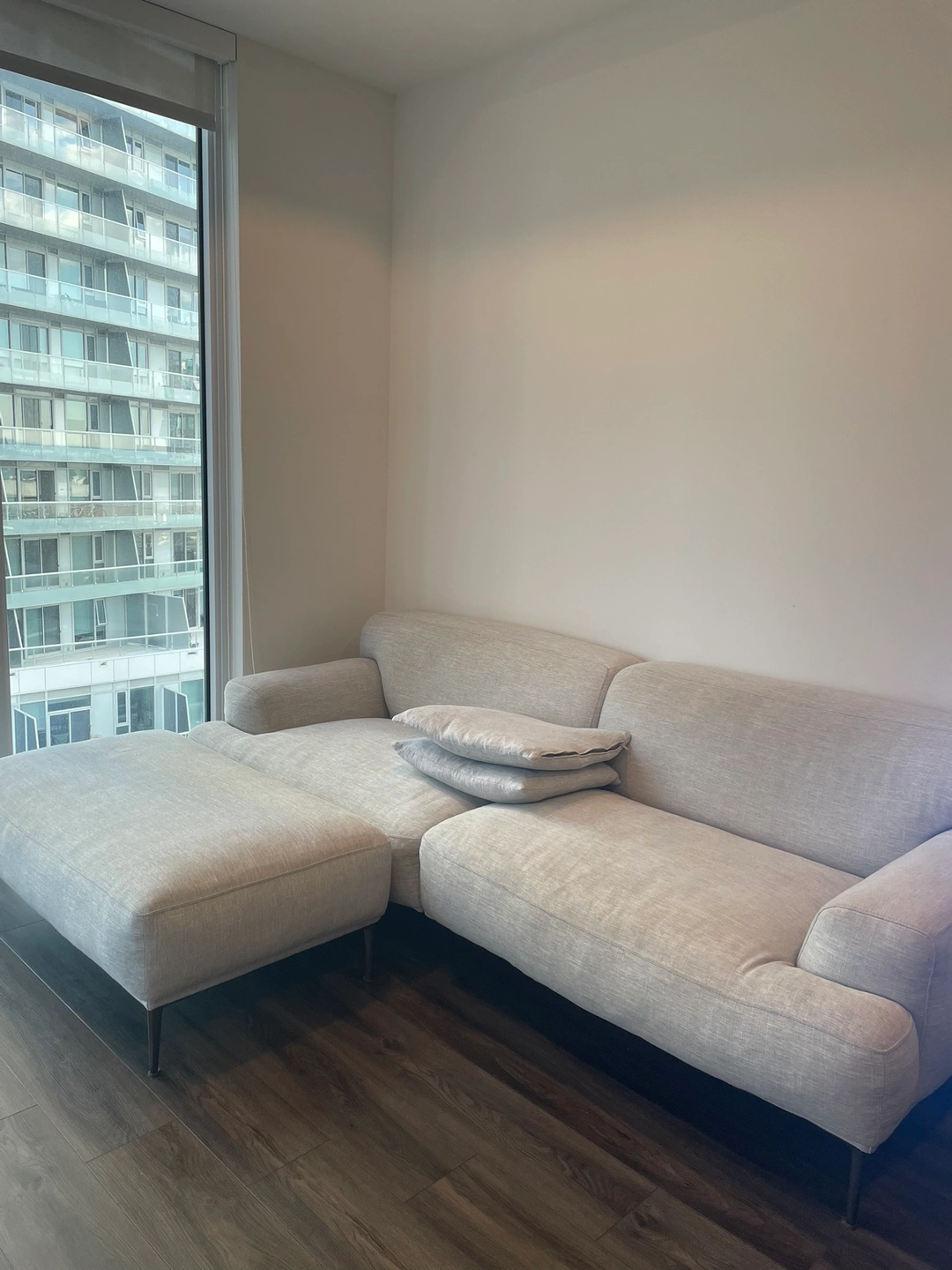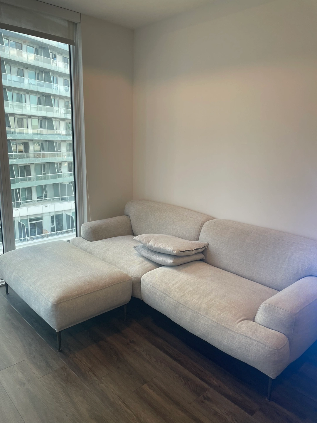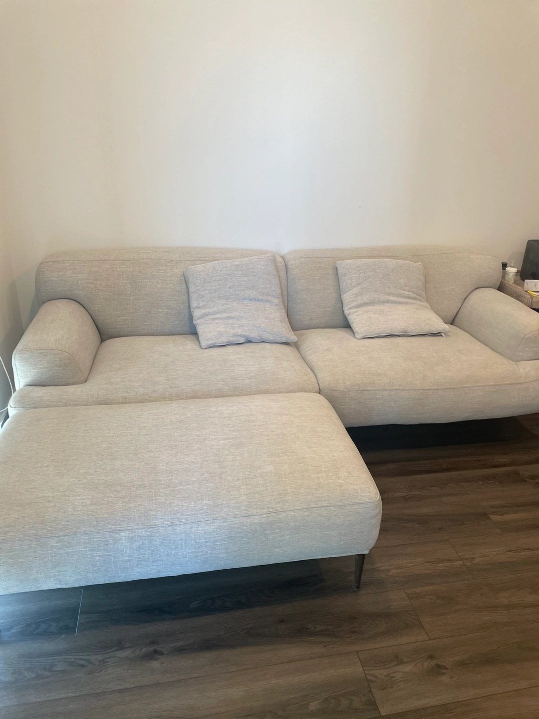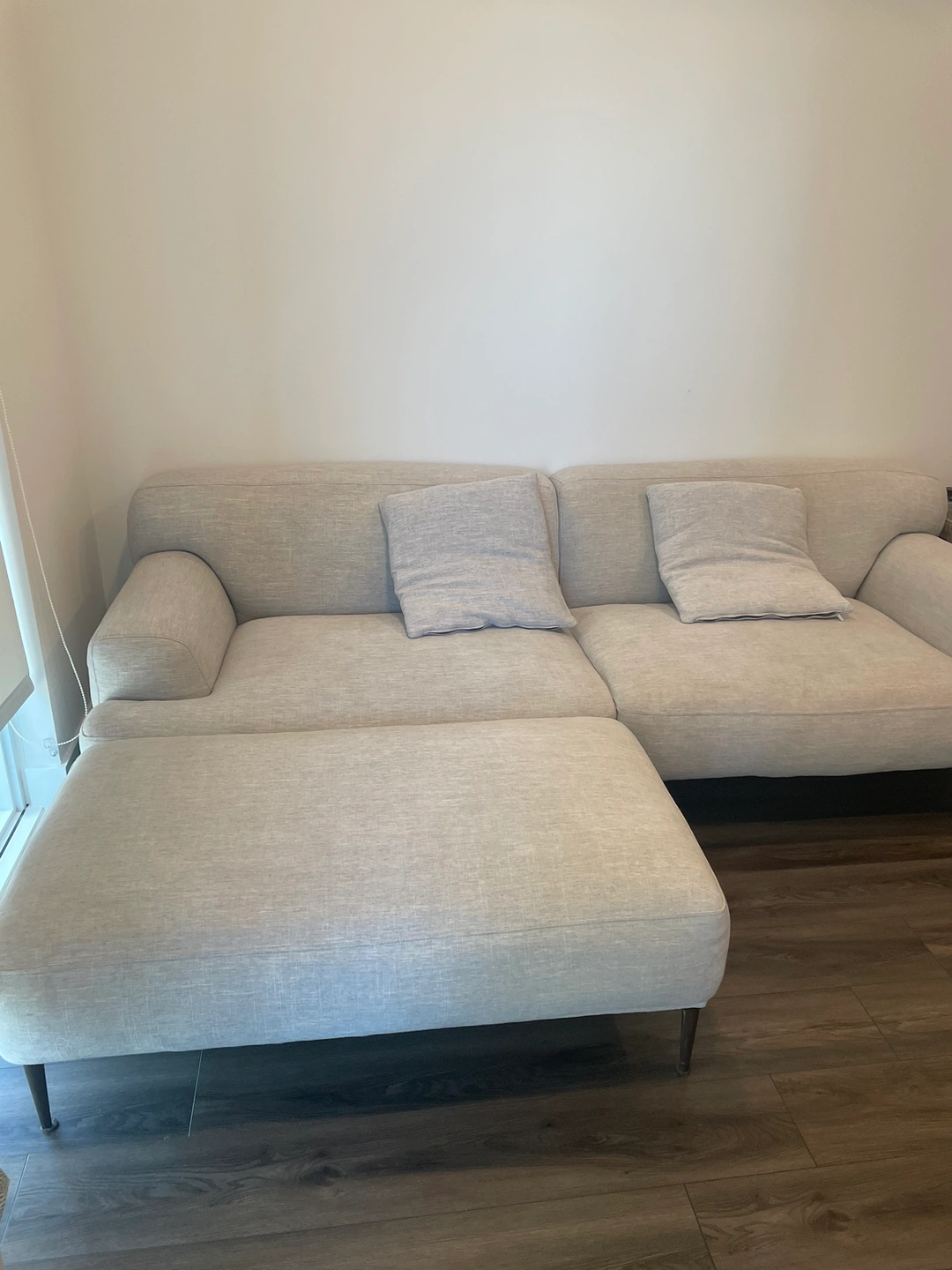 This is a sectional sofa with an ottoman and 2 pillows. The condition is very good. We bought it 1.5 years ago. Selling it just because we are looking for a sofa that transforms into a bed.