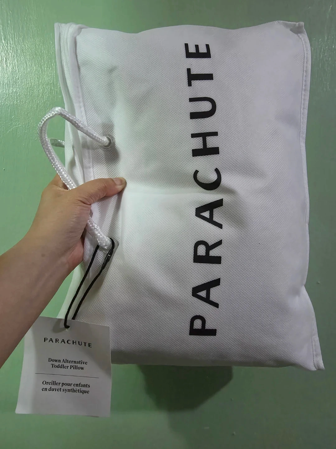 This is a Parachute Down Alternative Toddler Pillow. It's filled with a hypoallergenic microfiber fill and has a 100% cotton sateen shell. The pillow measures 12" x 18".