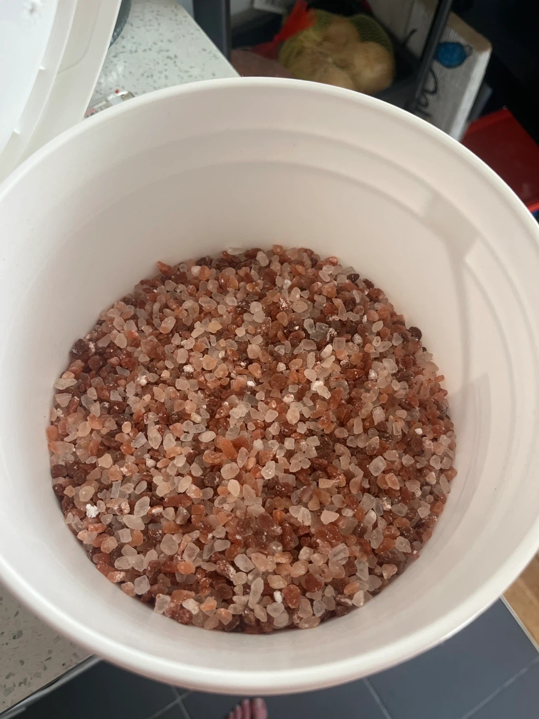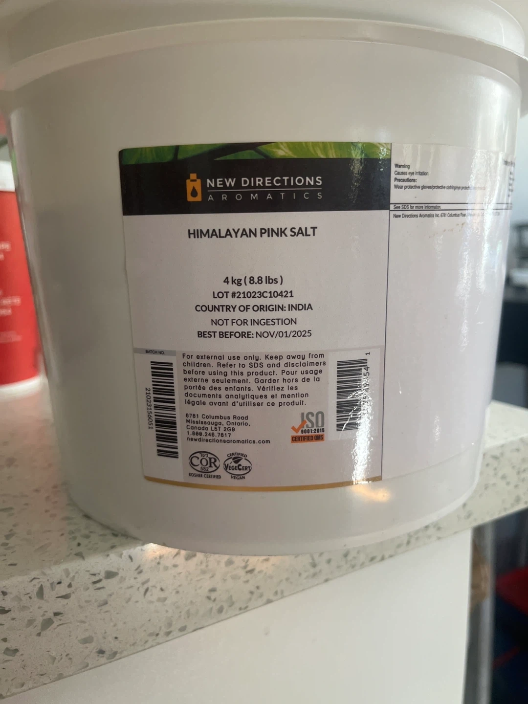 Selling a 4kg bucket of Himalayan Pink Salt from New Directions Aromatics! It's perfect for bath, body scrubs, and foot soaks. This salt offers over 80 minerals for skin radiance and relaxation. Bucket is 3/4 full.