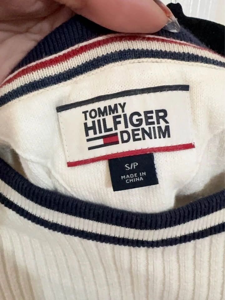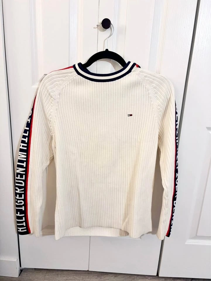 Stylish Tommy Hilfiger Denim ribbed long-sleeve sweater. It has a crisp white color with a navy and white striped crew neck collar. Features a small Tommy Hilfiger flag logo on the chest. The sleeves have a cool red and navy stripe with 'HILFIGER DENIM' text. Size is Small (S/P).