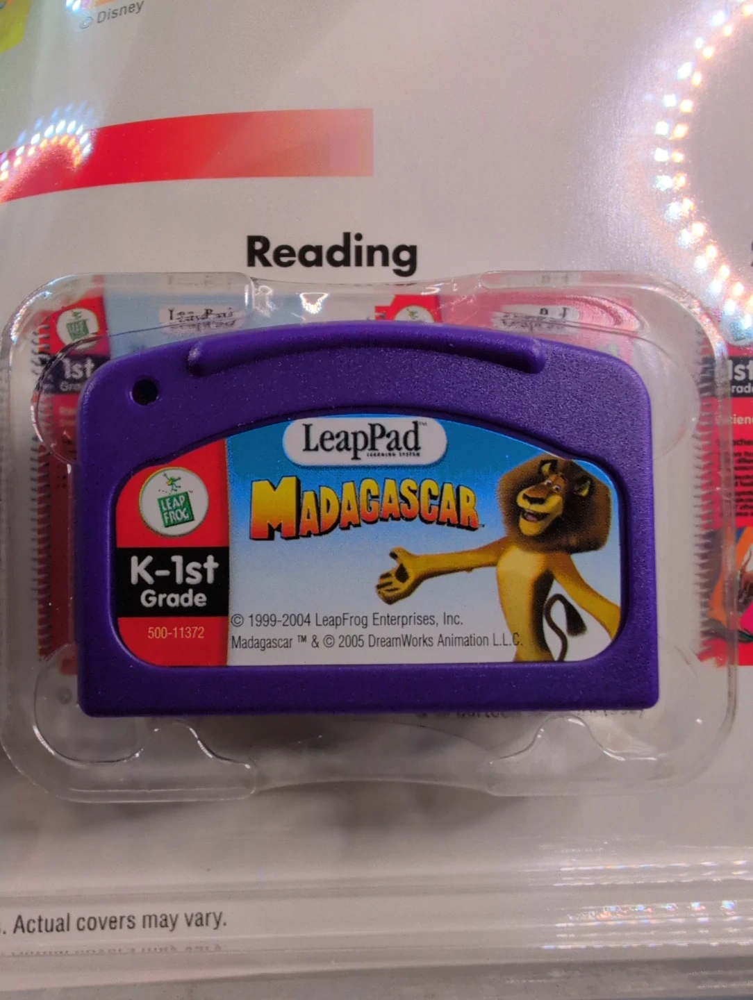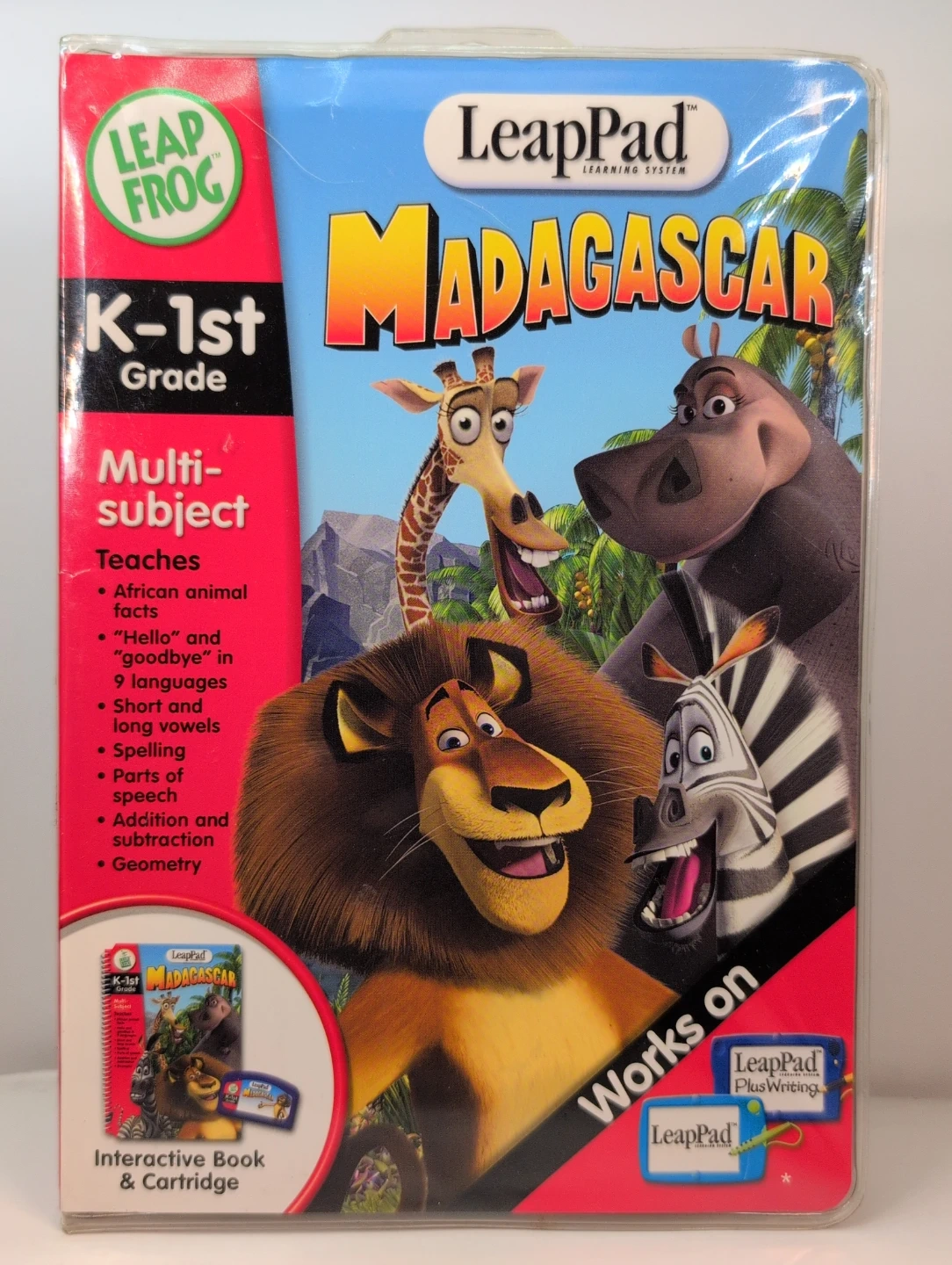 This LeapPad interactive book and cartridge features the Madagascar characters. It teaches African animal facts, "hello" and "goodbye" in 9 languages, short and long vowels, spelling, parts of speech, addition, subtraction, and geometry. Recommended for ages 4-8.