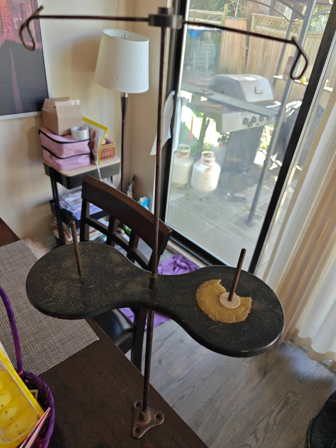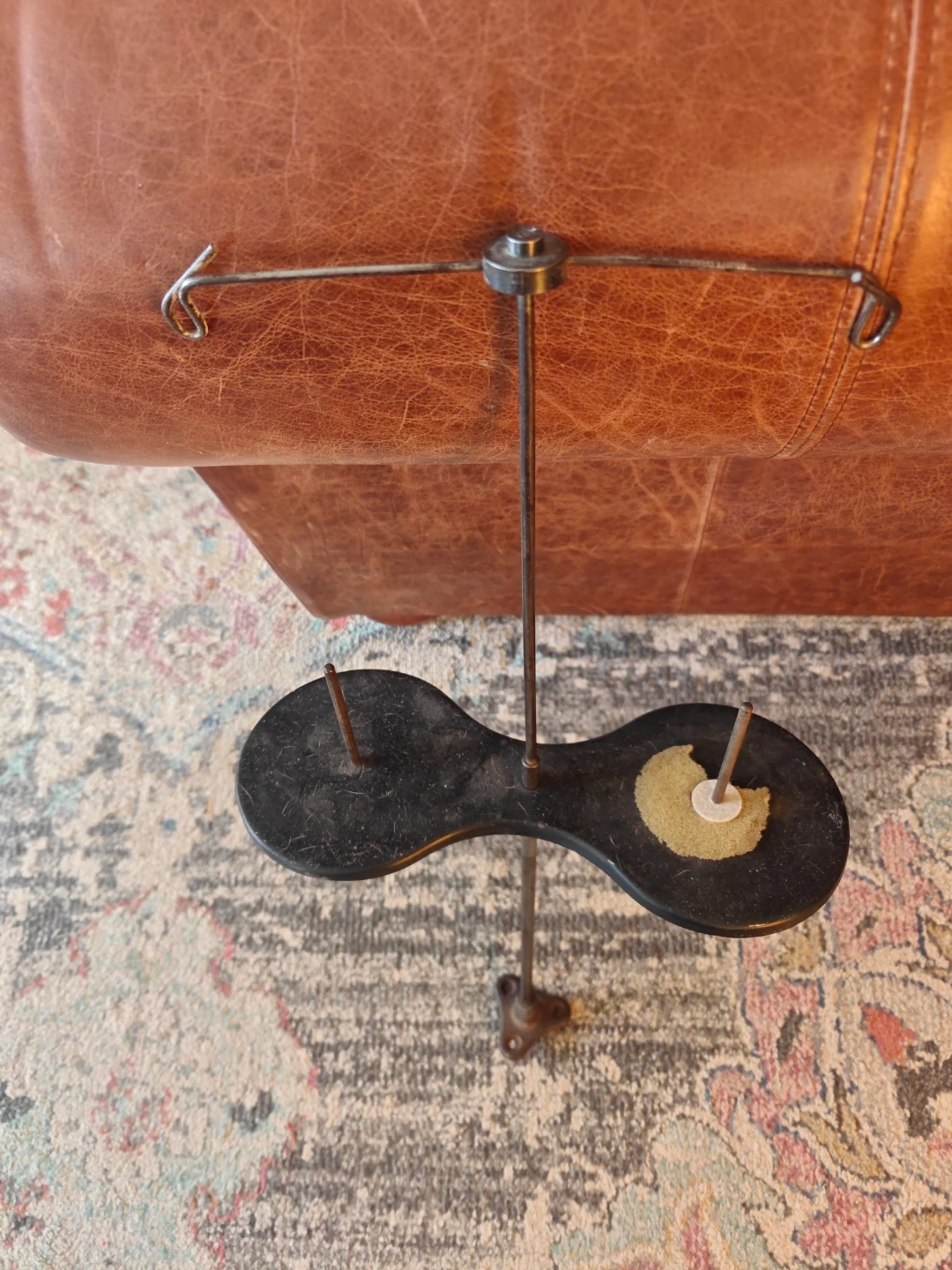 This is a vintage caddy tray designed to attach to the side of a chair or sofa. It features a metal stand with a double-tiered black tray. The tray has two prongs, one of which holds a small sander pad. The frame includes hooks for attaching to furniture. It's perfect for keeping small items like remote controls or knitting supplies handy!