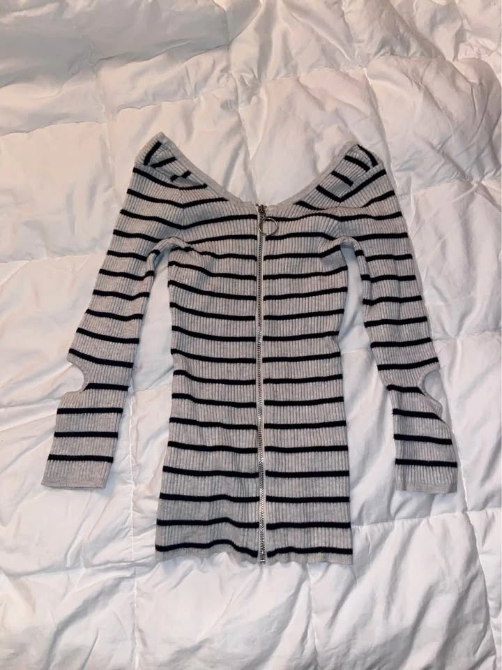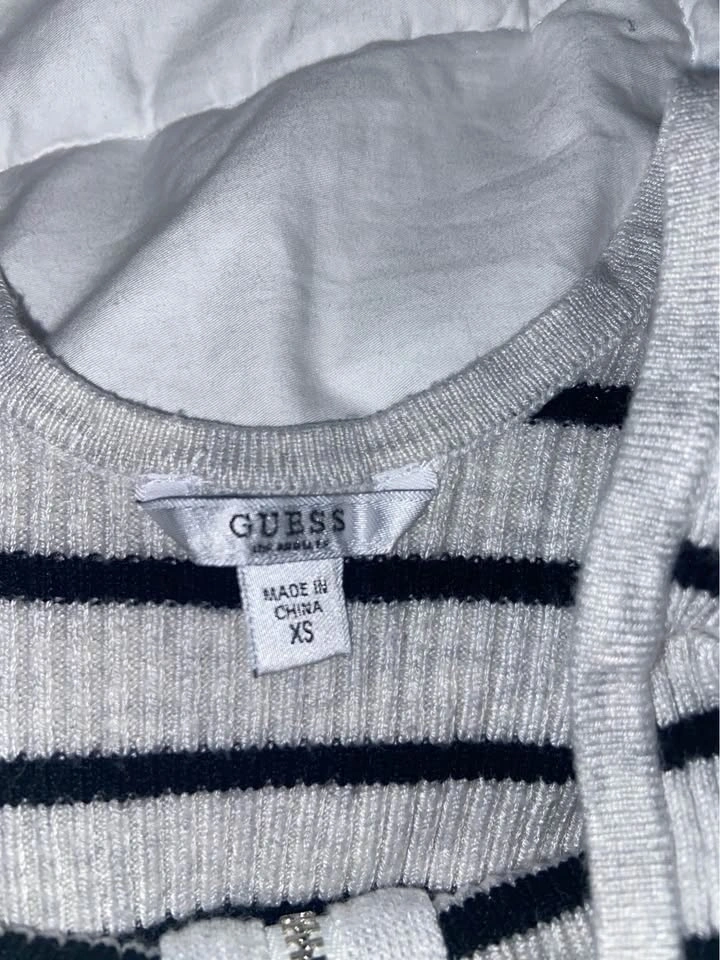 Stylish Guess ribbed knit top in size XS. The material is quite stretchy and could likely also fit a size S. Features grey and black stripes, a full zipper front, and cool cut-out details on the sleeves. It has a wider neckline and is super comfy.