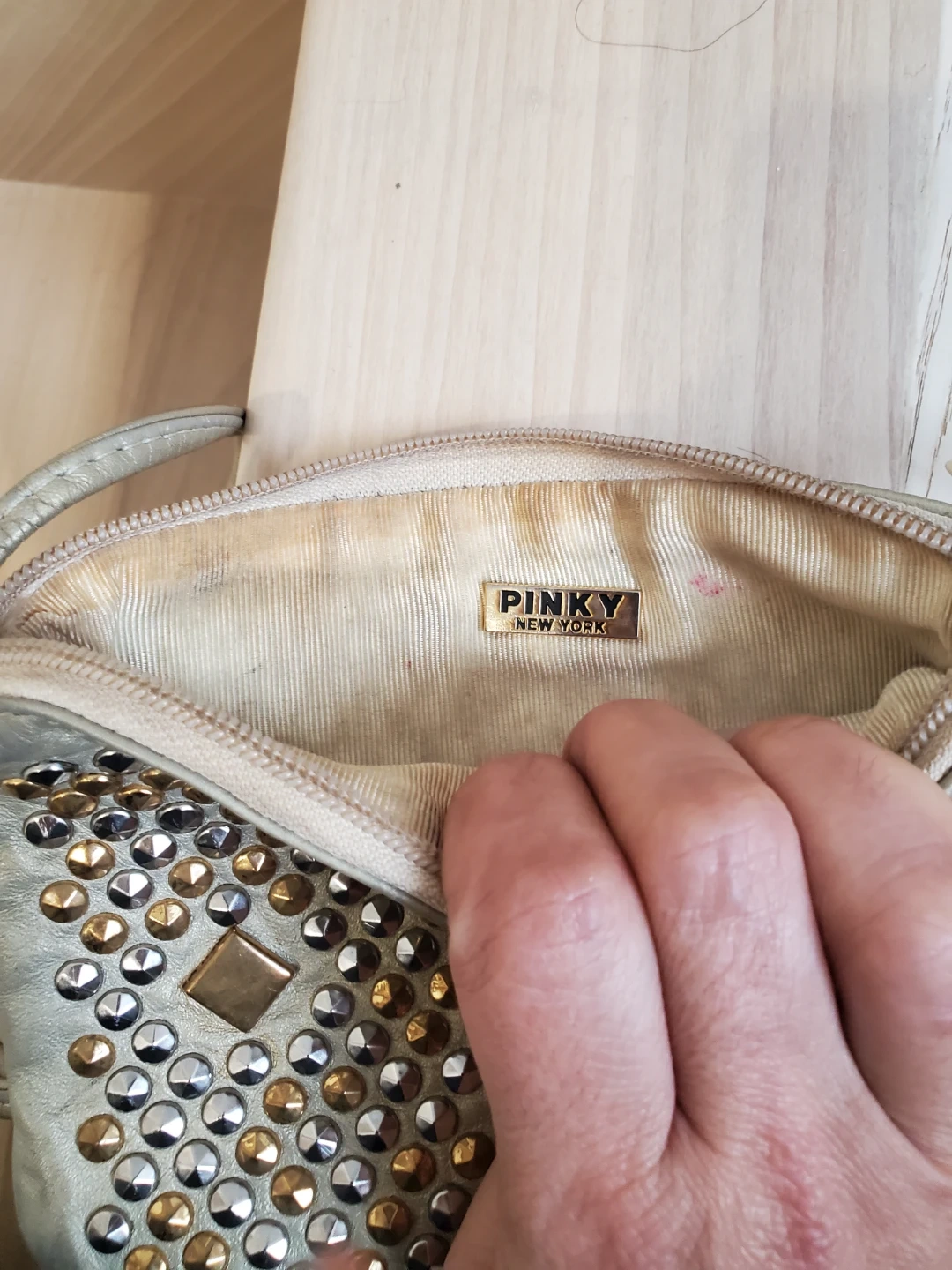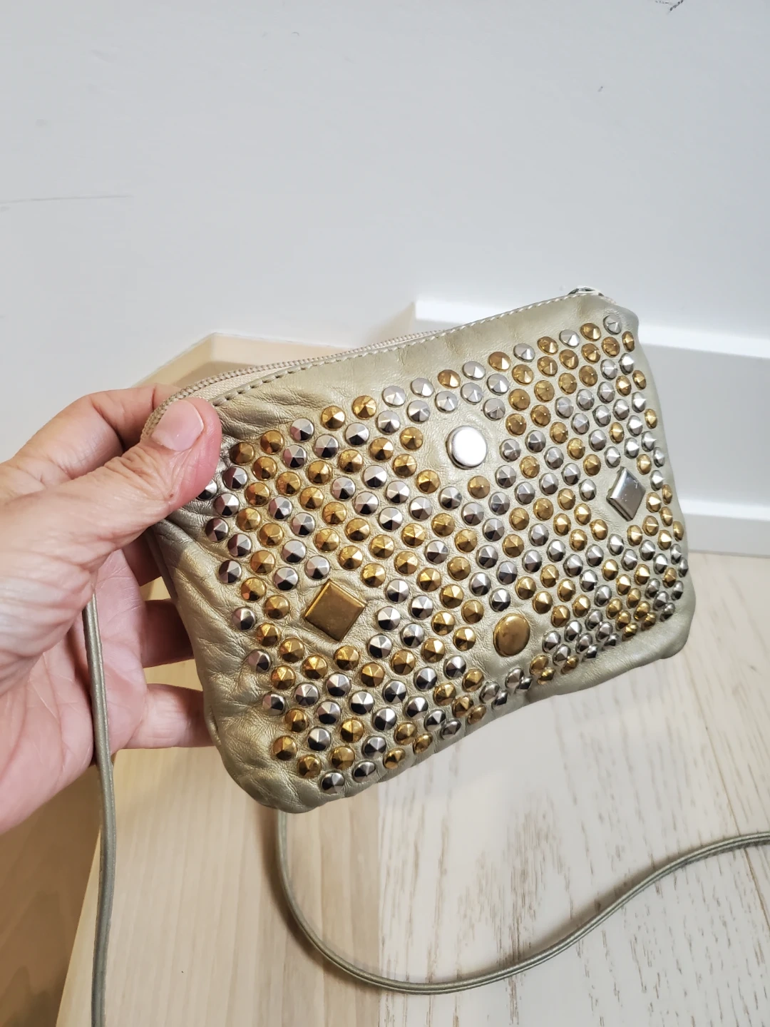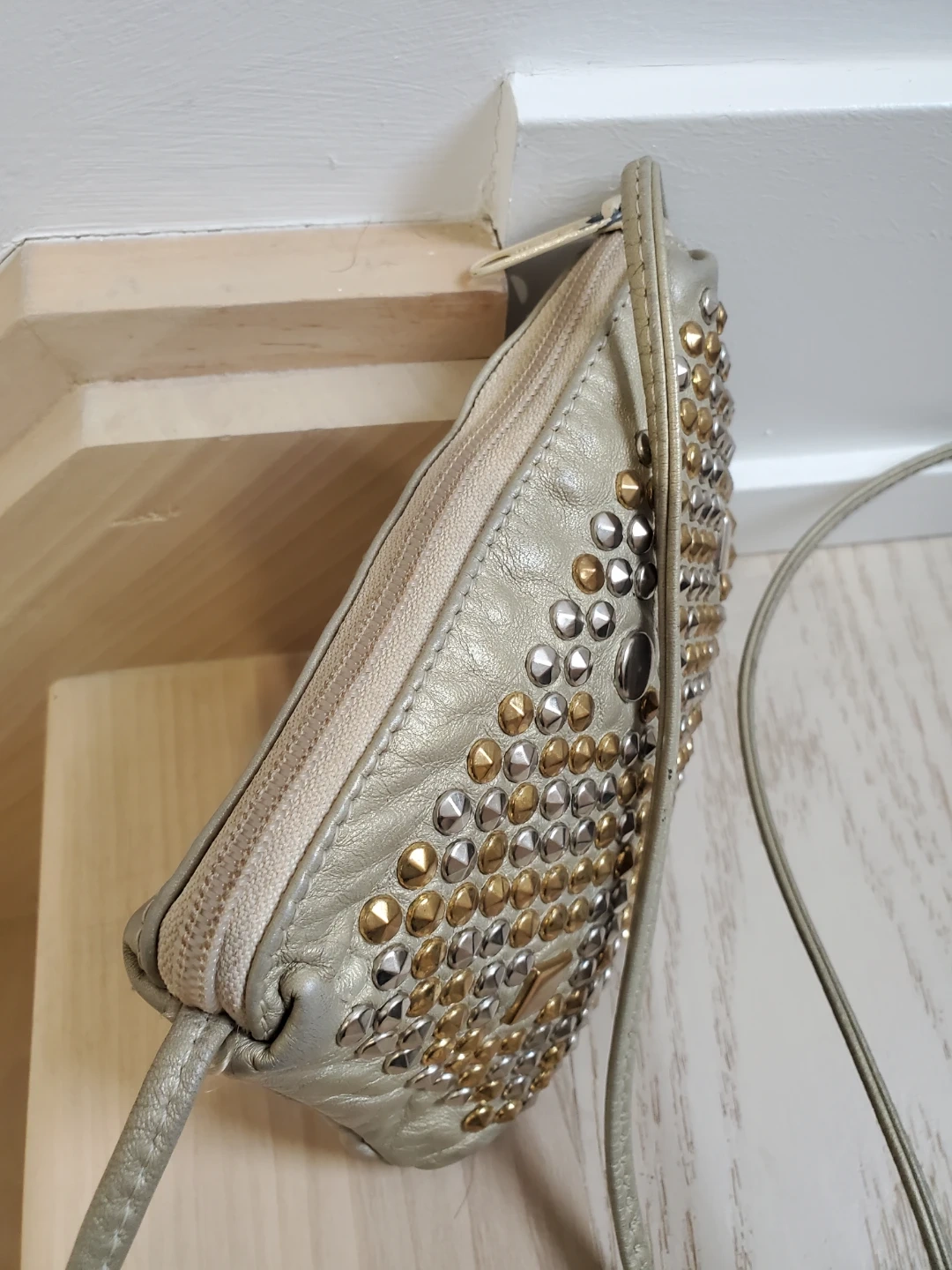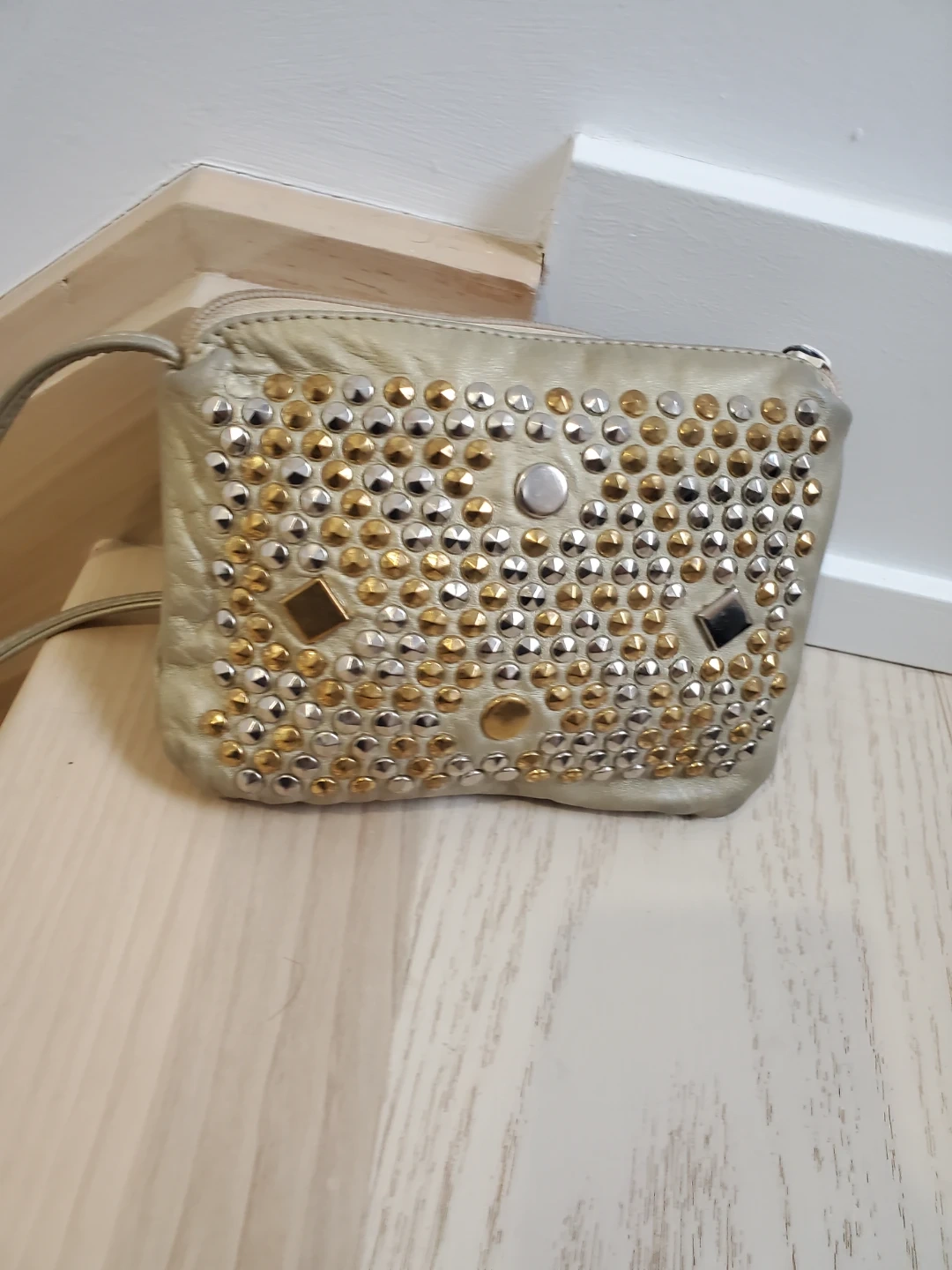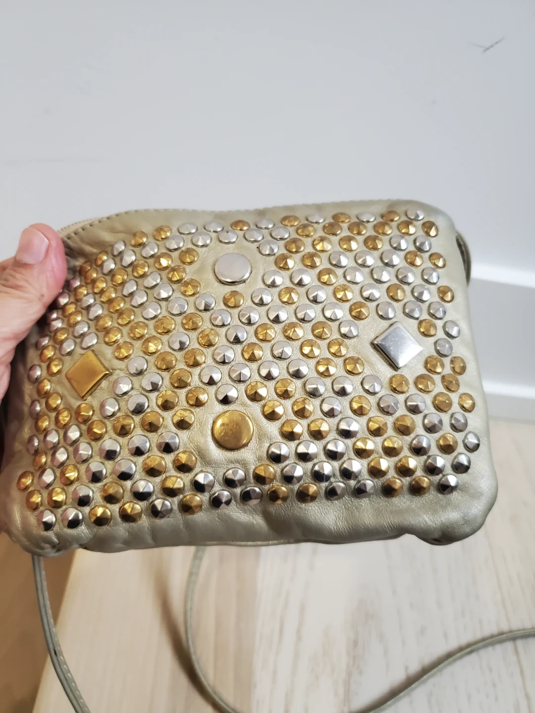 A cute leathers metallic gold crossbody bag with silver and gold studs. It's in great condition, fairly clean in the inside, and ready for a new owner!