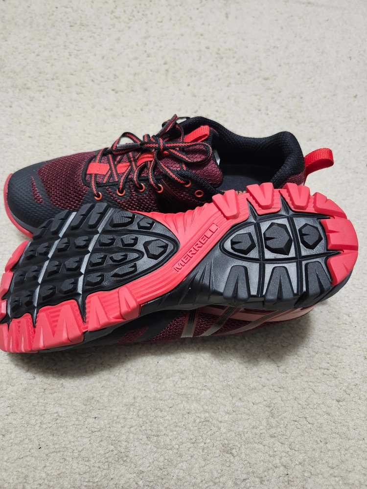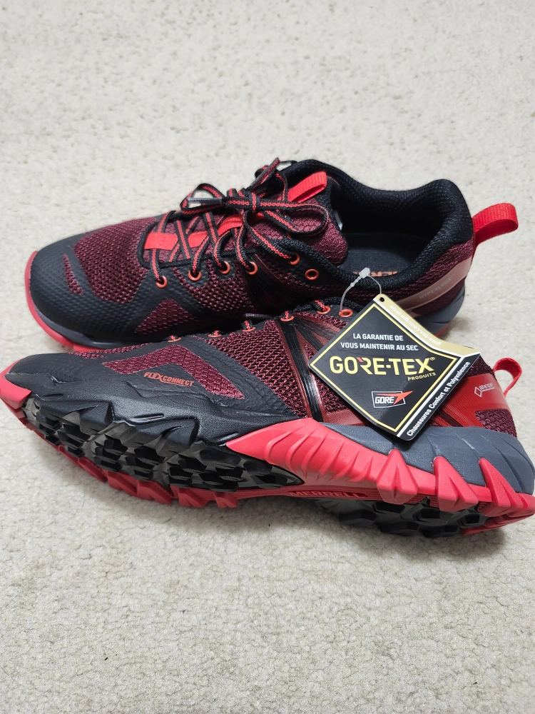 These Merrell trail running shoes are red and black. They feature Gore-Tex for waterproof protection and have a durable sole with good grip. The FlexConnect technology offers enhanced stability and natural foot movement.