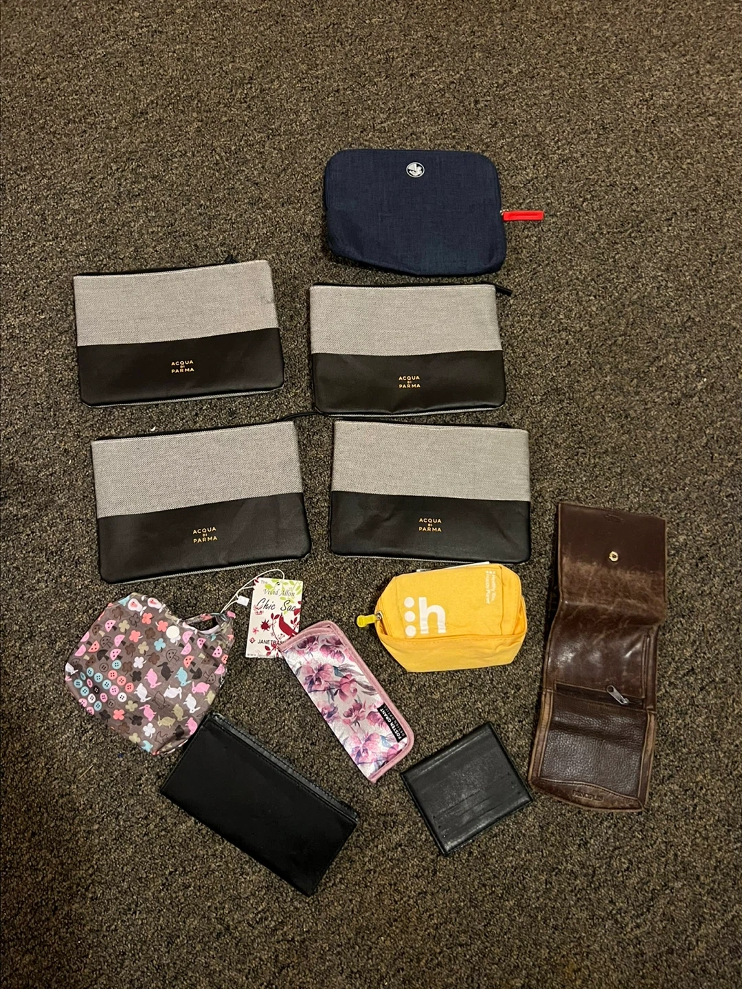 This lot includes four Acqua di Parma pouches, a blue denim pouch, a brown leather wallet, a floral pencil case, a patterned small bag, a yellow pouch, and a black wallet. Various sizes and materials are present.$2 each or all for $20