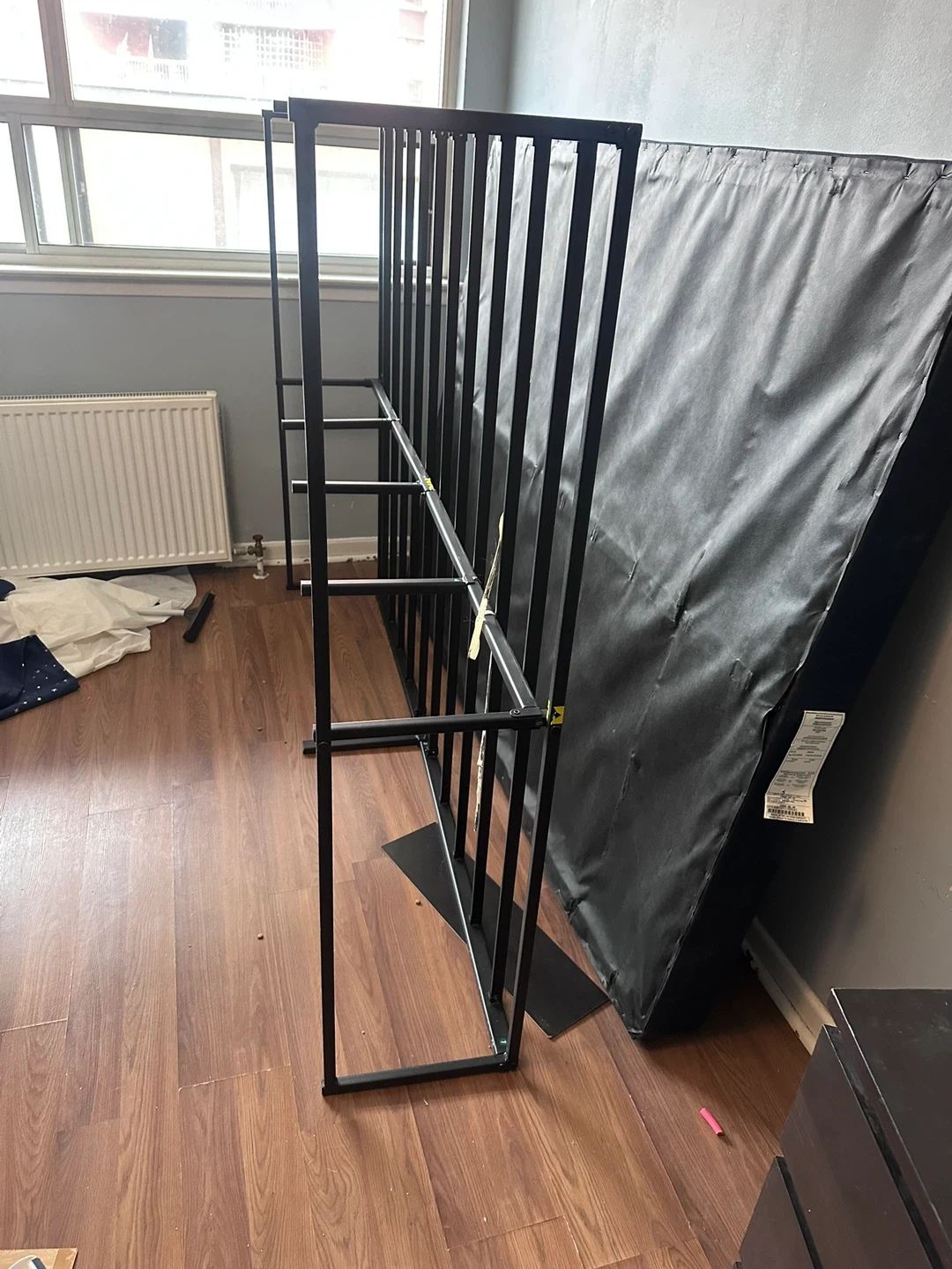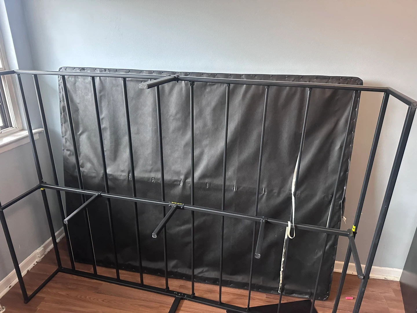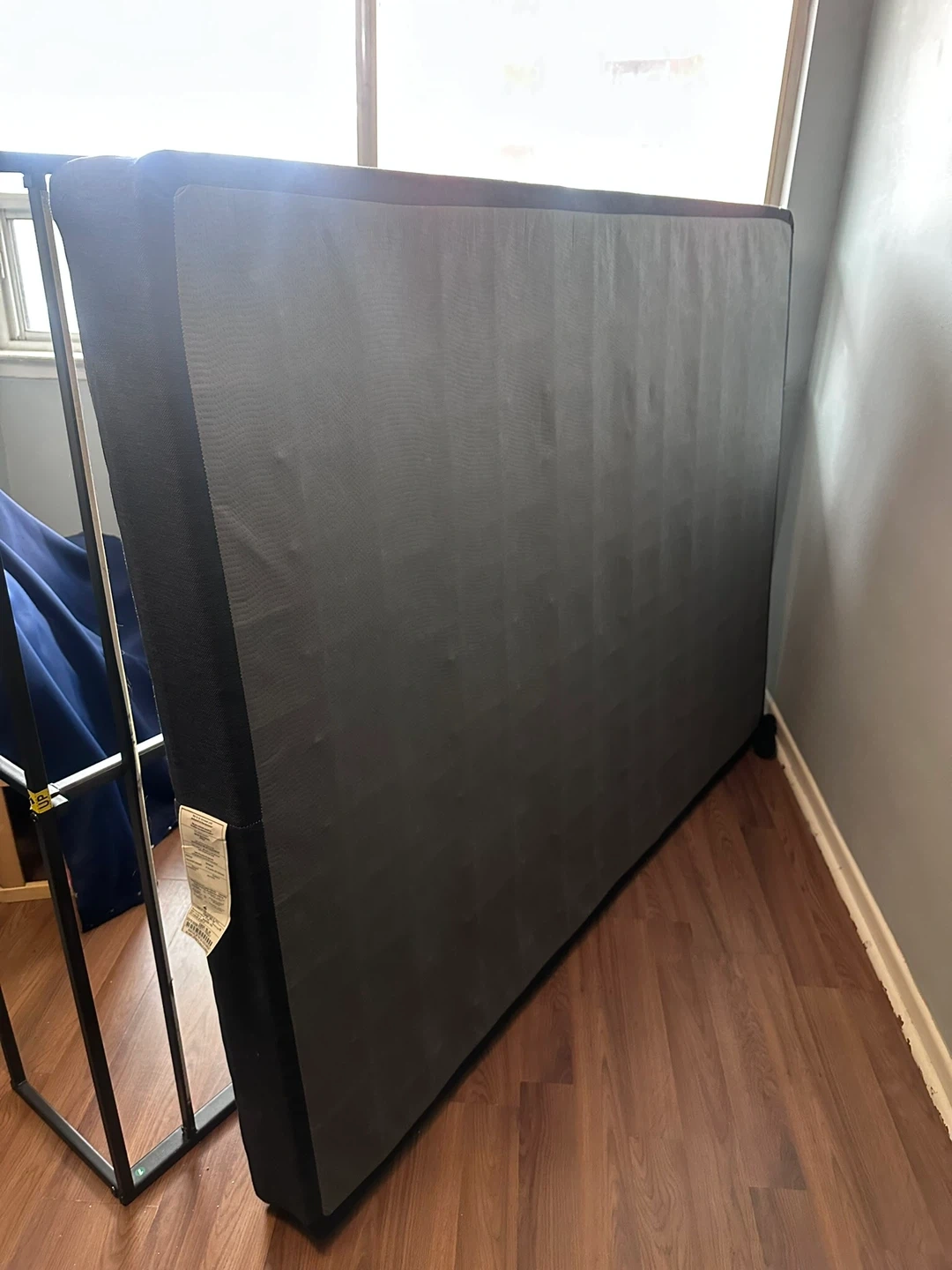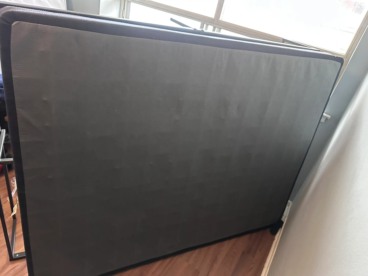 This queen bed frame is in used condition and ready for a new home! It features a sturdy metal construction. The frame is easy to assemble and disassemble, making it perfect for moving. This bed frame has been well-cared for and is in good condition, ready to support many restful nights. If the ad is still up, it's still available; let's not play hide and seek!