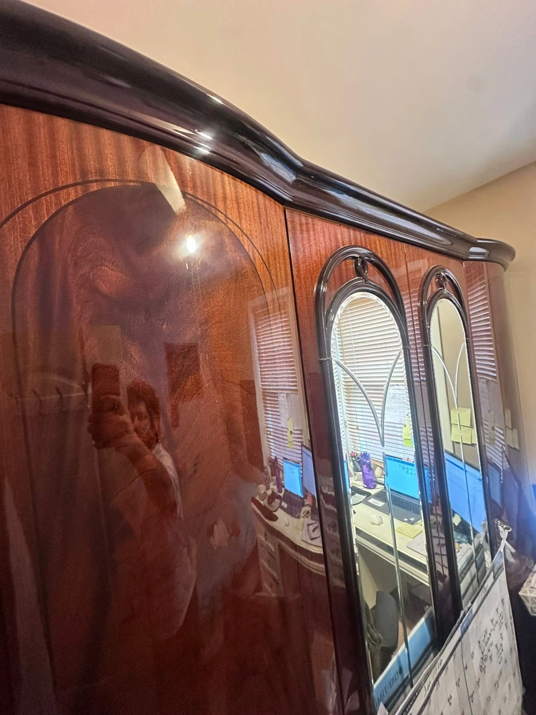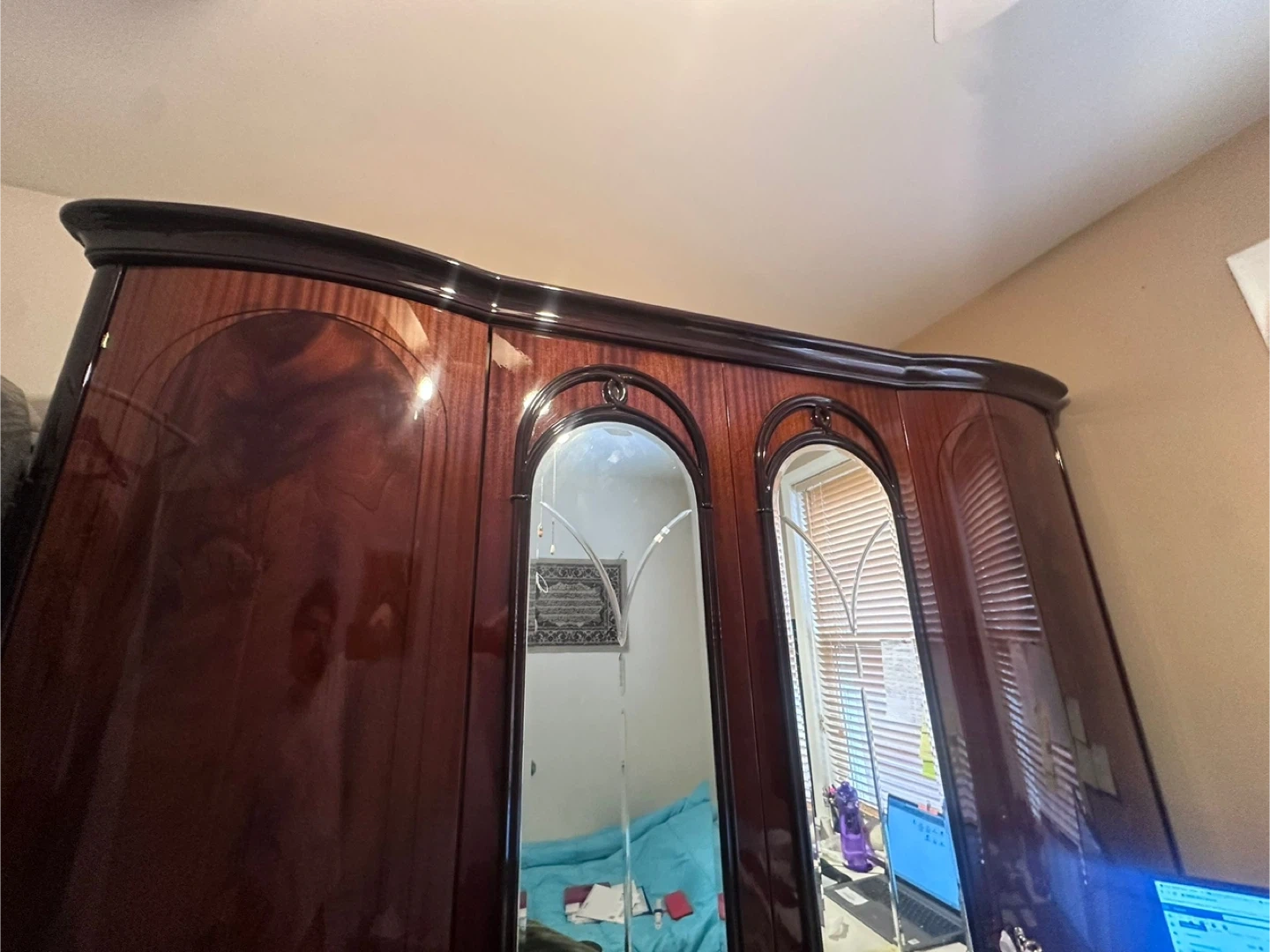 A beautiful dark wood armoire with mirrored doors. It's a spacious piece with shelving and hanging space. This armoire would be excellent for storing clothes and accessories. Very well built great closet had it for 20 years not one issue