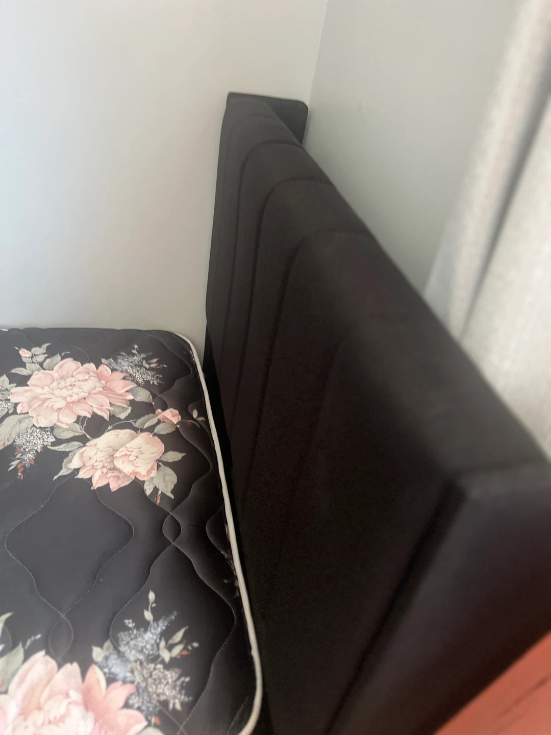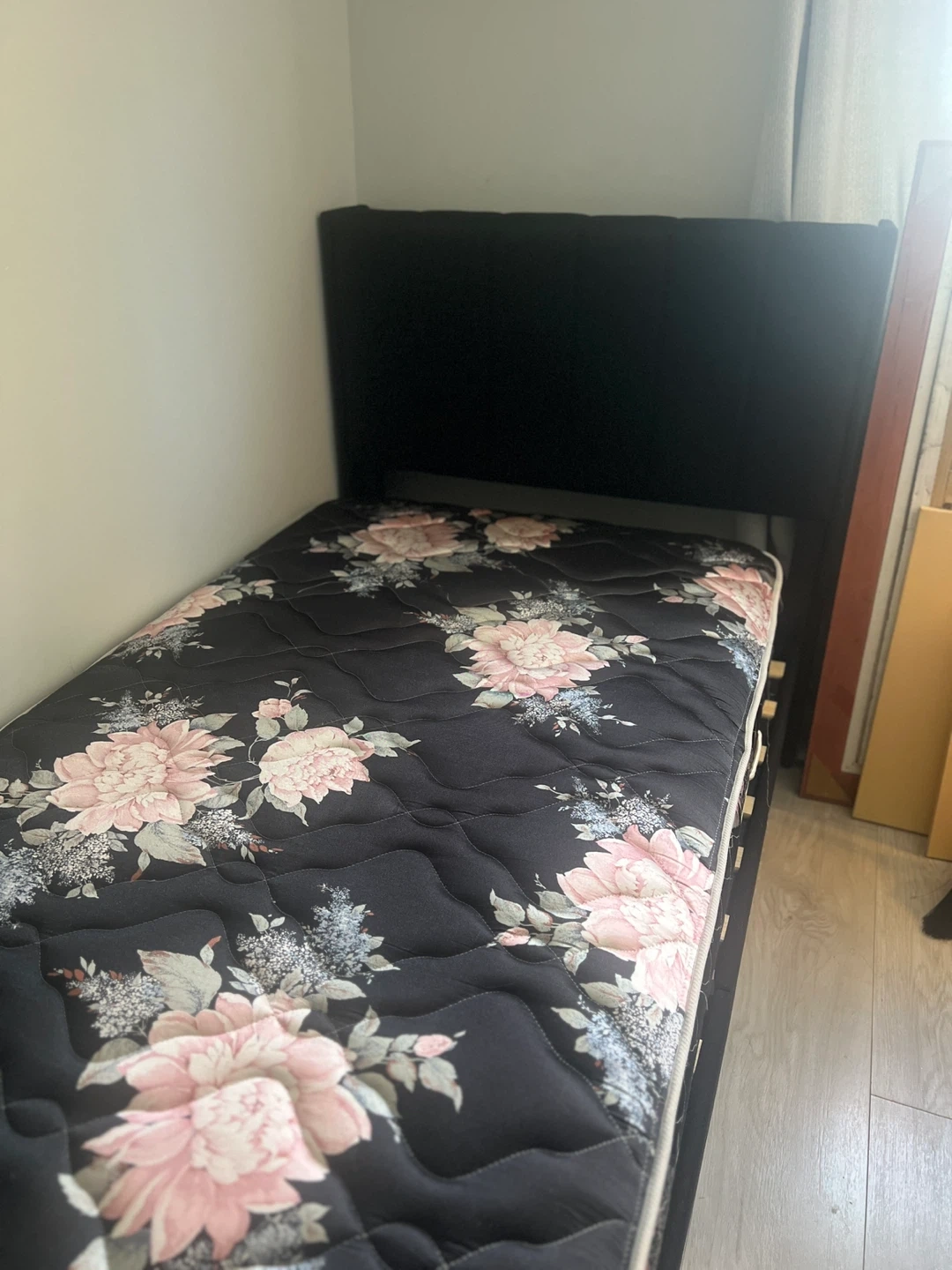 This is a twin size platform bed frame and mattress upholstered in black linen. It features wooden slats for support and a headboard. It's easy to assemble and designed for no noise.