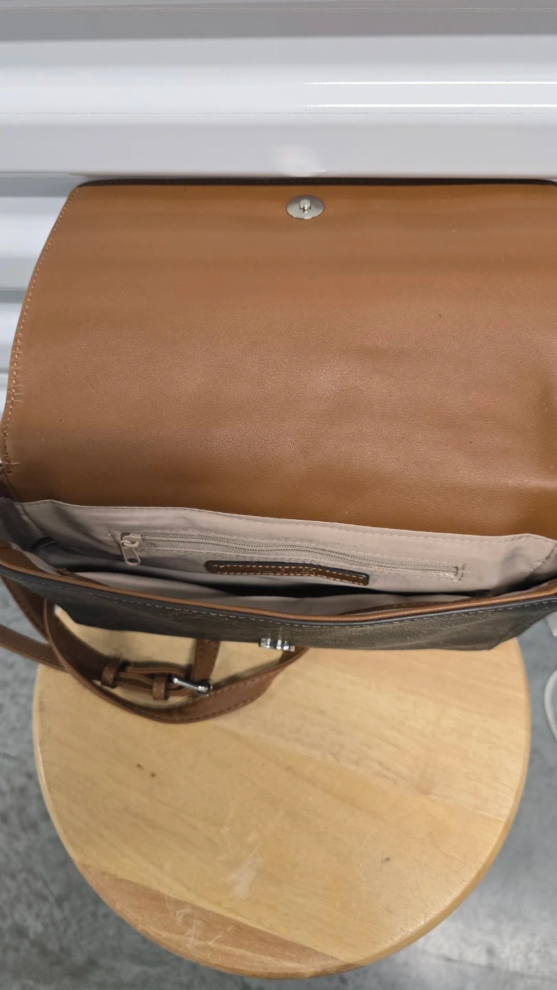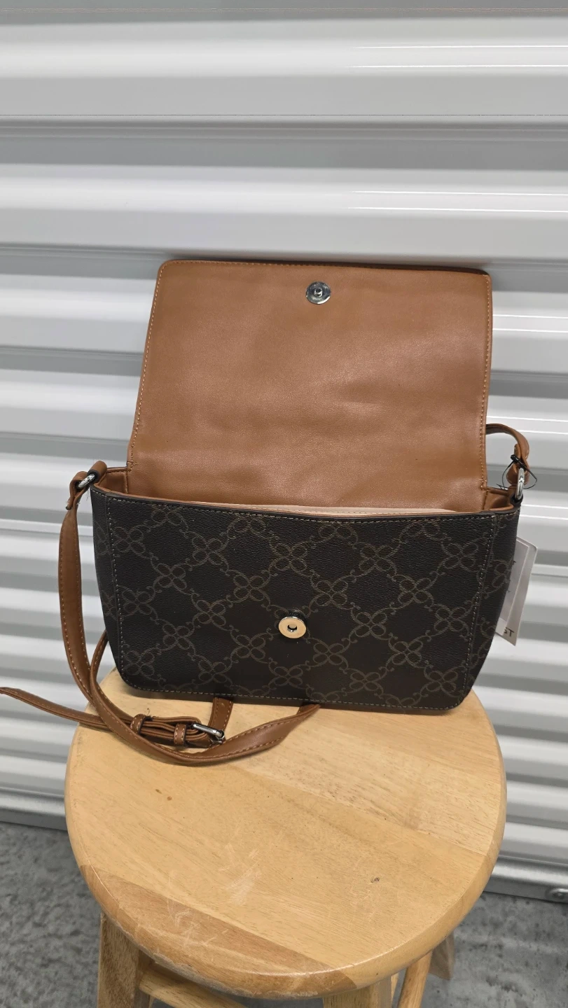 This is a Nine West crossbody bag with a brown and tan pattern. It has an adjustable shoulder strap and a magnetic snap closure. The interior is lined with a brown fabric and has a zippered pocket