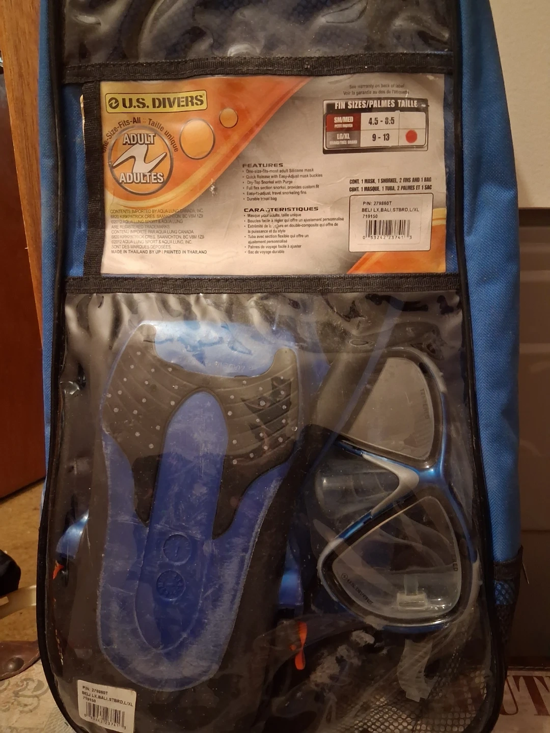 This U.S. Divers adult snorkel set includes a one-size-fits-most silicone mask, dry-top snorkel with purge, and travel fins. It also comes with a durable travel bag for easy transport. The fins are size LG/XL (9-13).