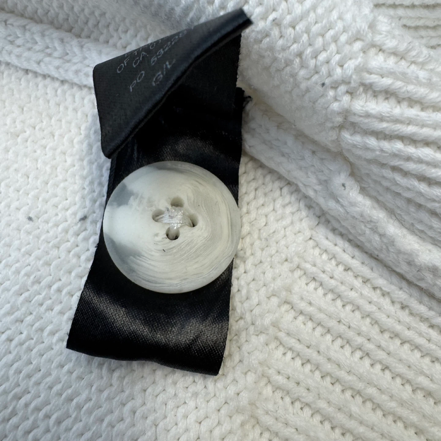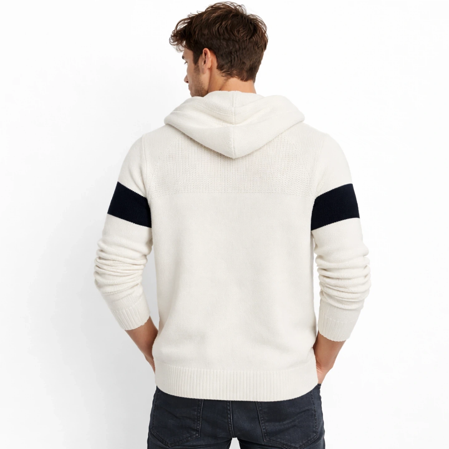 Men’s knit cardigan sweater in cream/ivory color with hood and button-front closure.