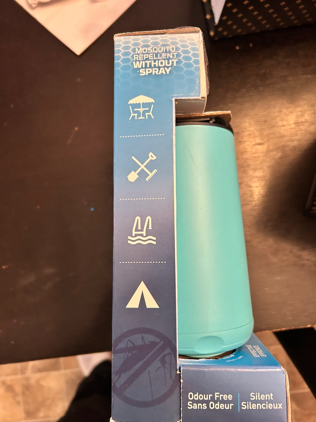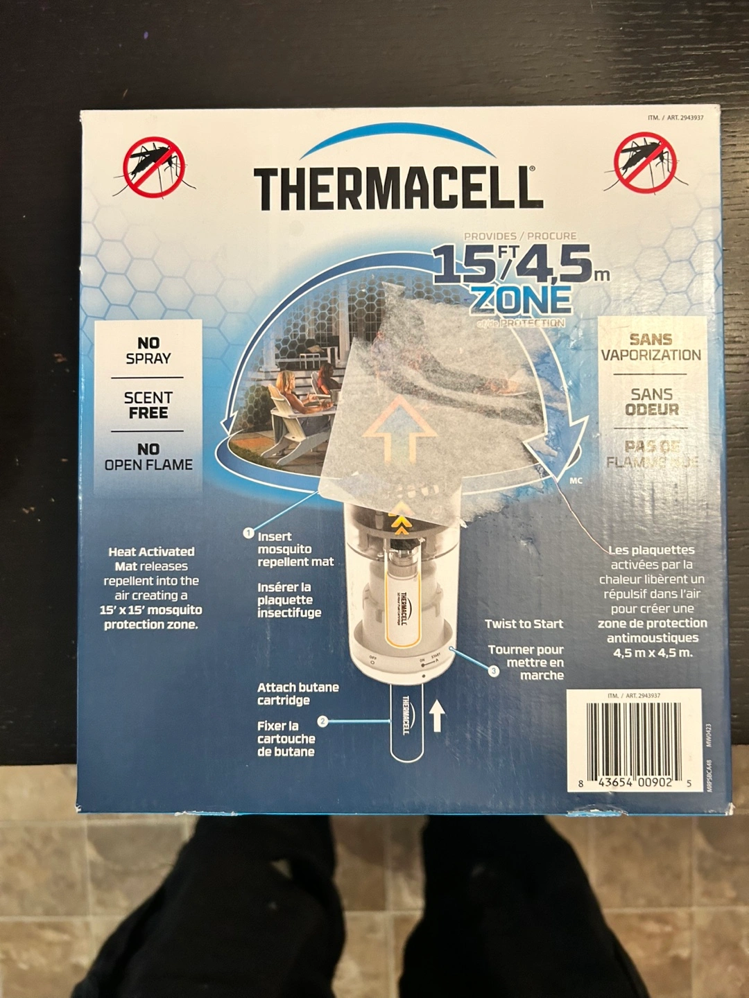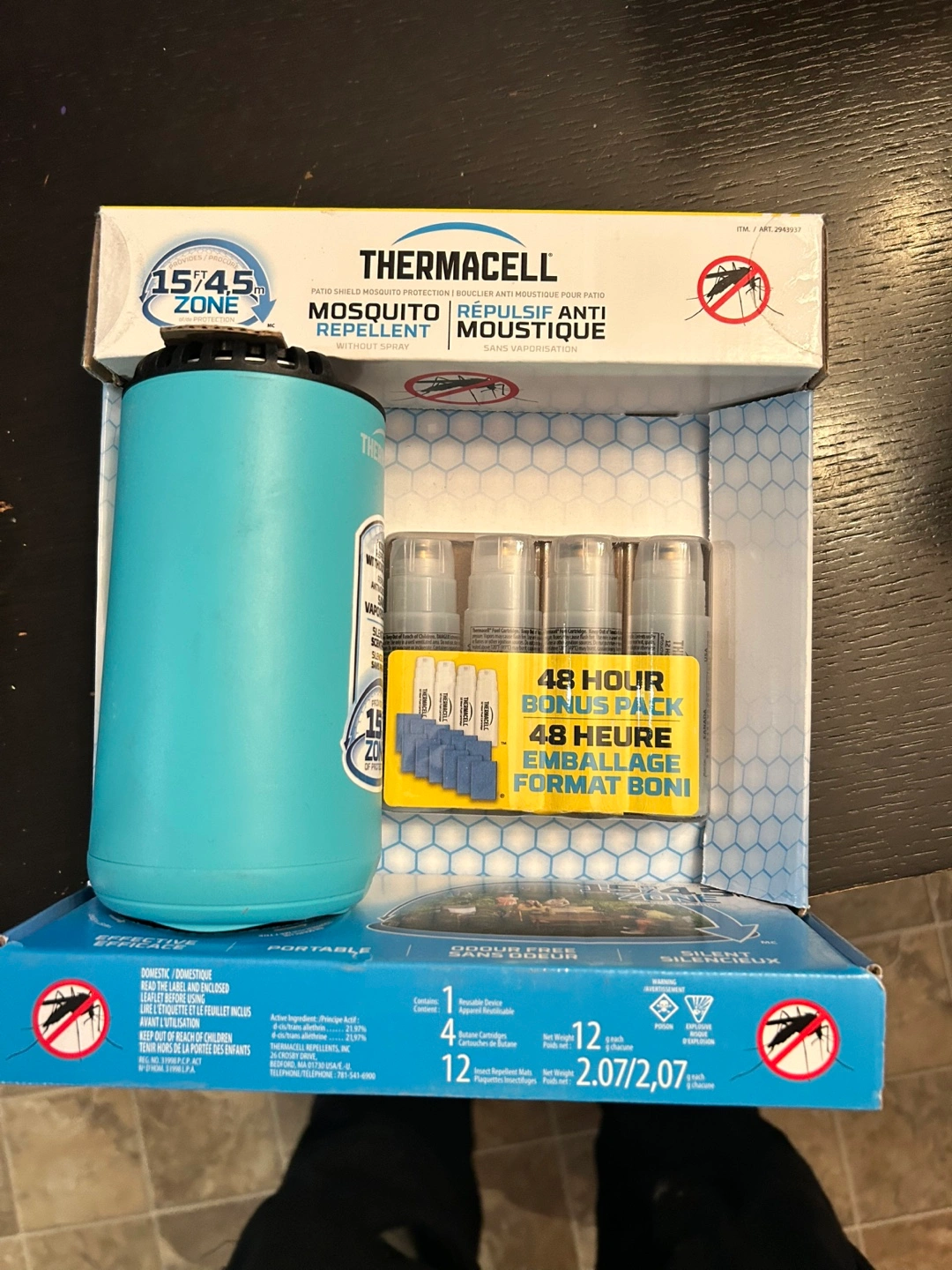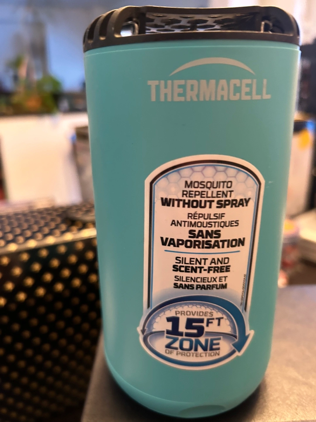 Portable mosquito repellent device. Includes bonus 48-hour refill mats. Scent-free and silent operation. Creates a 15-foot zone of protection. Great for camping, patios, or other outdoor activities.