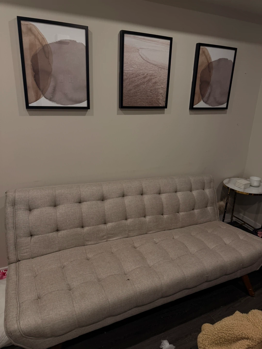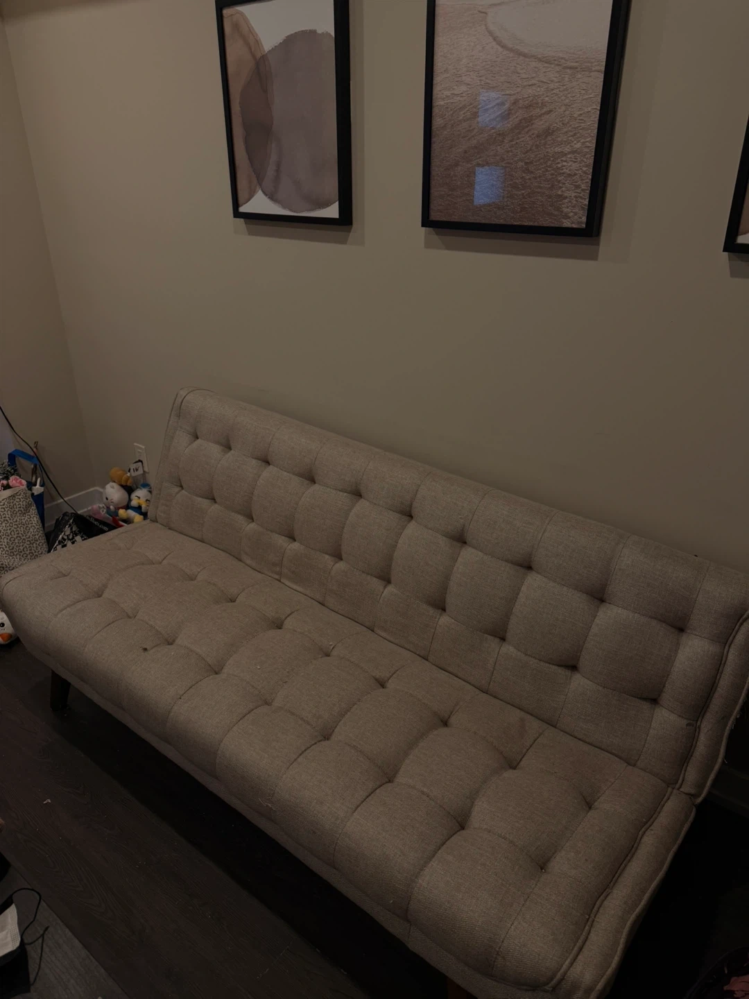 Beige tufted futon sofa. This couch easily converts into a sleeper. Its compact design is great for smaller spaces.
