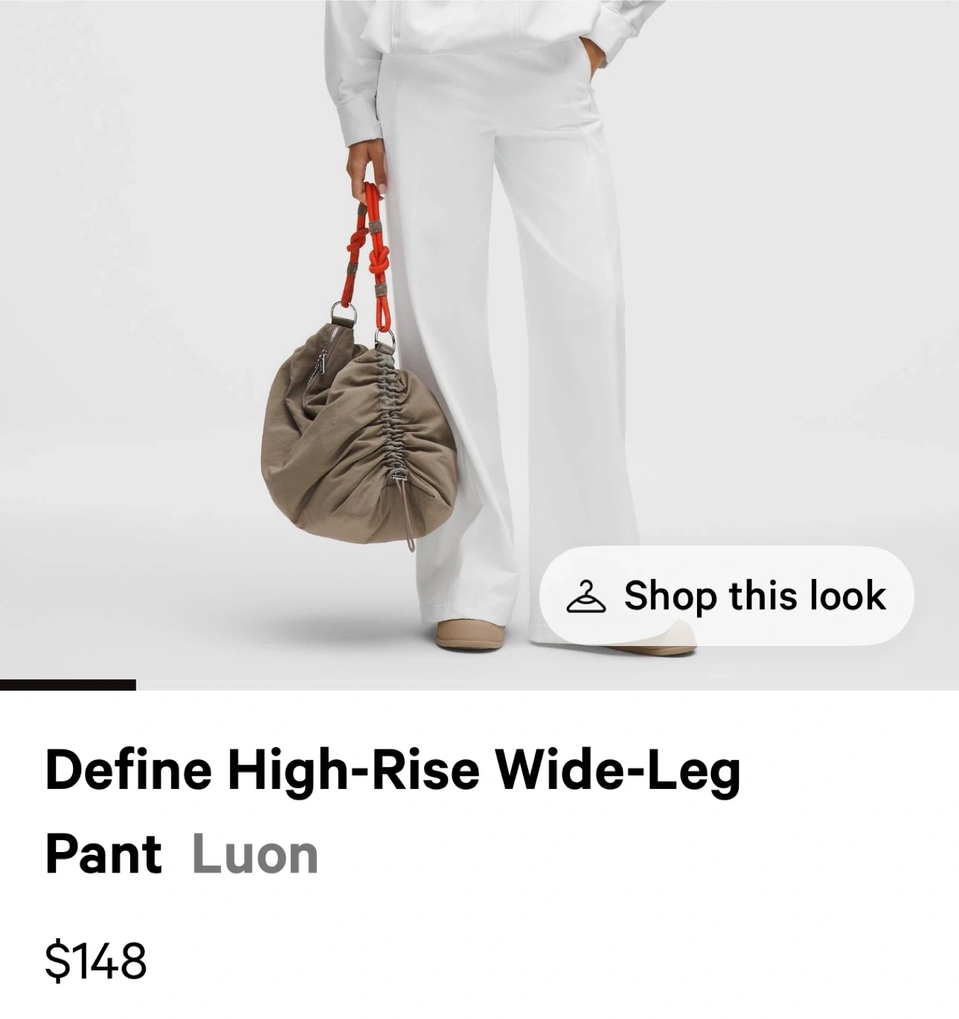 These Lululemon pants are the Define High-Rise Wide-Leg style. They're made from Luon fabric. The pants are white and feature a zippered pocket.