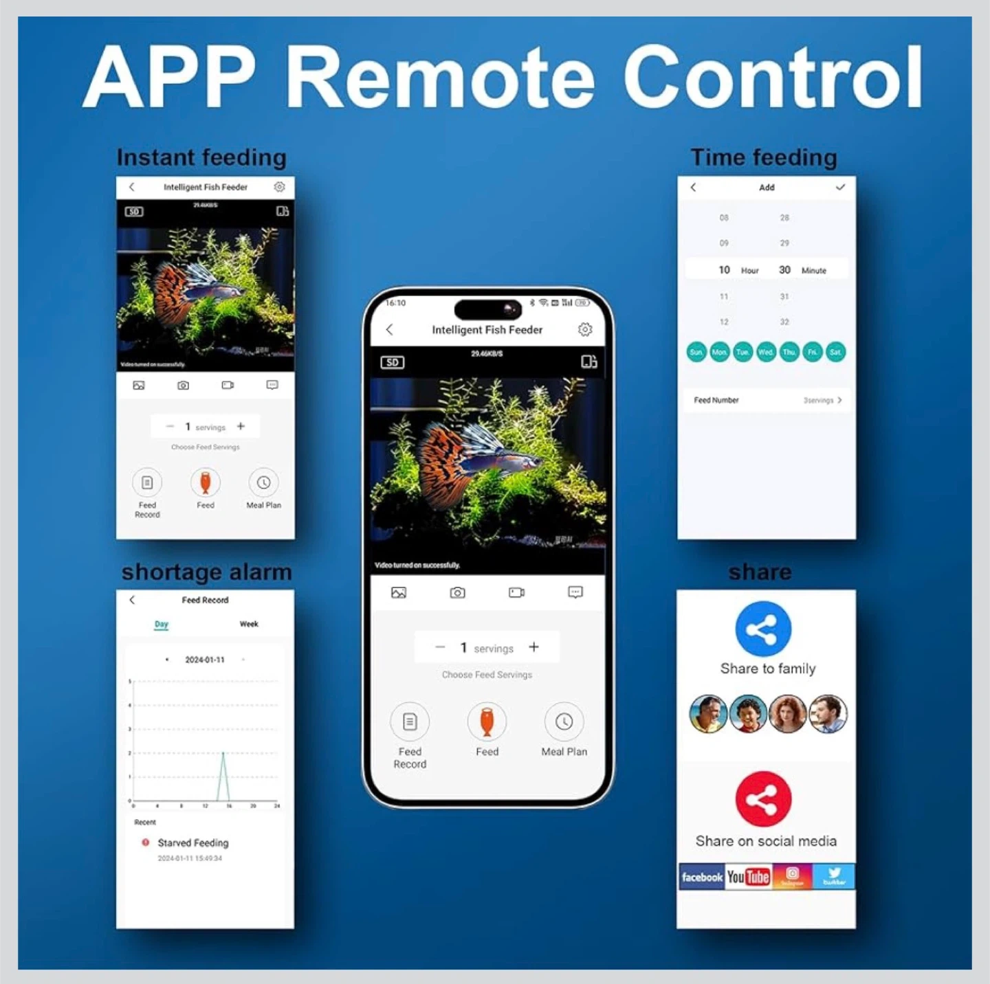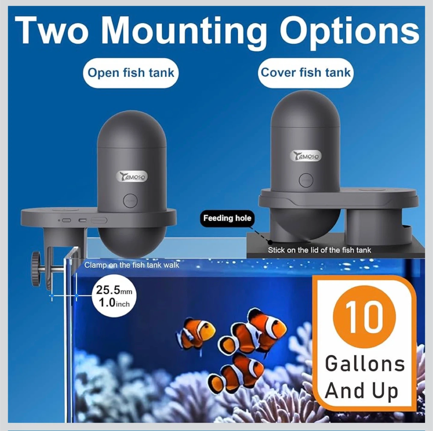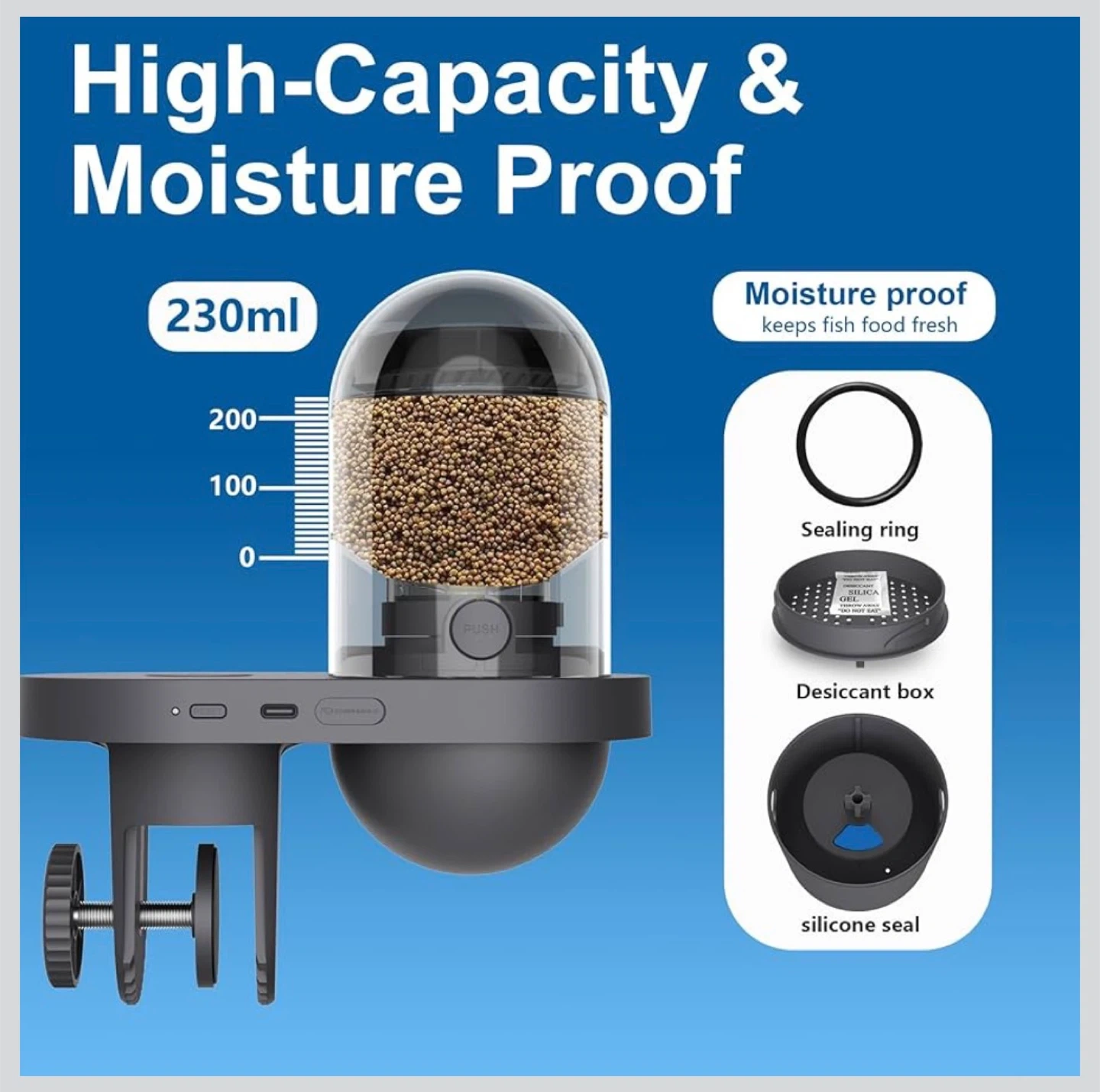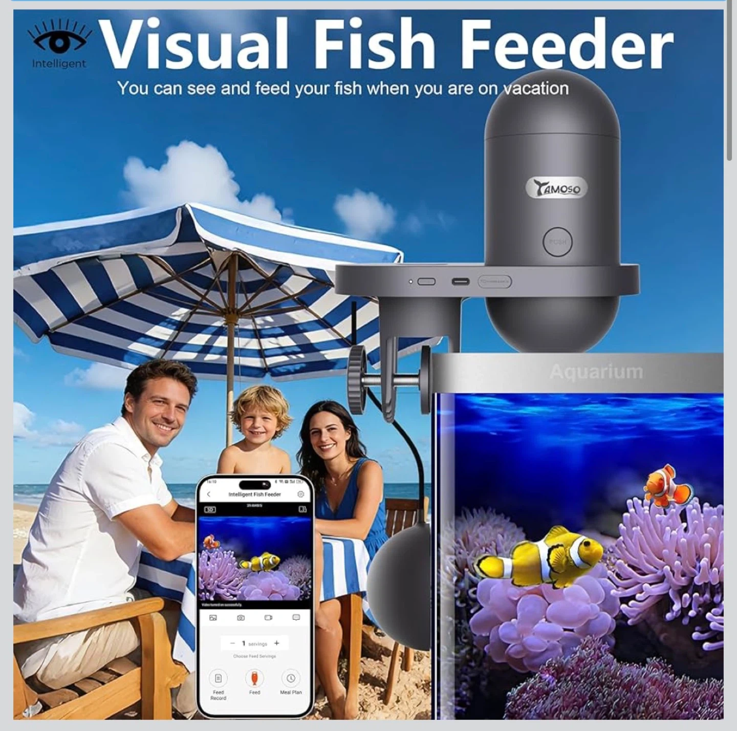 This Yamoso Visual Fish Feeder allows you to see and feed your fish remotely via an app. It's high-capacity and moisture-proof, keeping fish food fresh. The feeder has a 230ml capacity and includes a sealing ring and desiccant box.