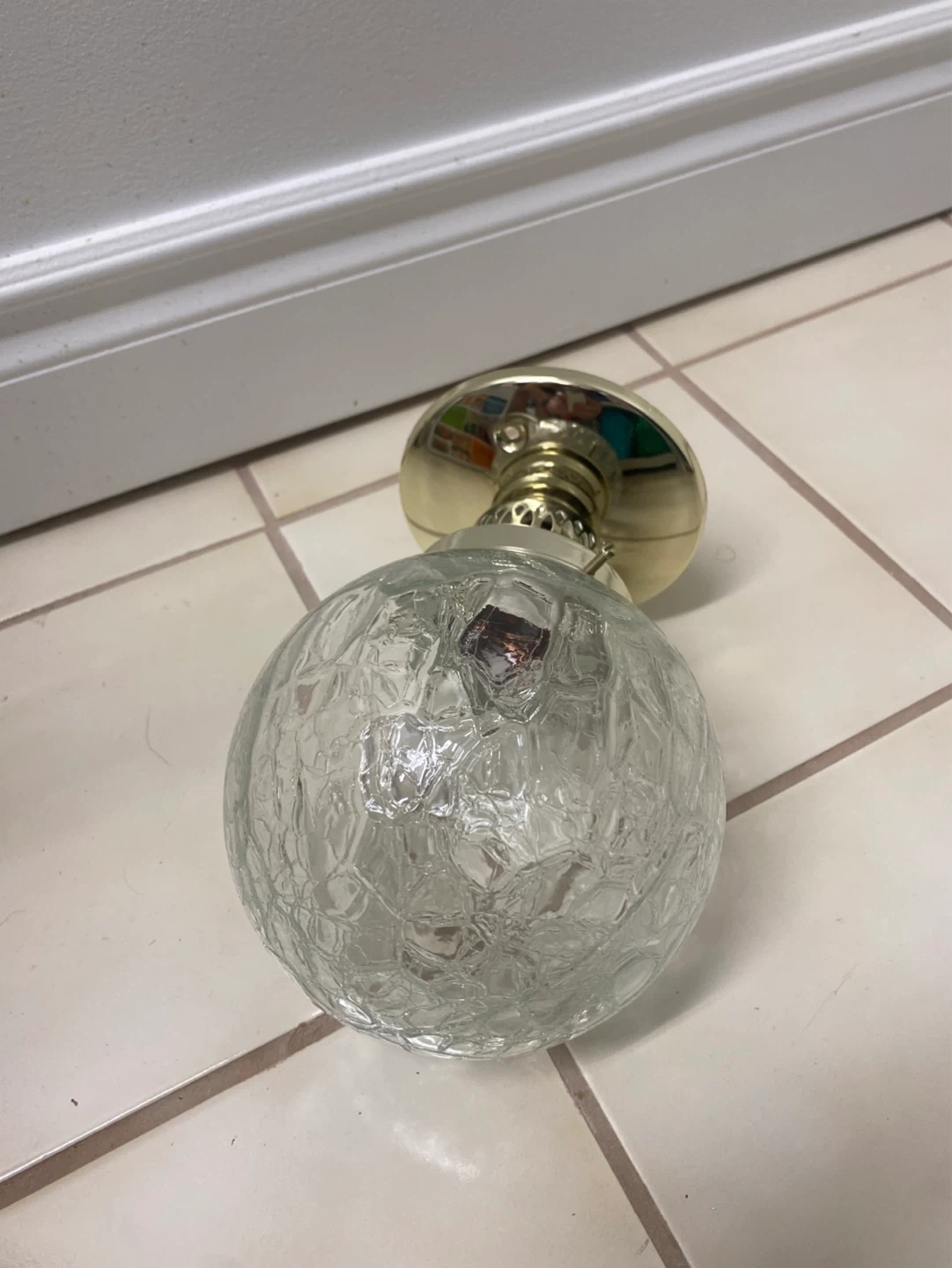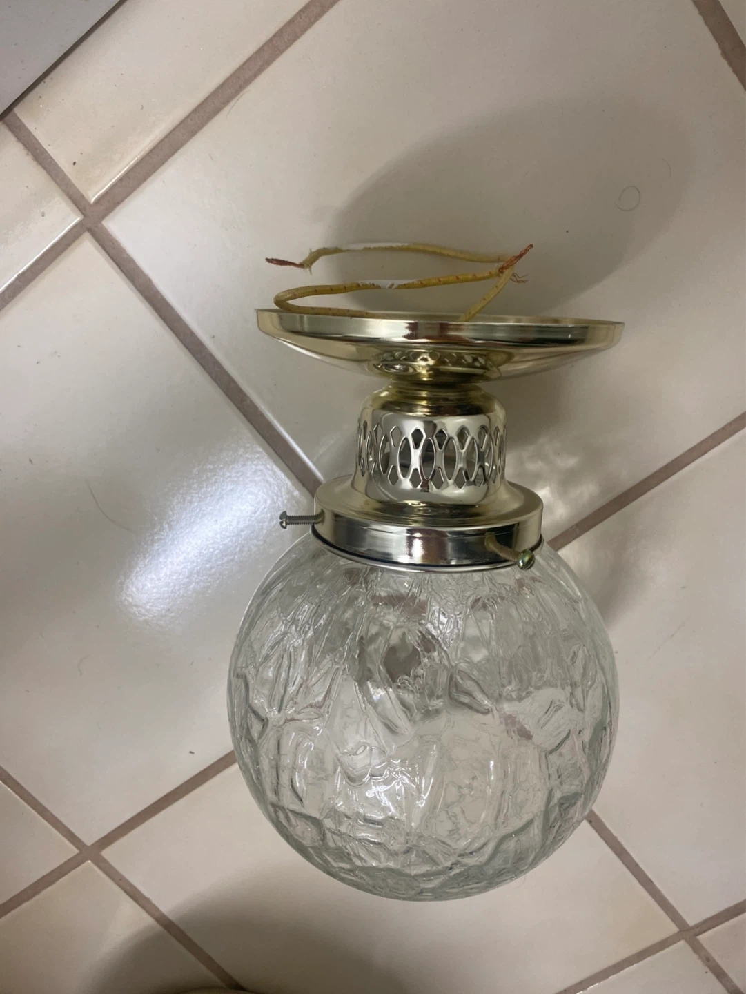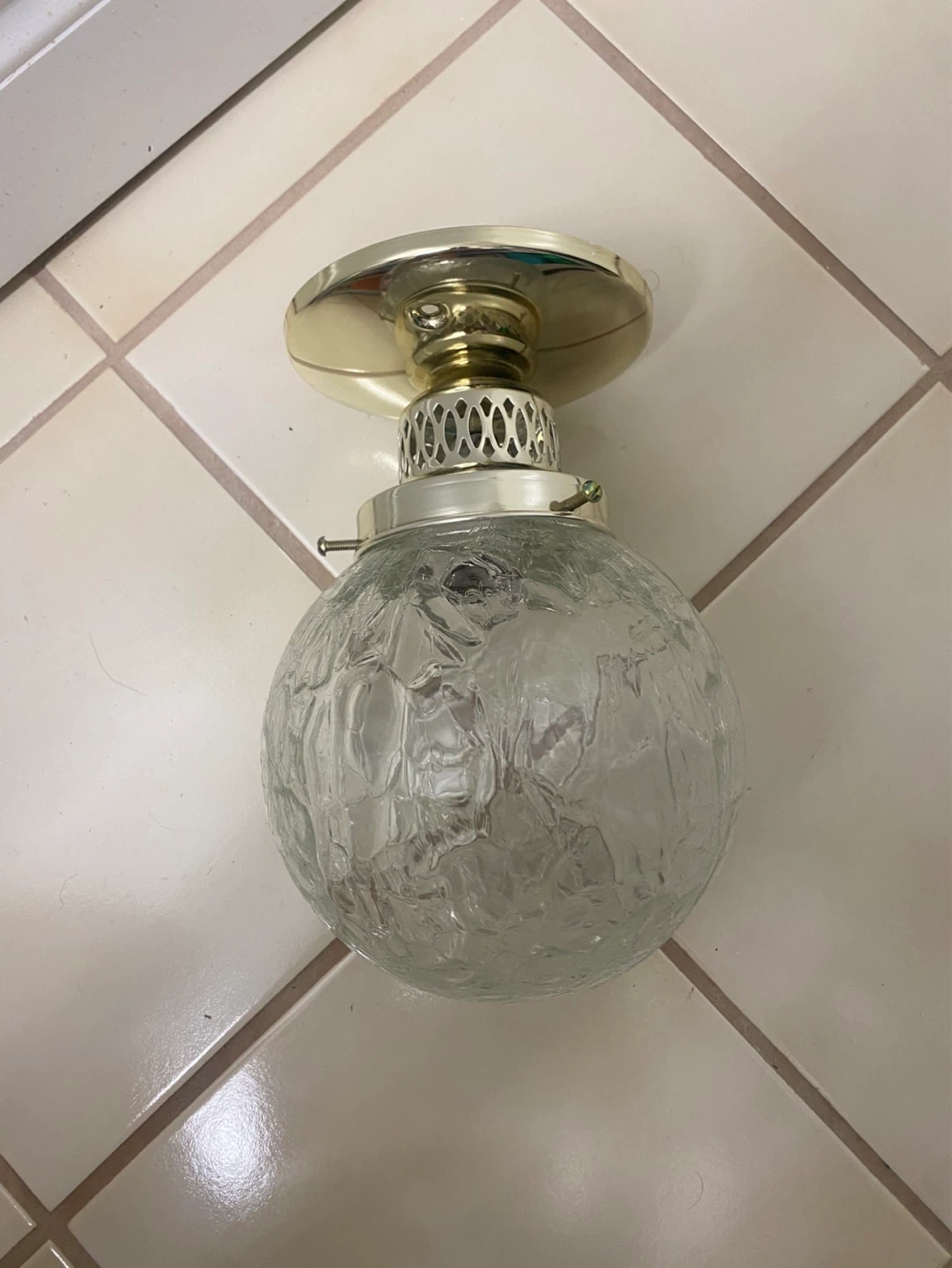 This is a ceiling light fixture with a crackle white glass globe. It has a gold-tone metal base. It's designed for flush mounting. This light would add a unique touch to any room!