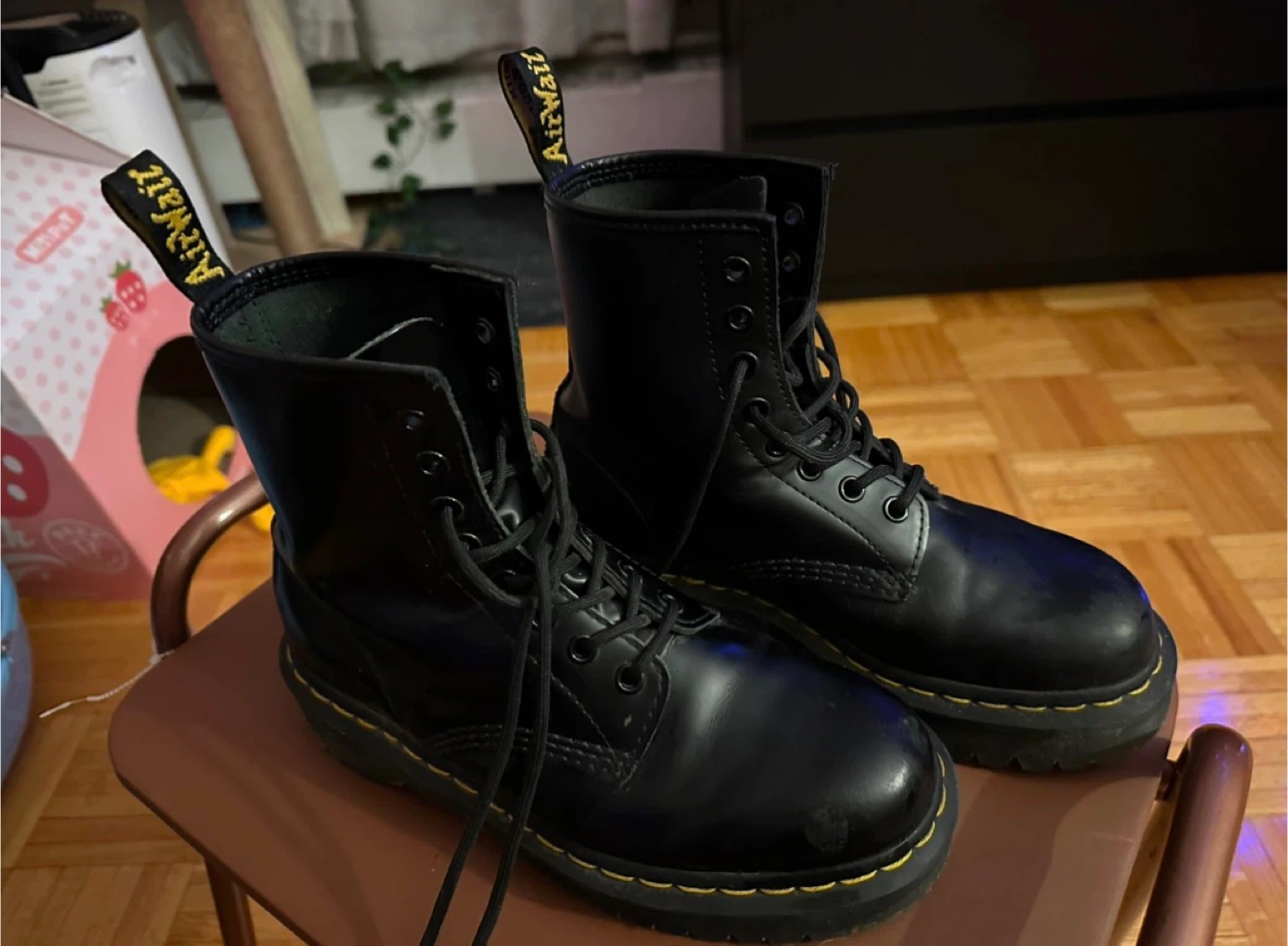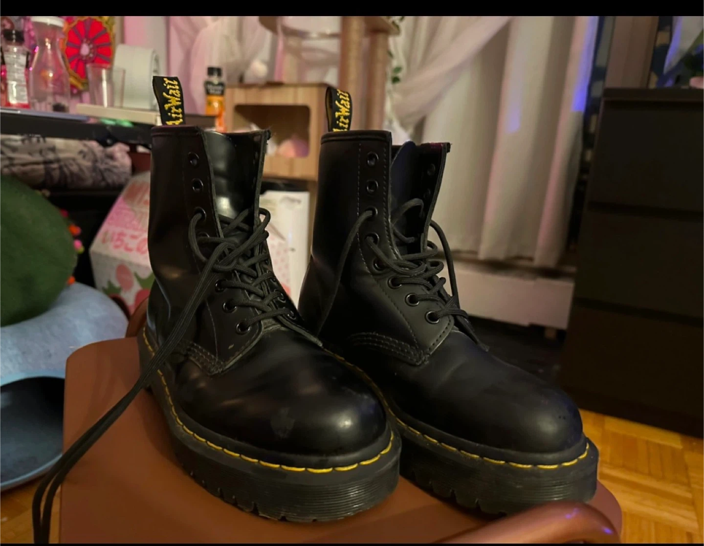 Classic Dr. Martens black leather boots with a platform sole. These boots are made with durable leather and feature the signature yellow stitching. They're comfortable and built to last!
