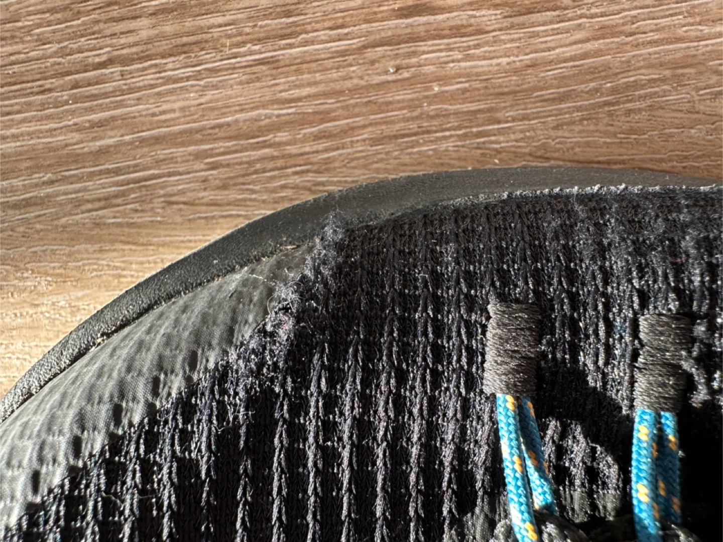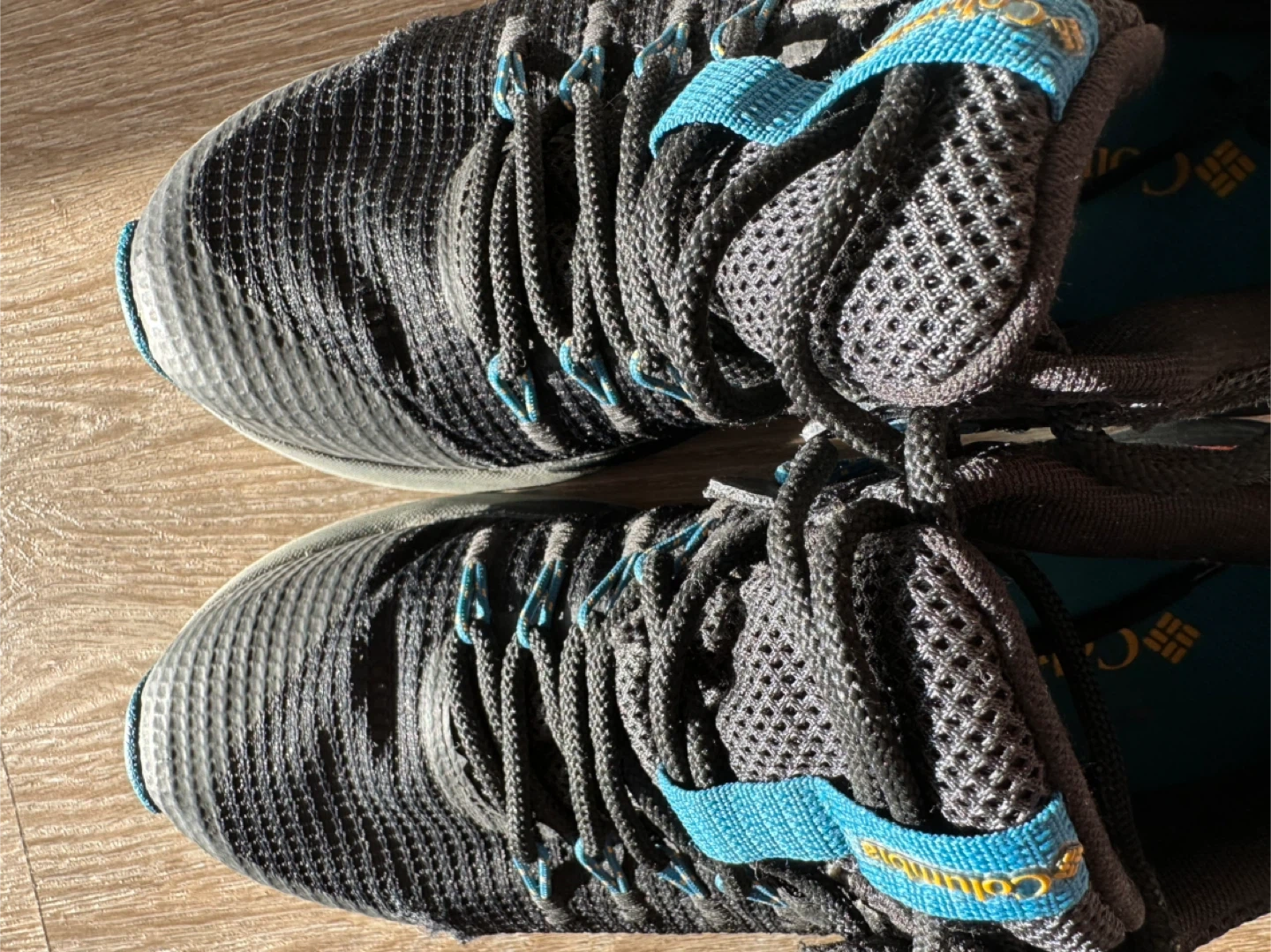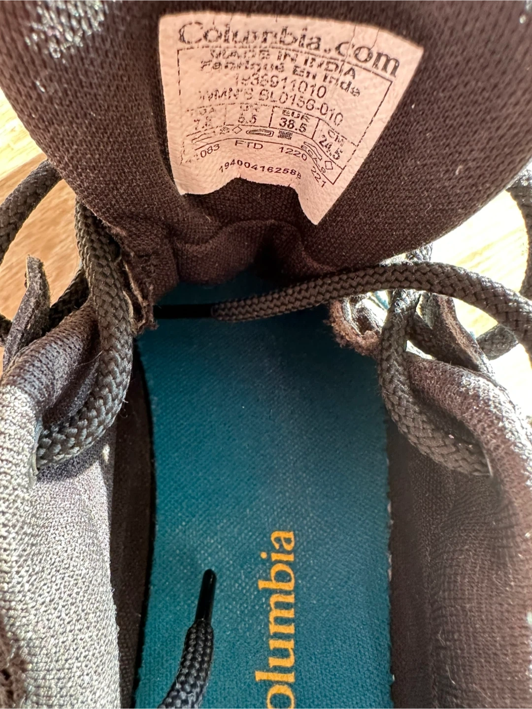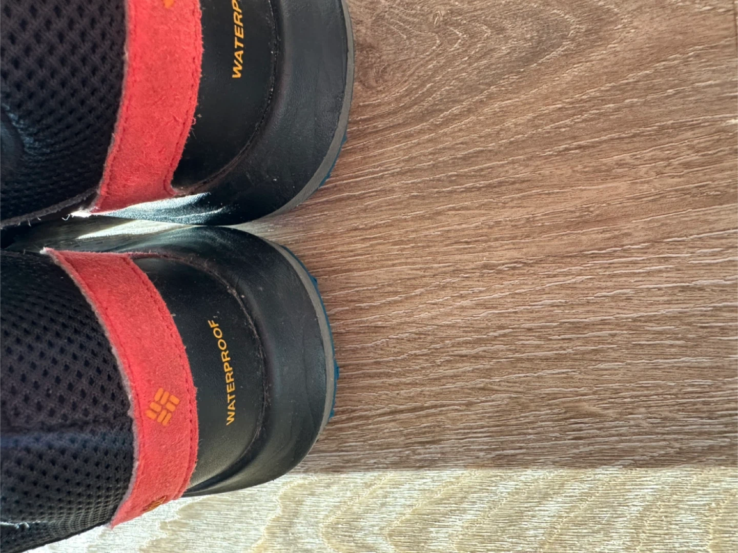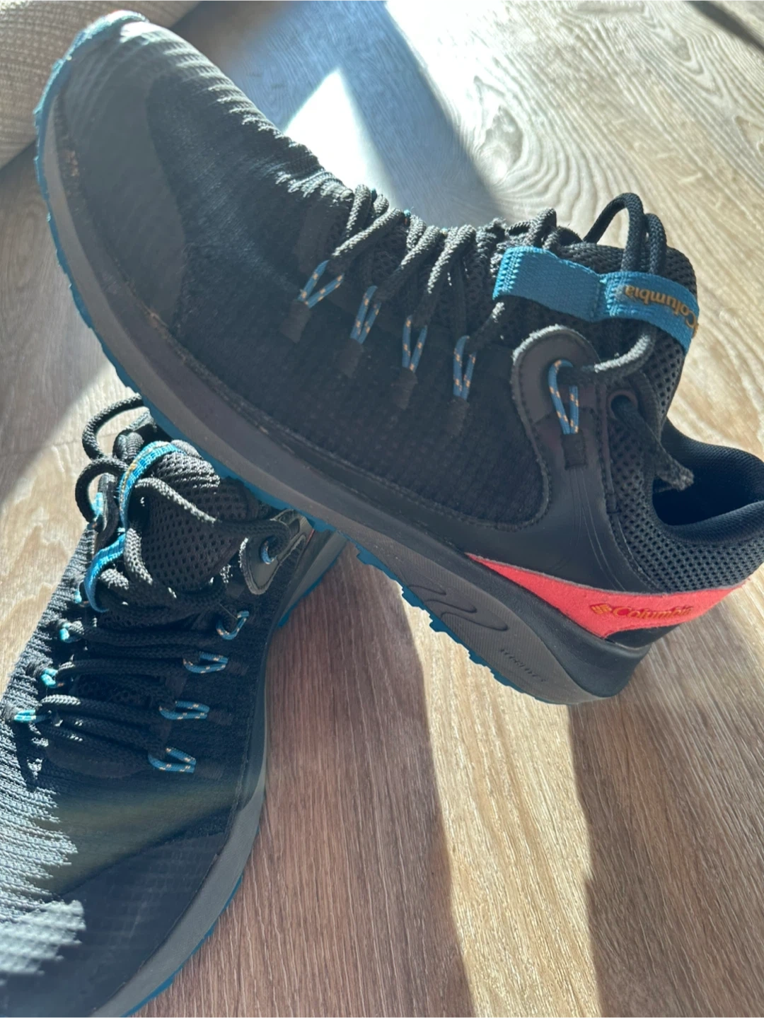 These black Columbia trail running shoes are waterproof. They're made with a mesh upper and have a durable rubber sole. Great for outdoor adventures! Some wear and tear show in pictures