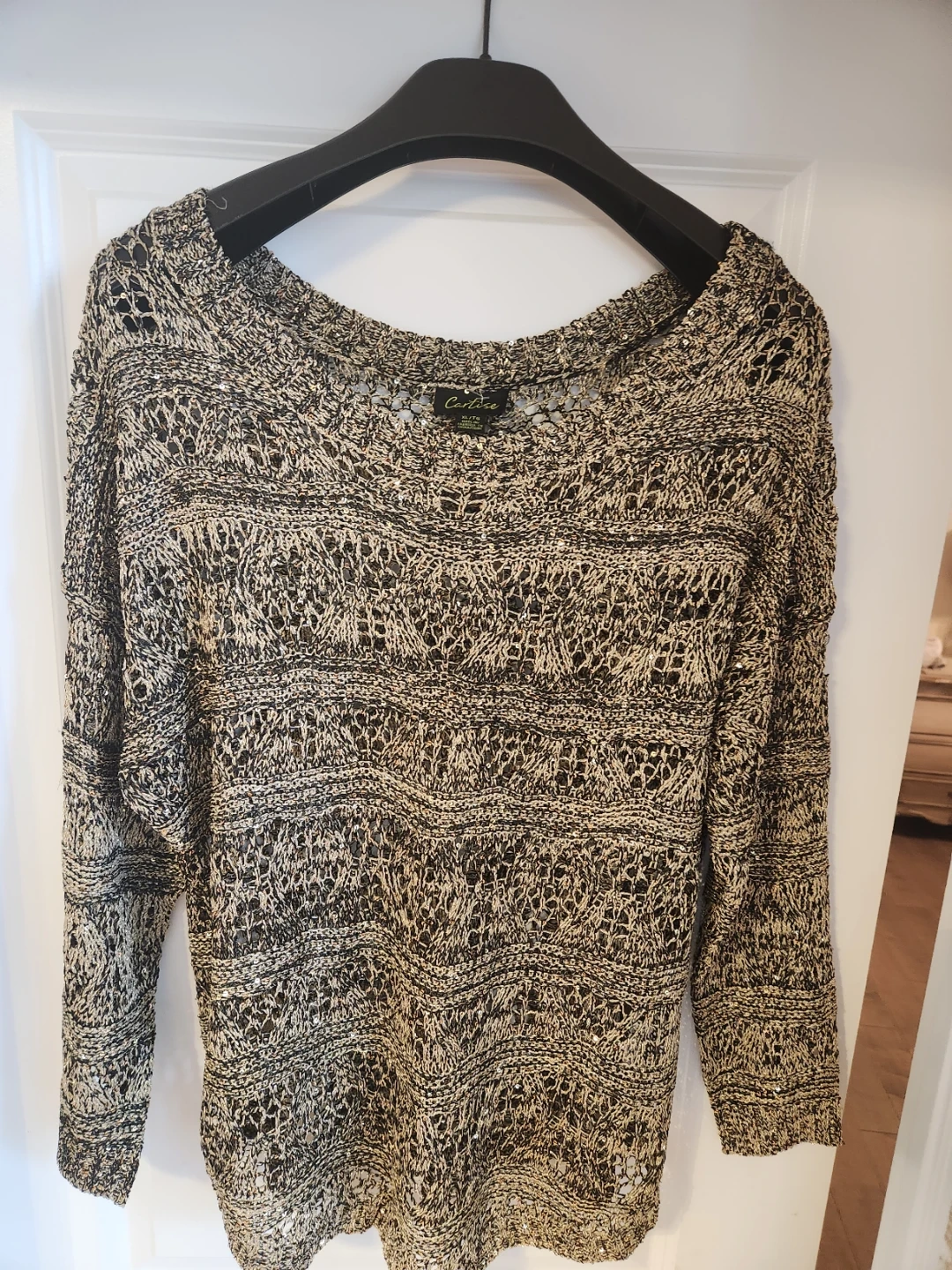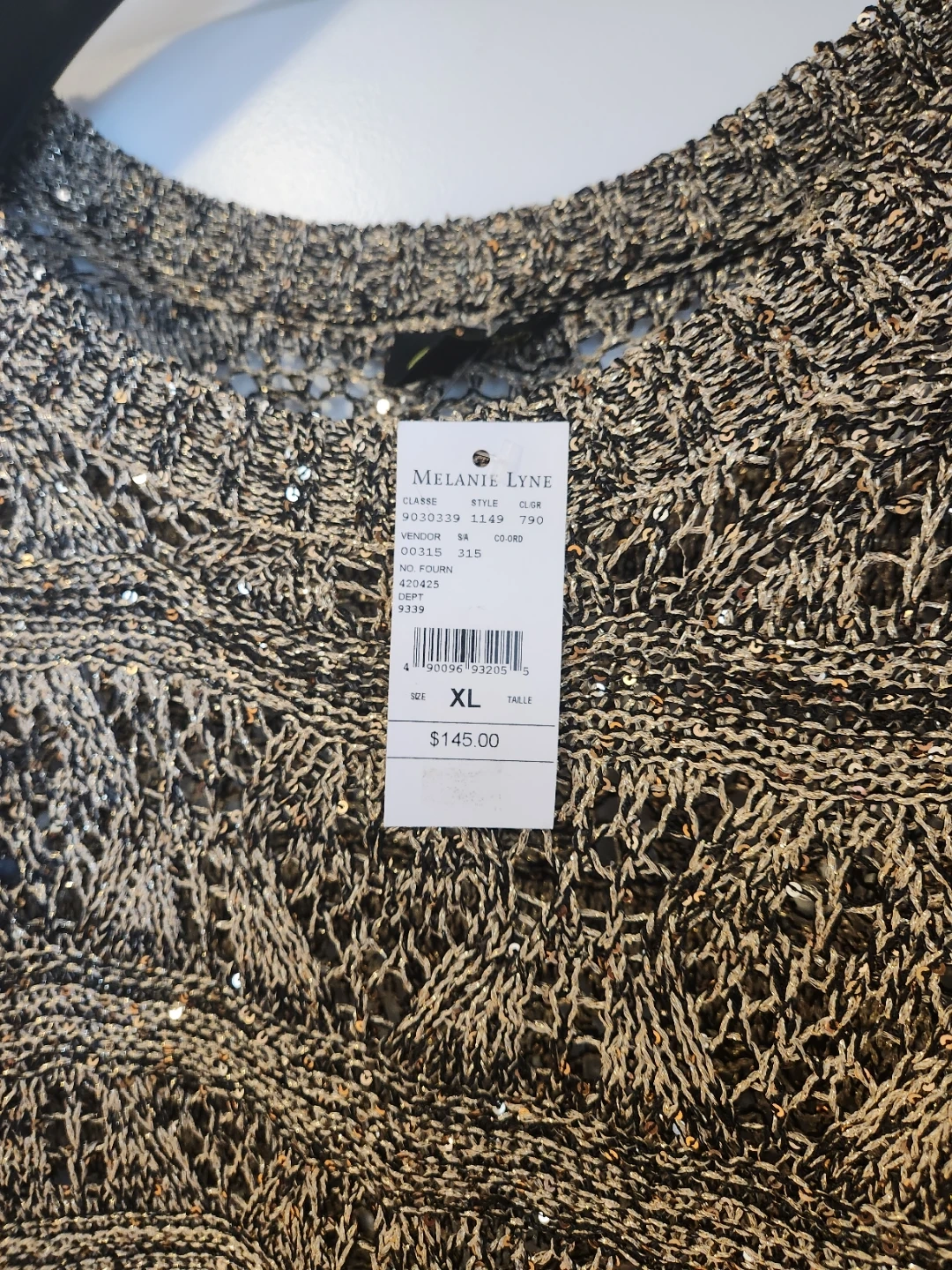 Brand new with tag. Beautiful Melanie Lyne sweater is a size XL. It's a knit with an open weave design and subtle sequin embellishments. Perfect for a present!