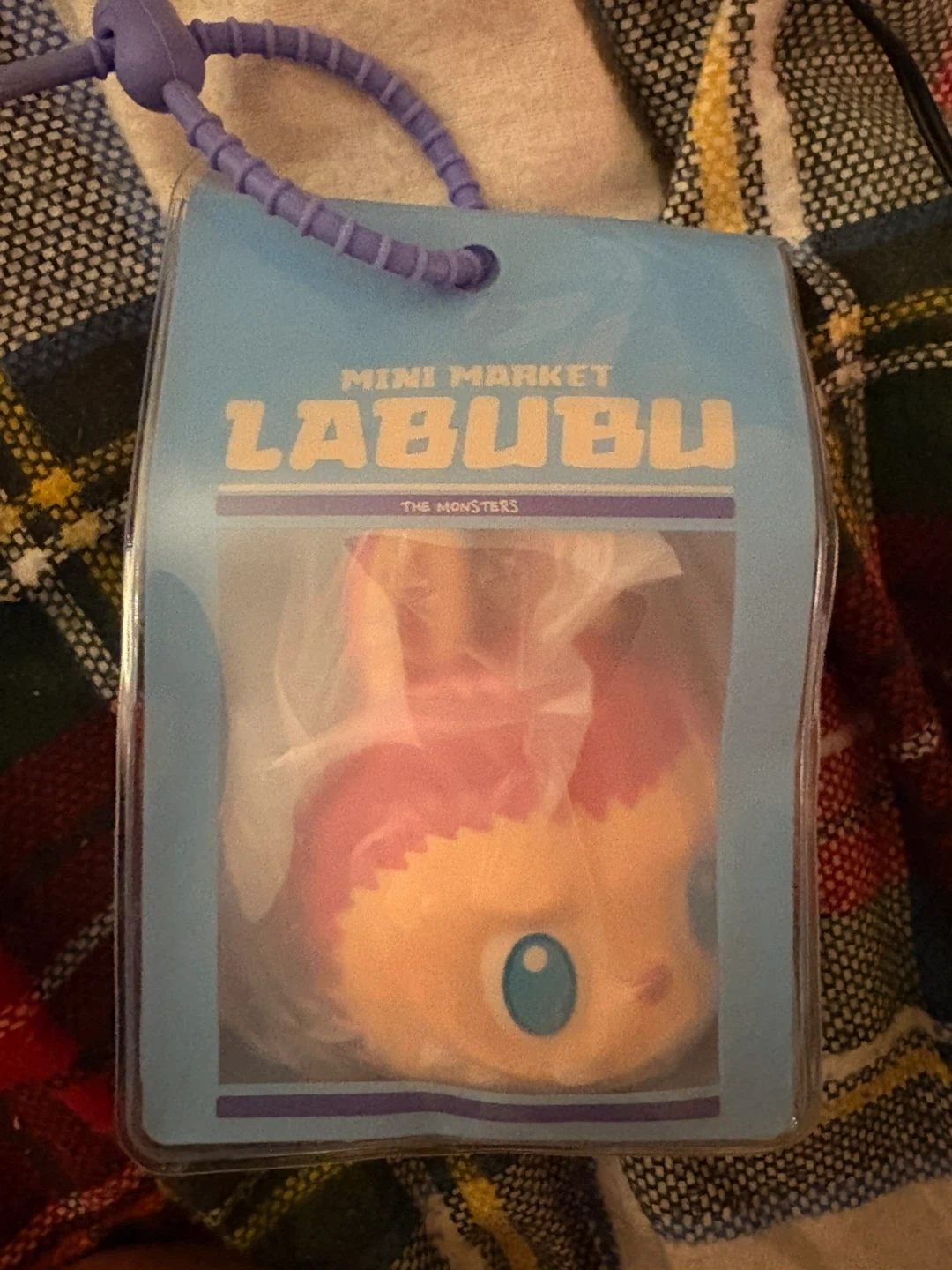 This is a Labubu plush toy from Mini Market. It's part of The Monsters collection. The plush is yellow and pink with blue eyes. Zelle or cash. Wellington and Halsted here.