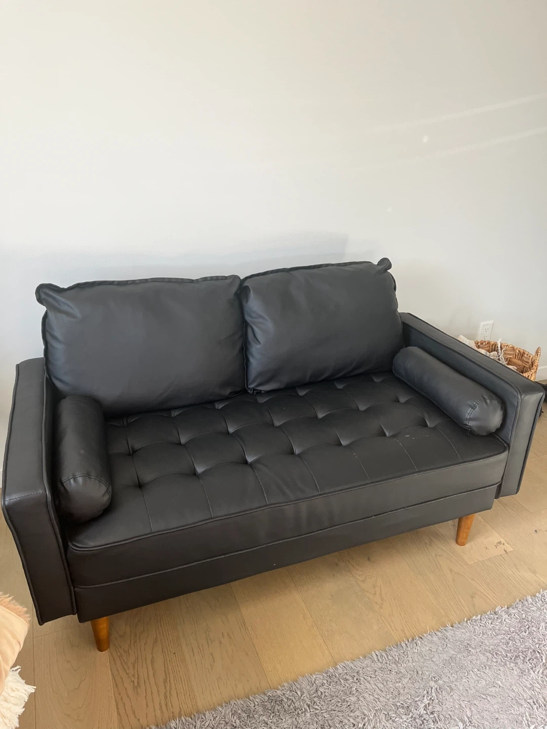 Black faux leather loveseat sofa with tufted seat cushions. Comes with two matching throw pillows and two bolster pillows. Wooden legs add a modern touch. My cat scratched it a couple of times. Otherwise, it's like new.
