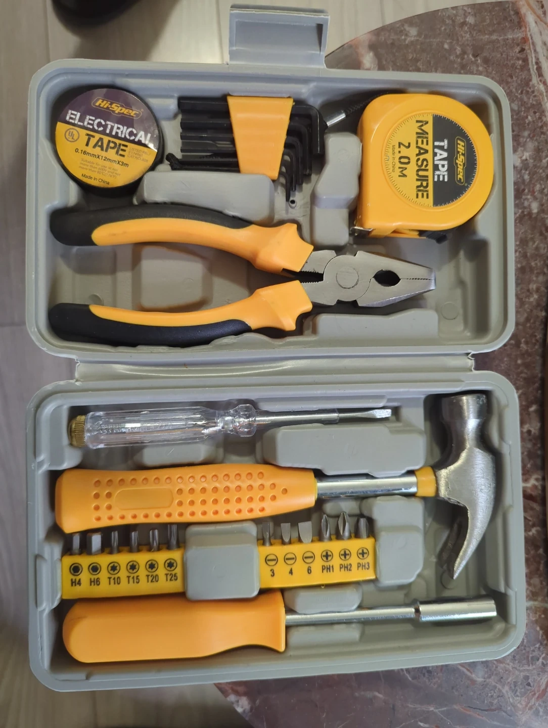 1000+Selling a Hi-Spec tool kit that comes with its own case. It includes a variety of tools such as pliers, screwdrivers, a hammer, measuring tape, electrical tape, and more. Great for small jobs around the house!