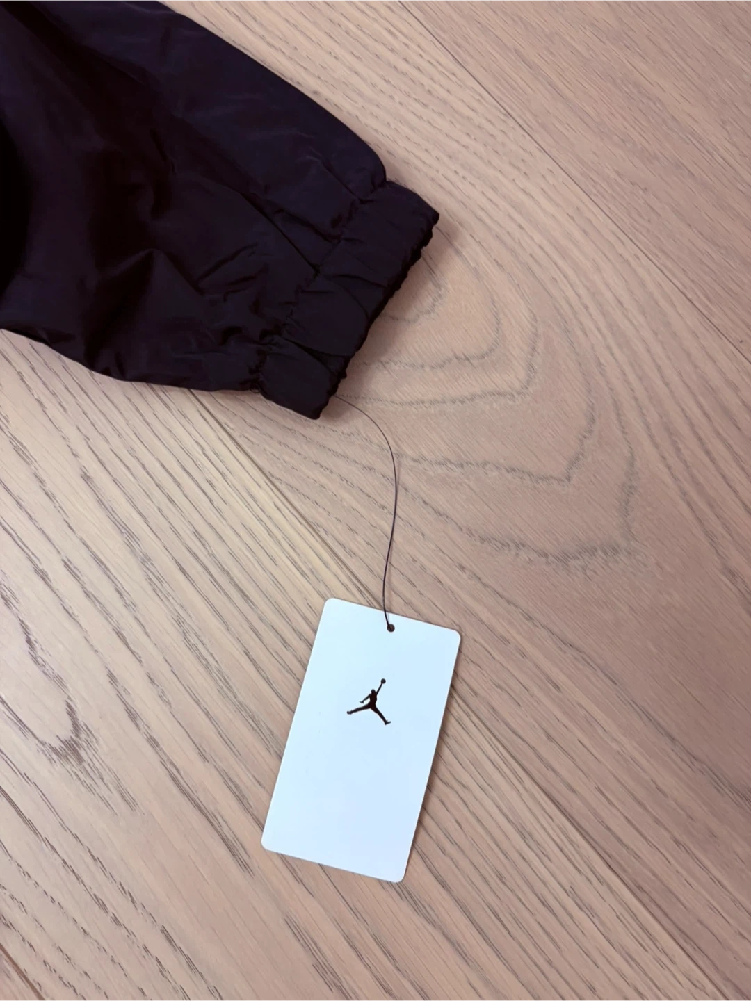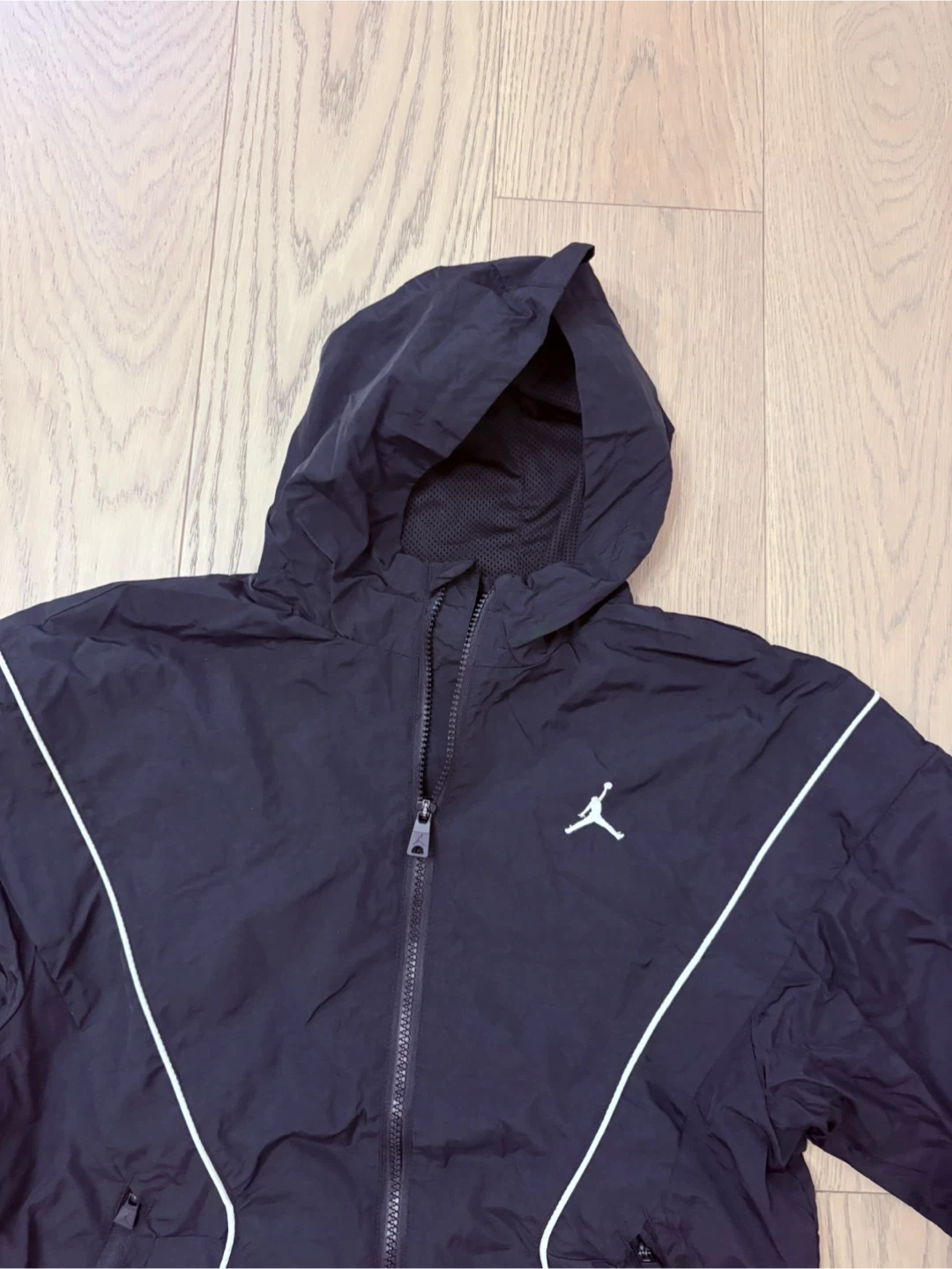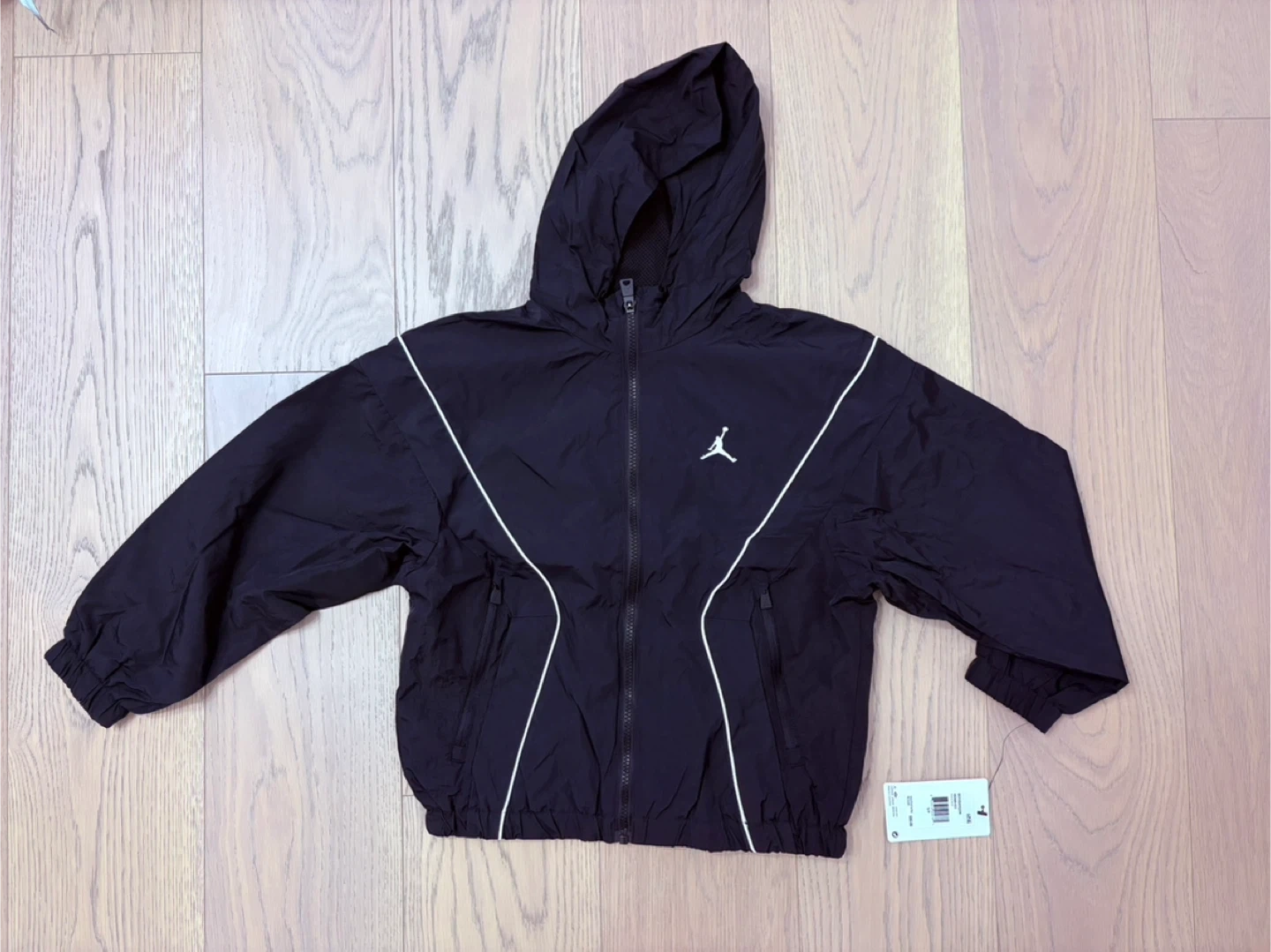 Brand new Jordan hooded windbreaker jacket for boys. It's black with white piping details. Size is Large. 12-13 years old.
