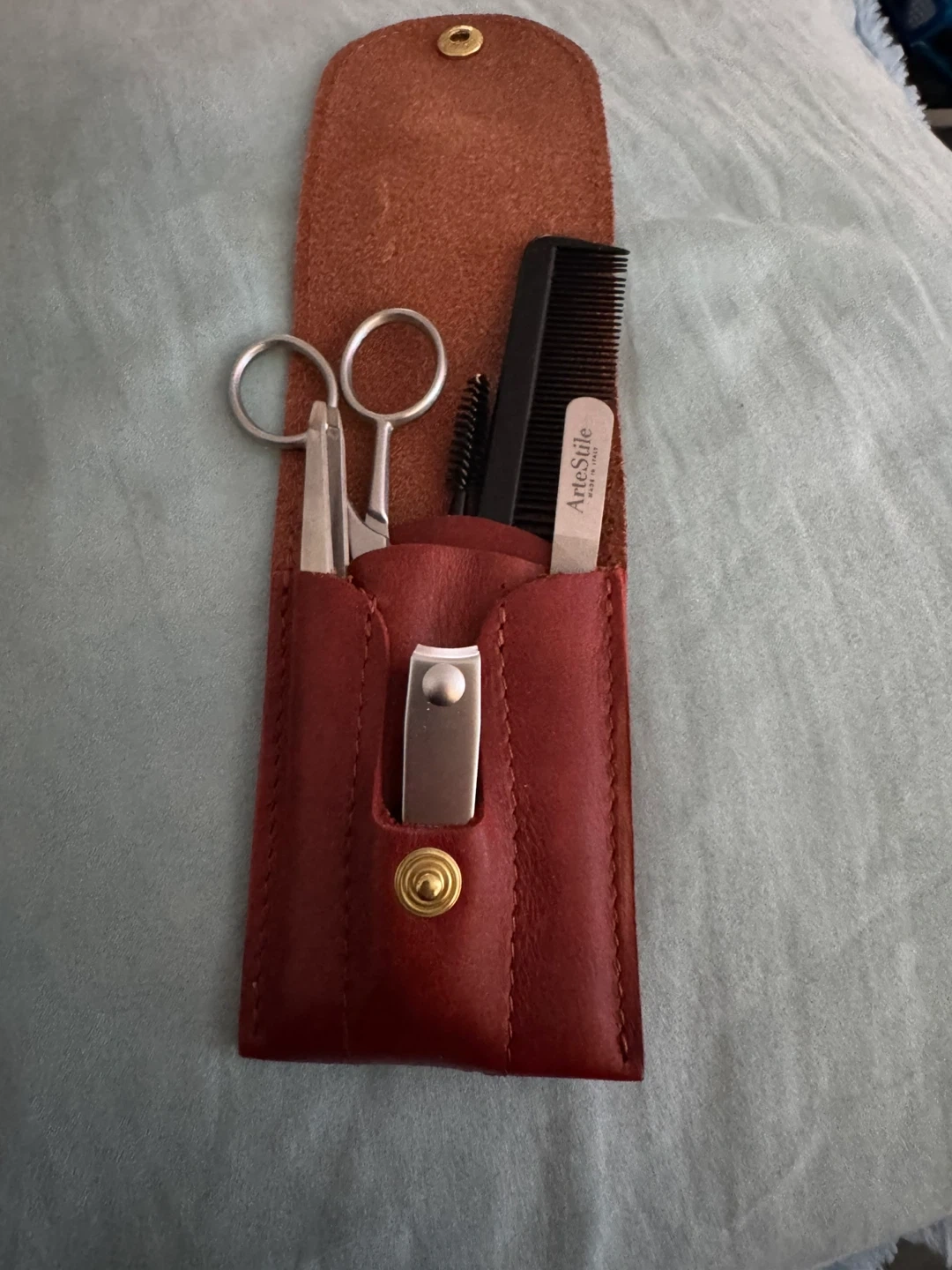 This Monte & Joe grooming kit comes in a brown leather case. It includes scissors, tweezers, a nail clipper, a comb, and a nail file. The leather case has a snap closure.