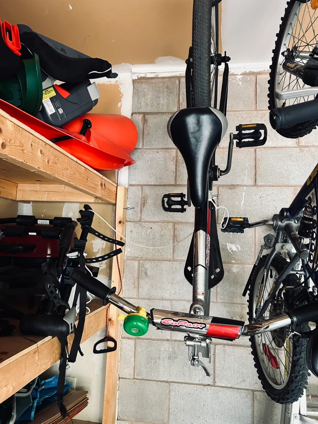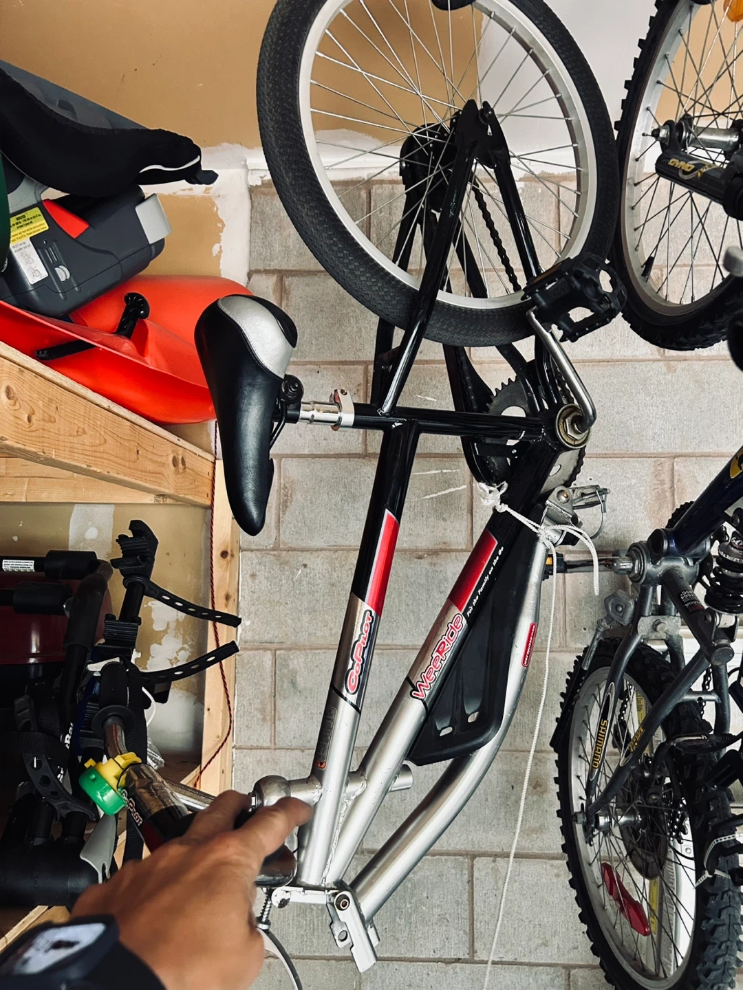 This is a trailer to connect to a bike that still allows the kids to pedal. The frame is silver with red accents. It comes with a comfortable black seat.