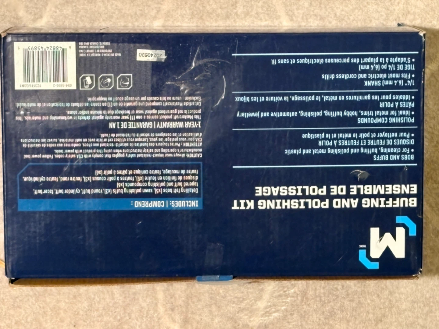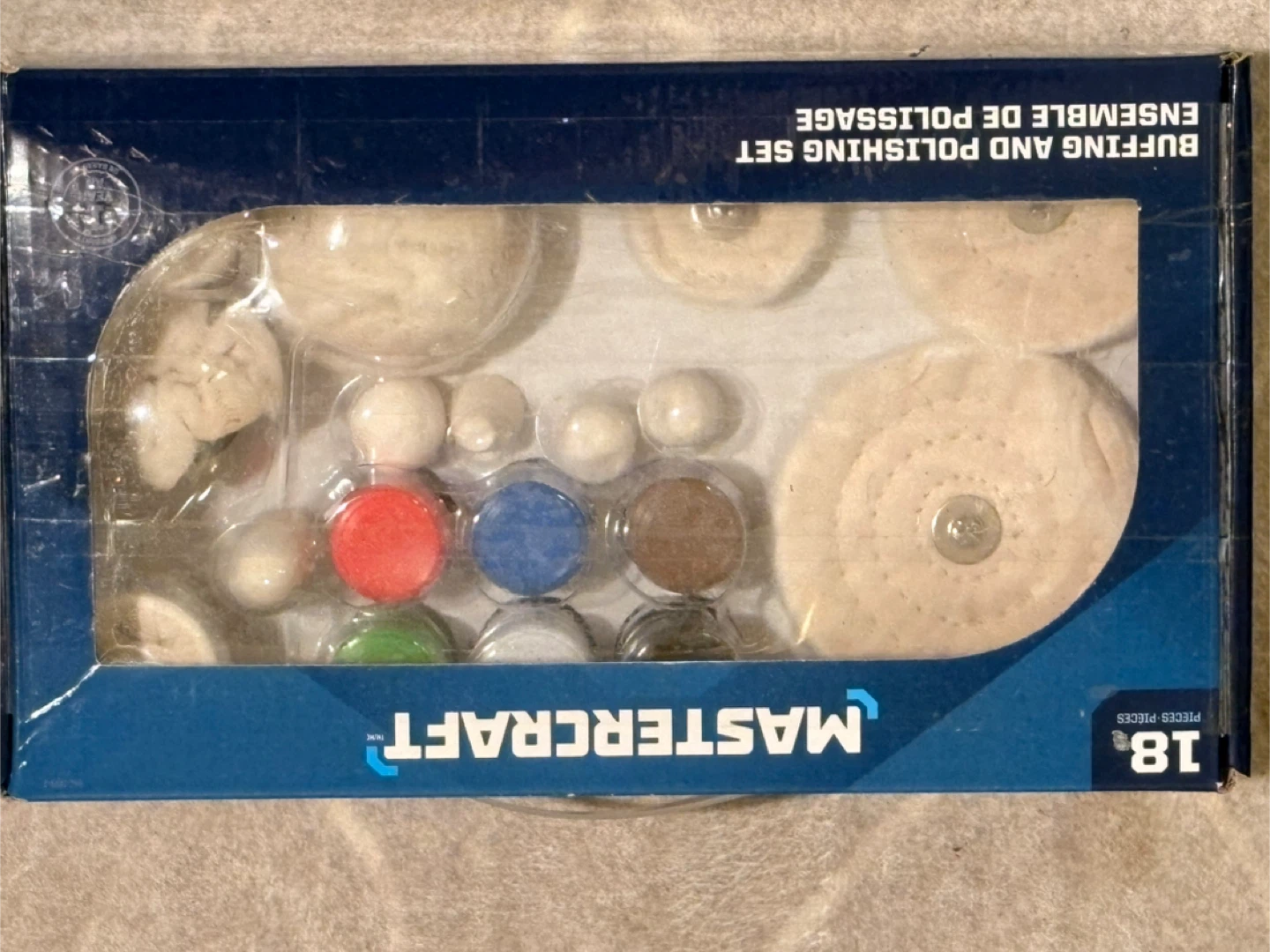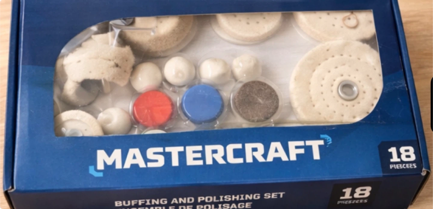This Mastercraft set includes 18 pieces for buffing and polishing. It contains various felt wheels, polishing compounds, and accessories. This kit's great for cleaning and restoring metal and other surfaces.