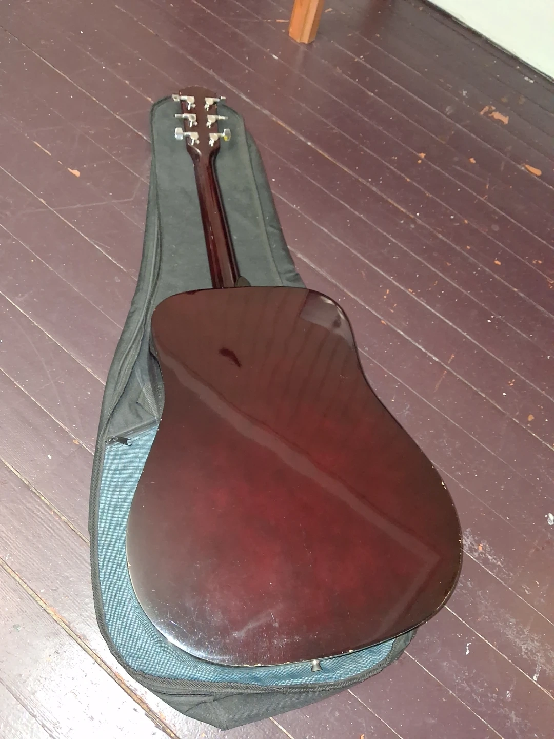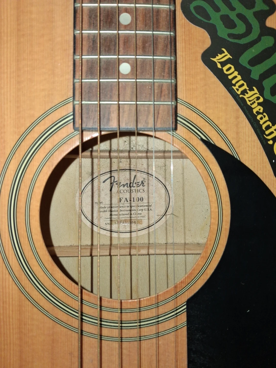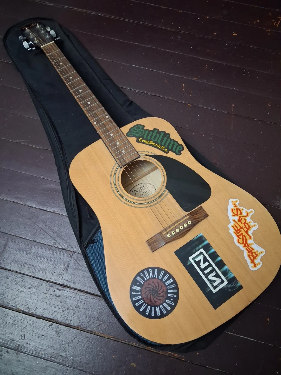 Used Fender FA100 acoustic guitar. Natural wood finish. Includes a black bag. The guitar body is adorned with several stickers.