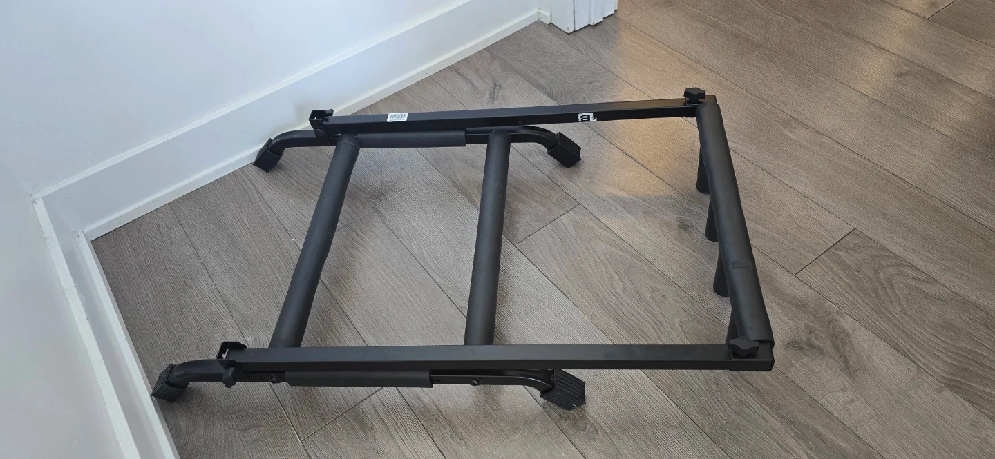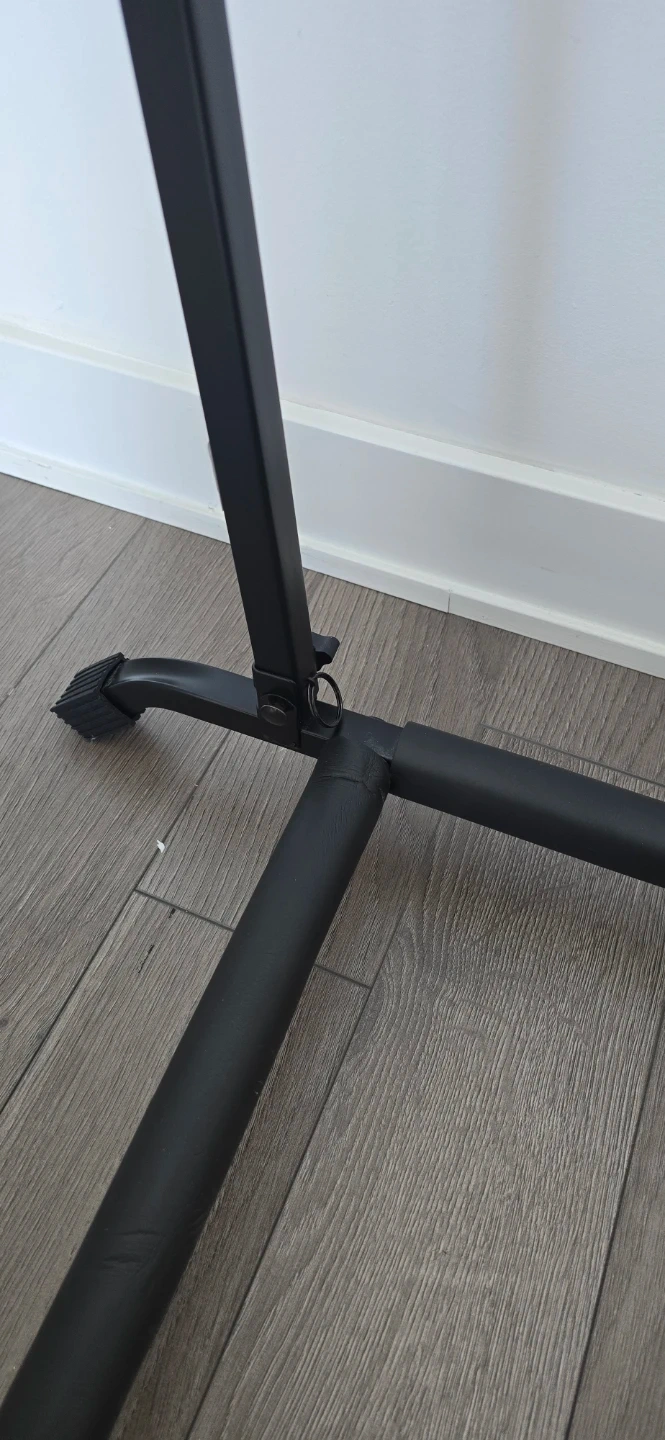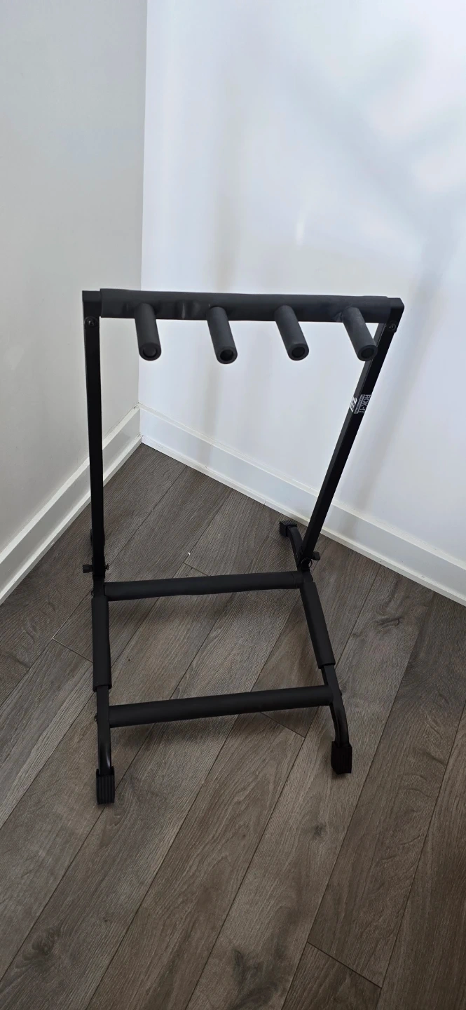 Black metal guitar stand designed to hold three guitars. It's foldable for easy storage and transport. The stand has padded arms to protect your instruments.