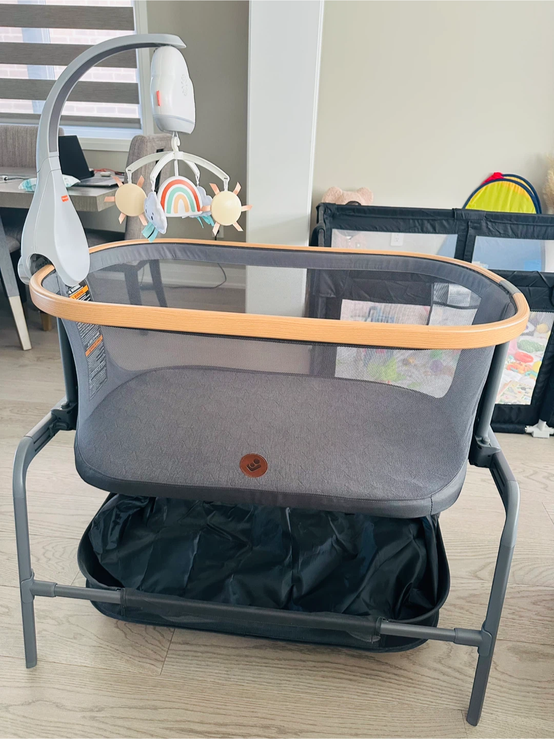 Maxi-Cosi Iora bedside bassinet in grey. It's a versatile sleep solution for your little one. Features breathable mesh sides and a sturdy frame. Includes a storage basket underneath.
