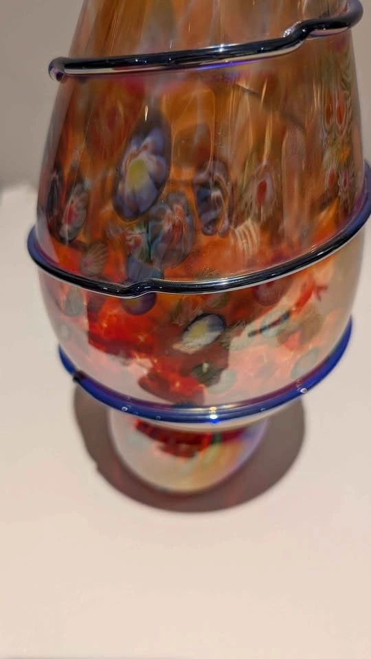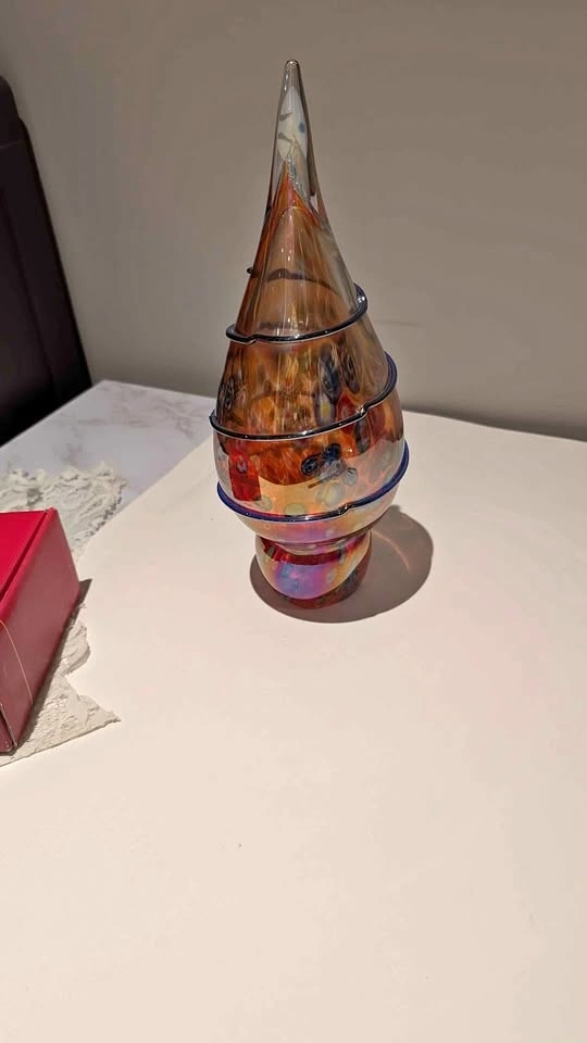 Art glass Christmas tree with millefiori and applied rigor. Teardrop design. Hand blown. Can insert lights inside to make it glow. Looks fantastic. Approximately 13" tall and 5" wide at the widest point. Asking $35 or best offer. Feel free to message if you have any questions!