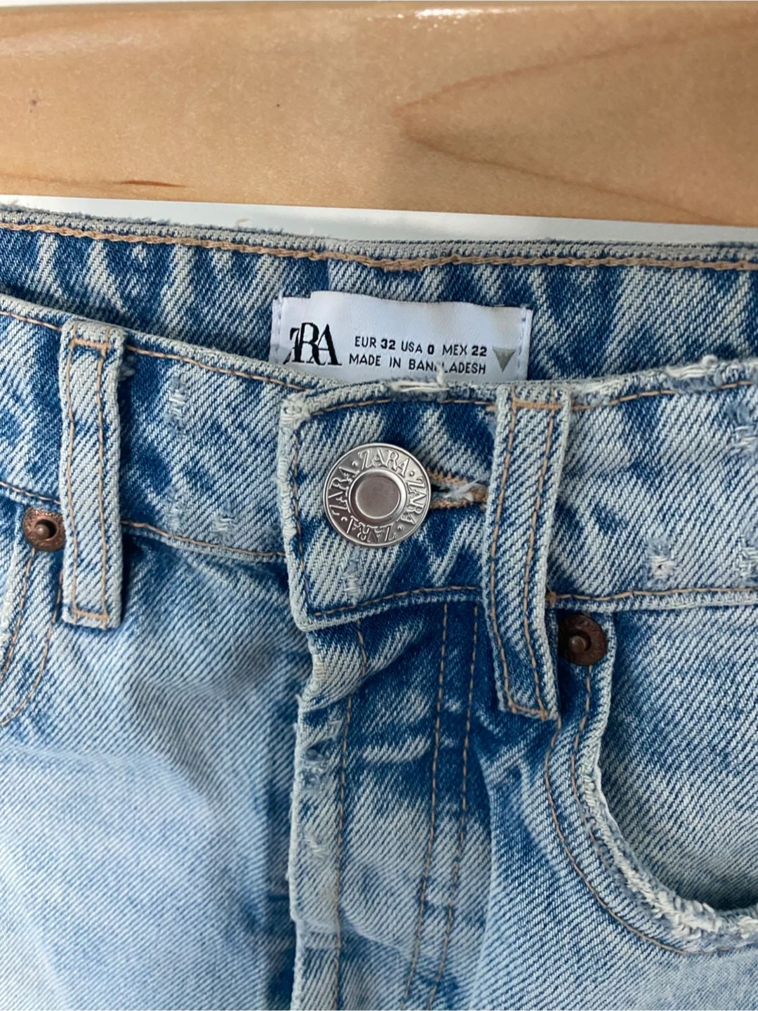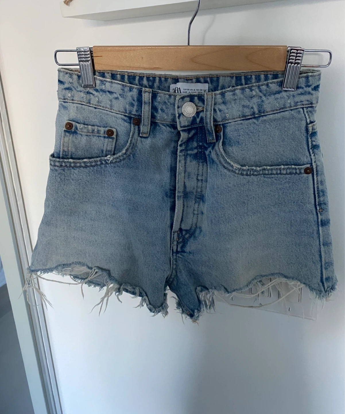 ZARA denim shorts with a light wash and frayed hem. These shorts are size 0 EUR 32 USA 0 MEX 22.