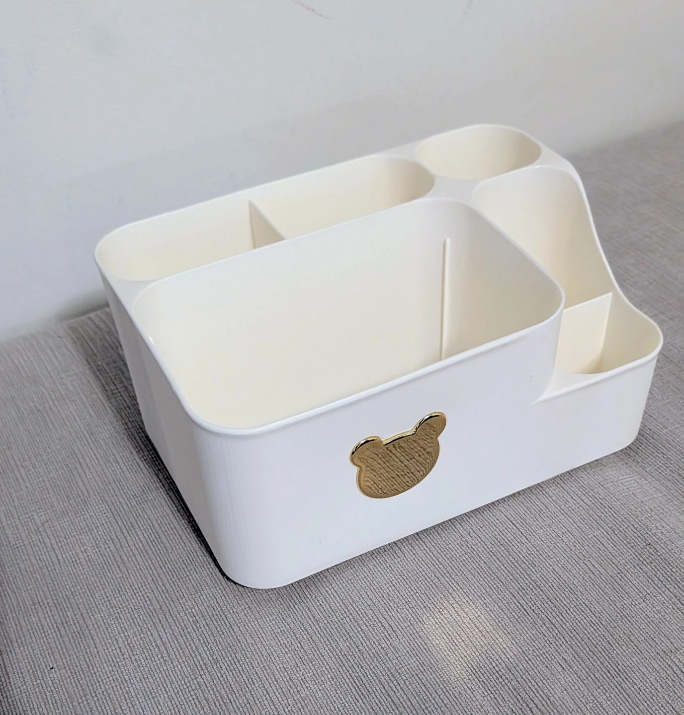 This white desktop organizer features multiple compartments for various items. It has a prominent bear emblem on the front. Plastic material.
