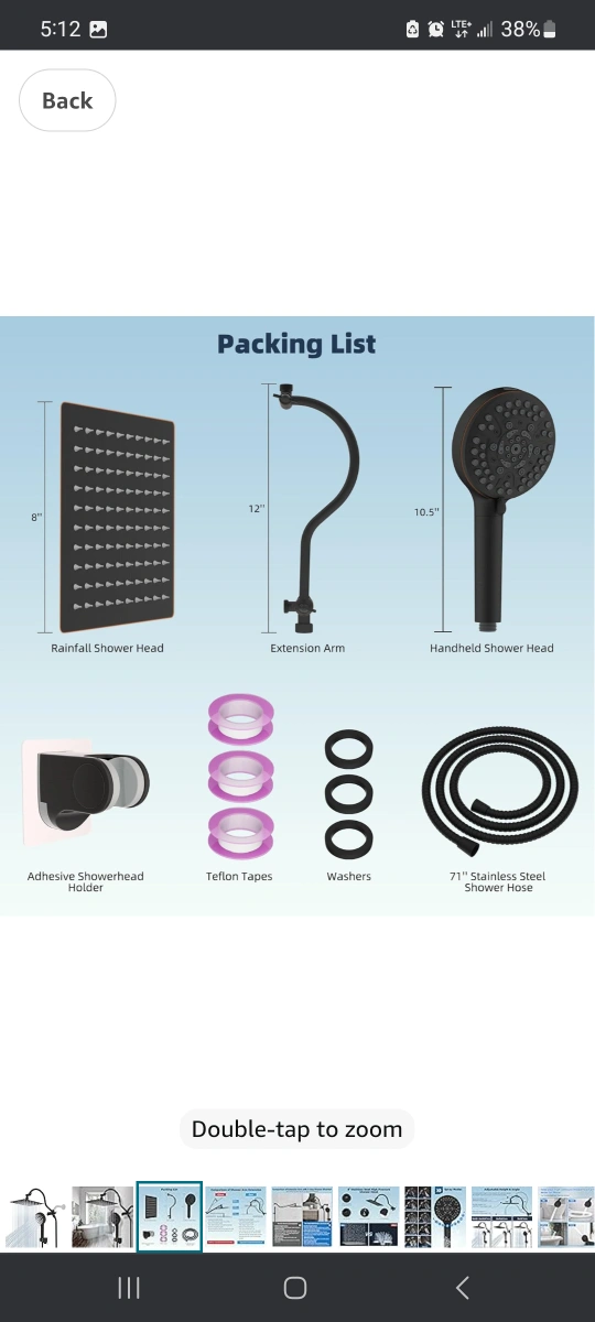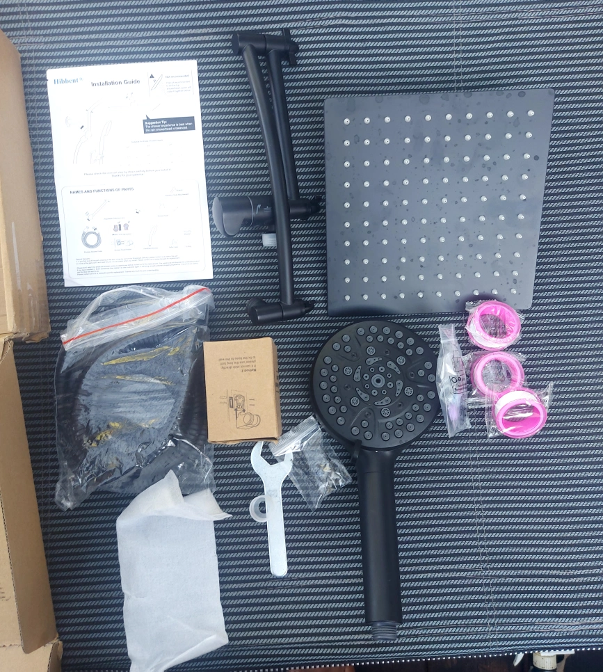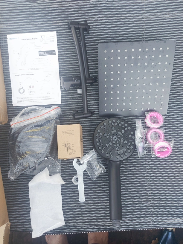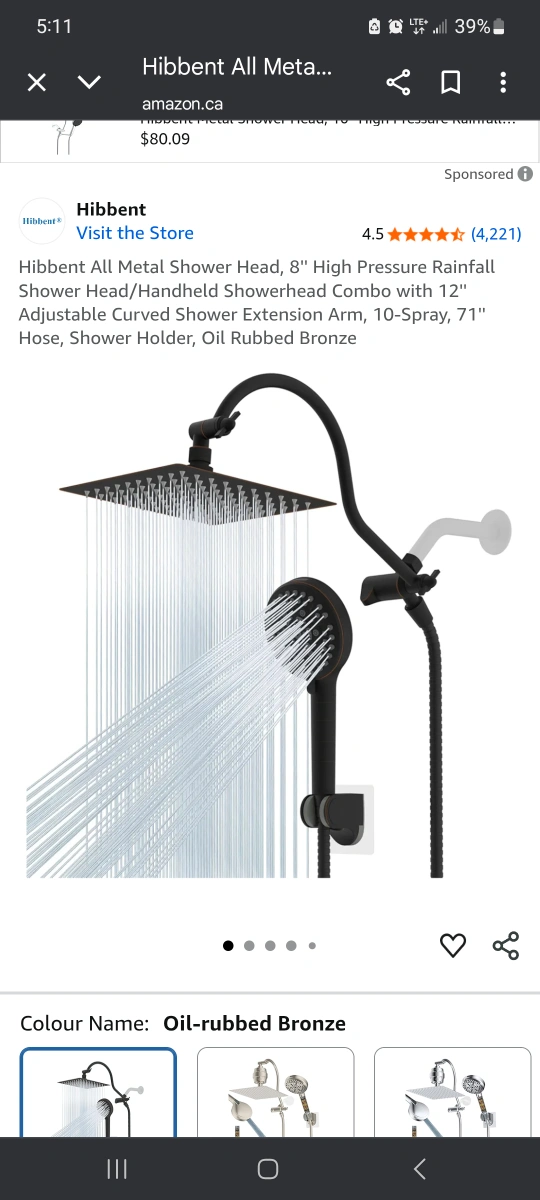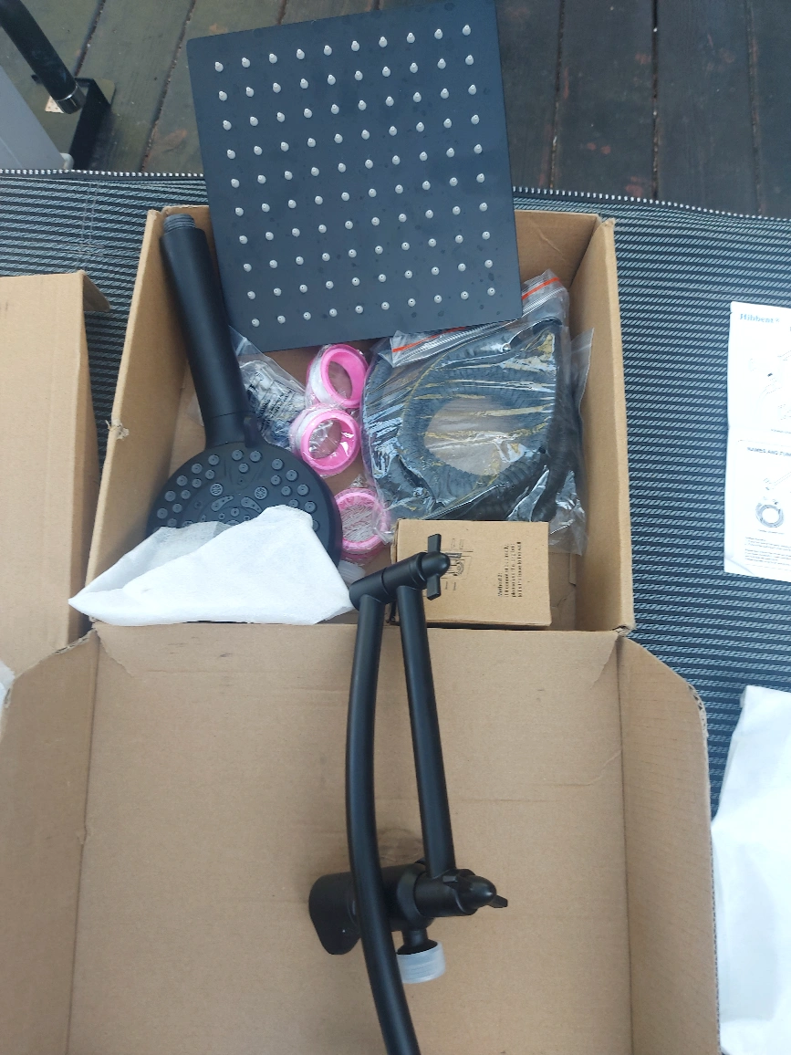 Selling a Hibbent all-metal shower head in oil-rubbed bronze. It's an 8-inch high-pressure rainfall shower head/handheld showerhead combo with a 12-inch adjustable curved shower extension arm. It also features a 10-spray setting and a 71-inch hose. All components are included! open box new