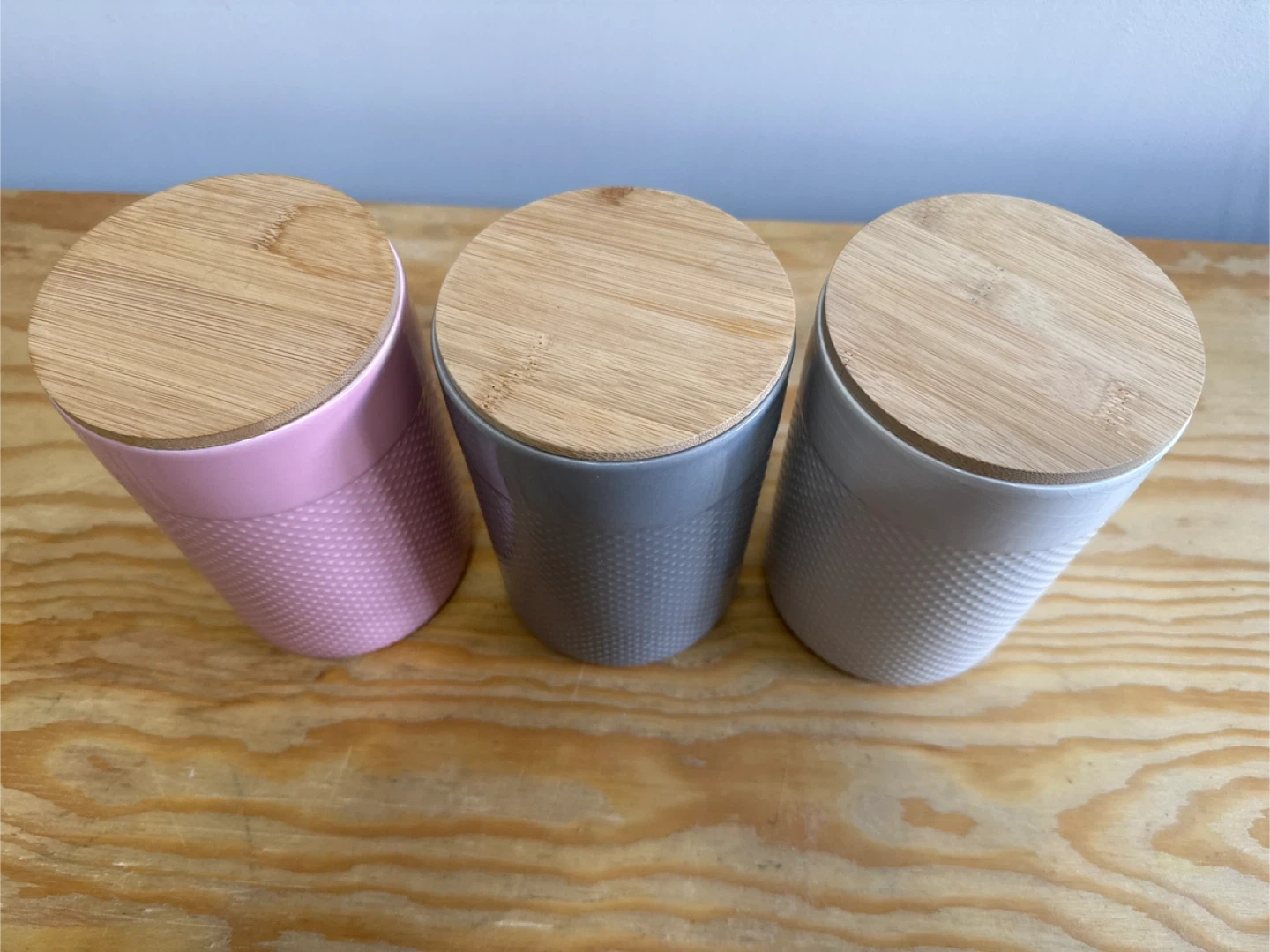This set includes three ceramic canisters in pink, grey, and white, each with a natural bamboo lid. They're perfect for storing dry goods in the kitchen or pantry. The textured design adds a nice touch to any countertop!