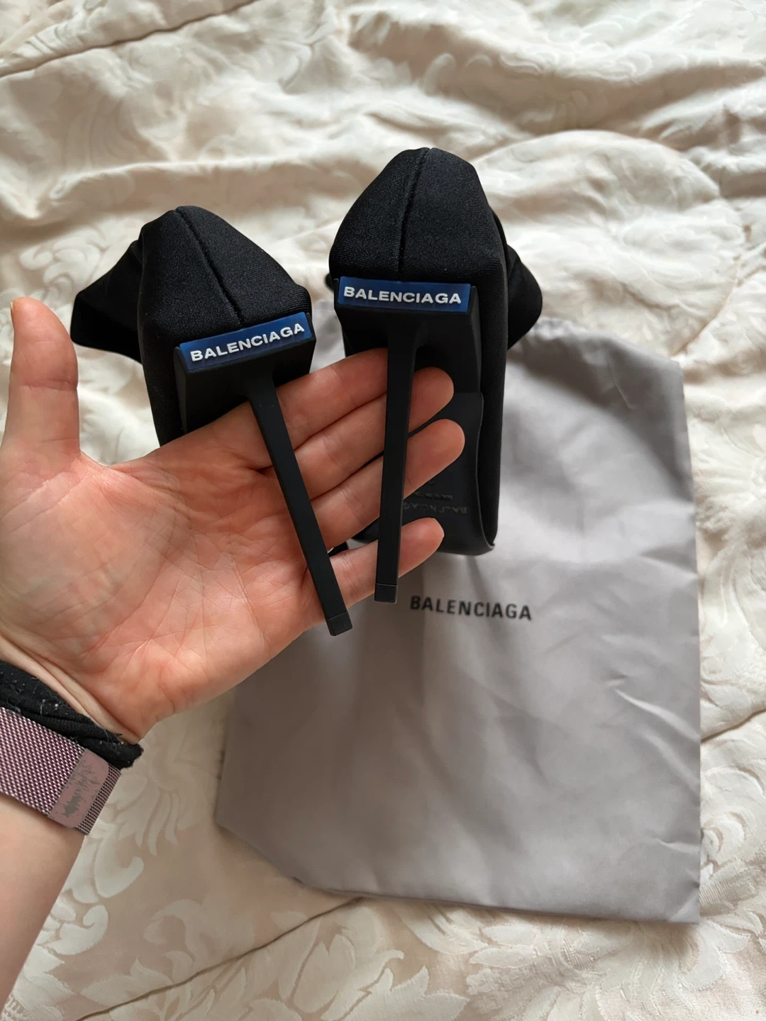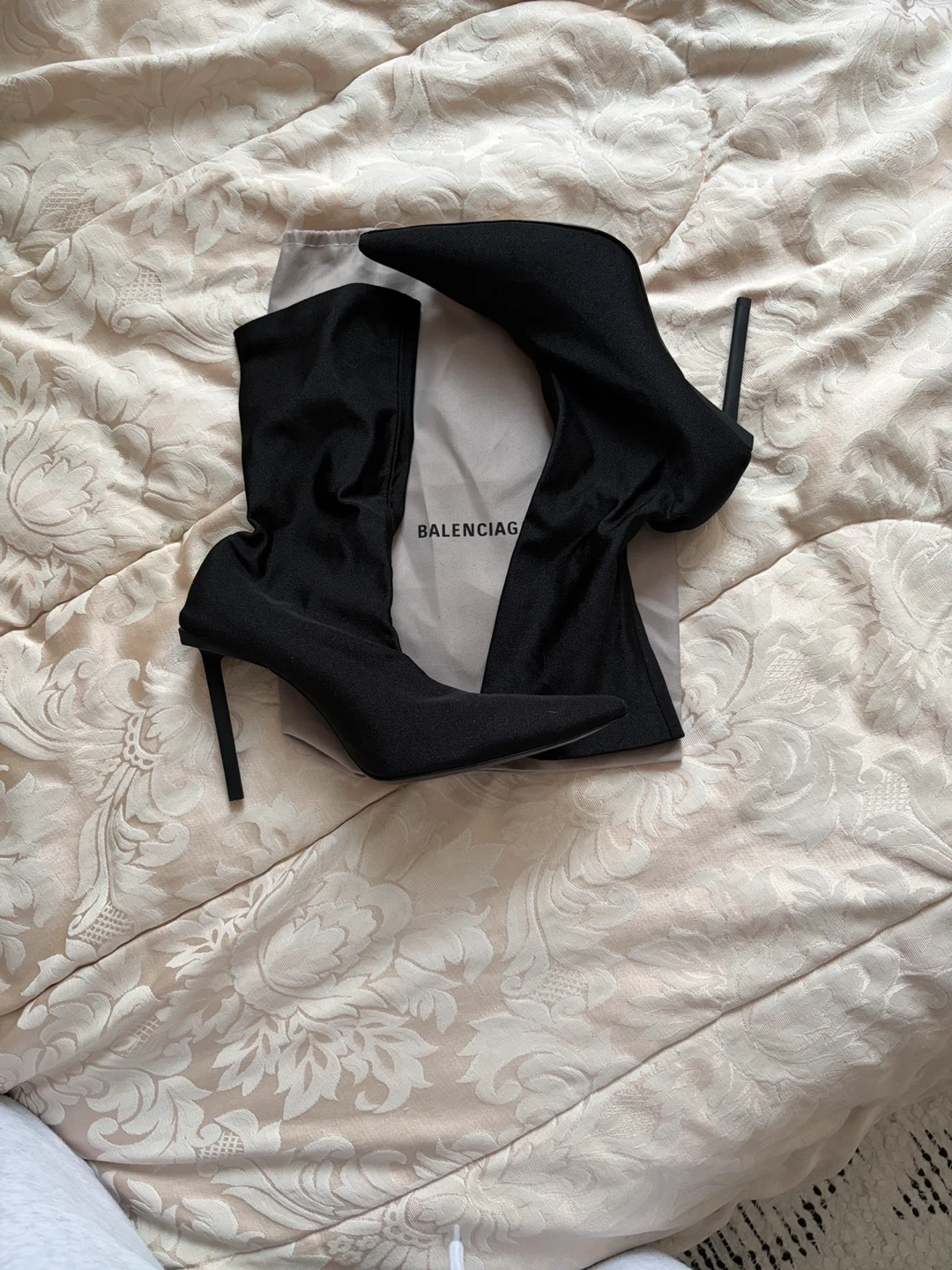 These Balenciaga black stiletto sock boots feature a sleek, form-fitting design. They come with a Balenciaga dust bag. The boots are made of a stretchy fabric material for a comfortable fit.