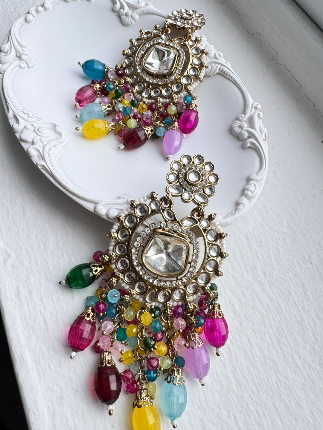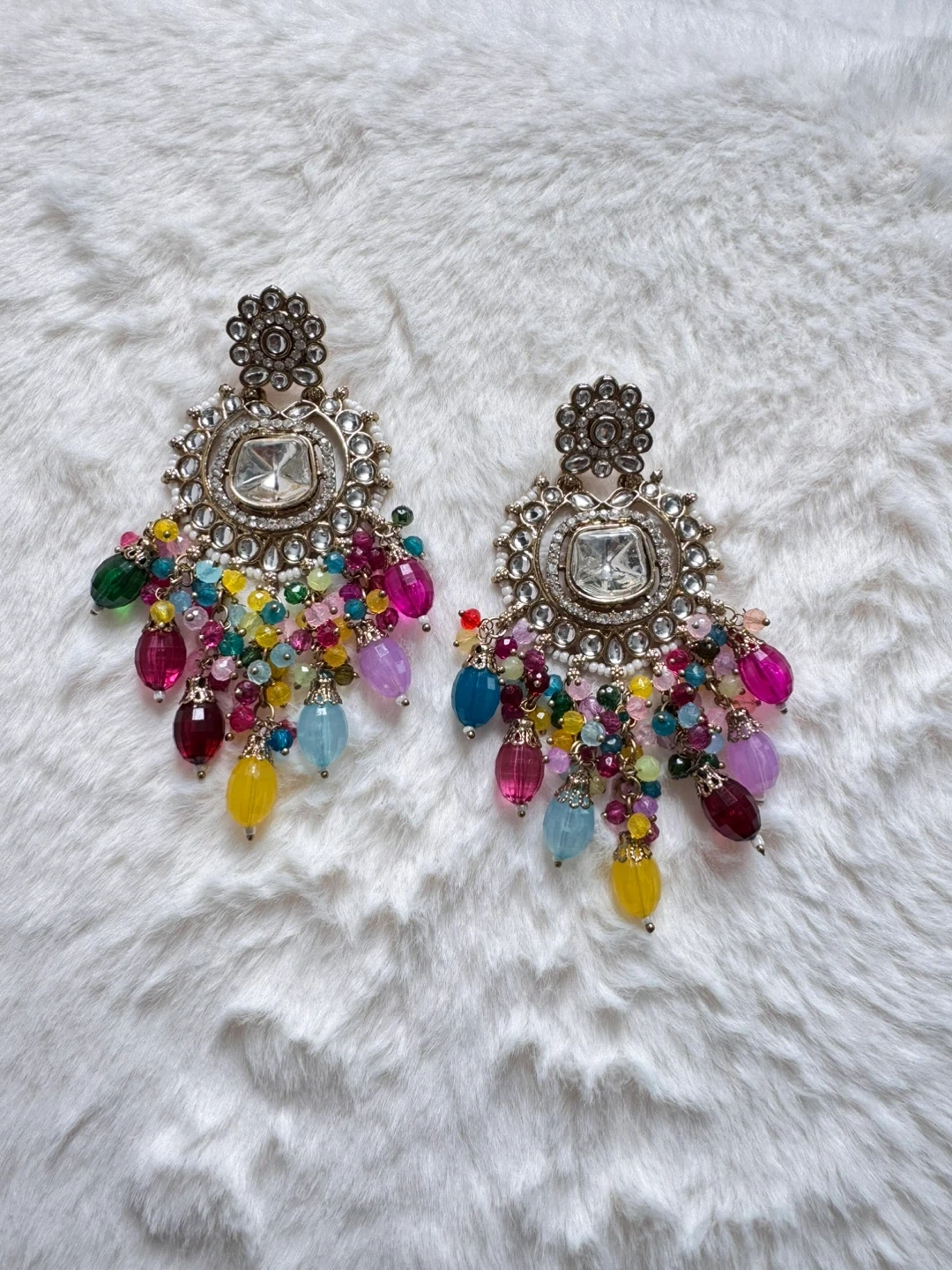 These statement earrings feature a central clear stone surrounded by a decorative metal base. They're adorned with multiple strands of colourful beads in various shapes and sizes. Perfect for adding a pop of colour to any outfit!