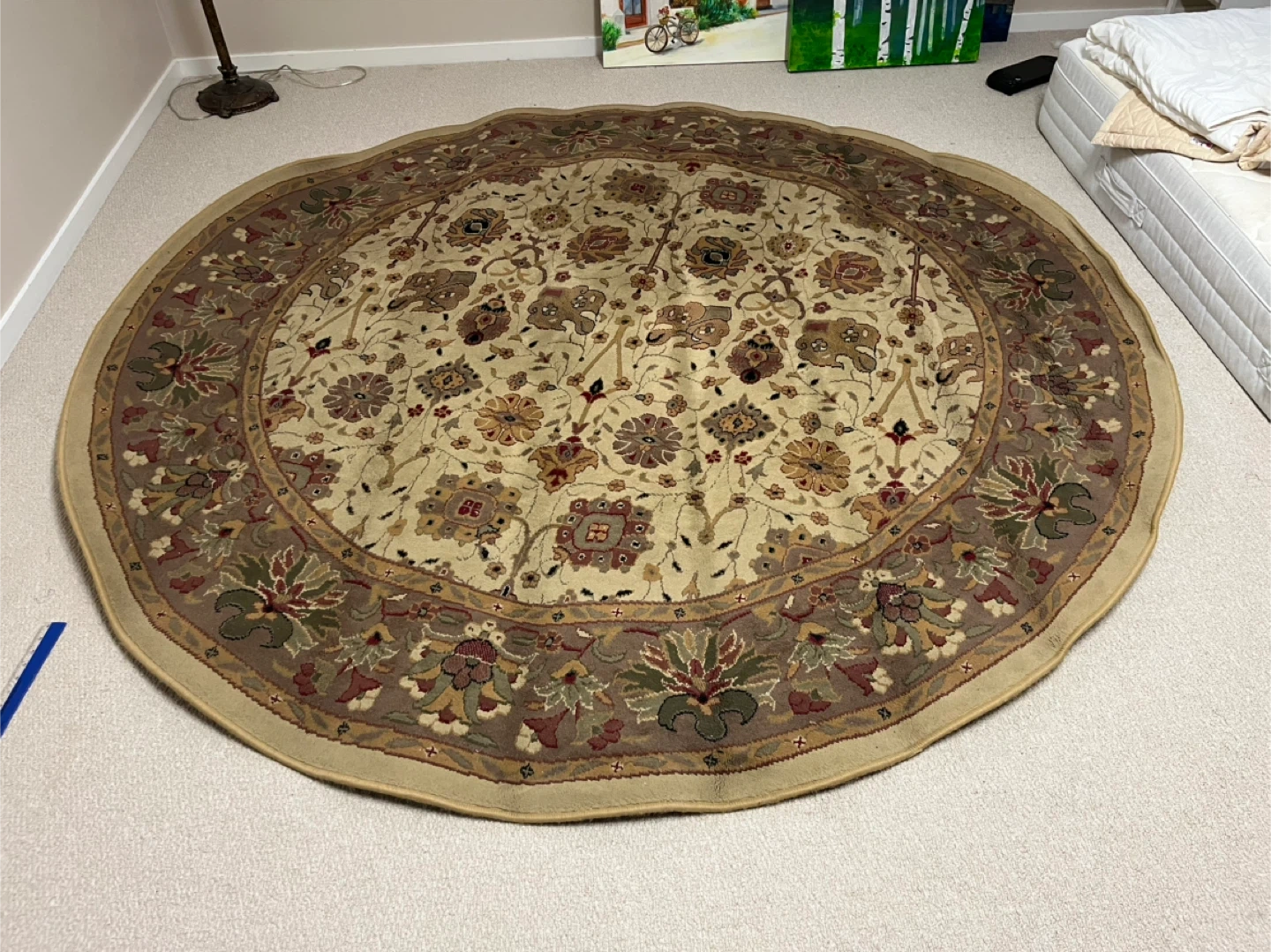 Selling a lovely Highlands round area rug. It's made of 100% WEAV-LON Heat Set Polyolefine. Vacuum regularly and clean spills immediately with a clean sponge or cloth. Remove rug from surface until dry