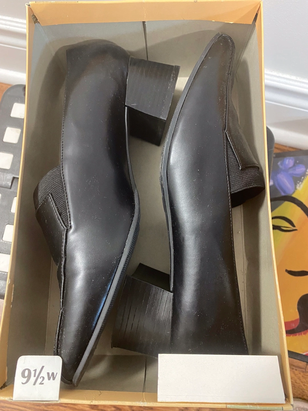 Black leather dress shoes with a short platform heel, size 9.5 Comes in the original box.
