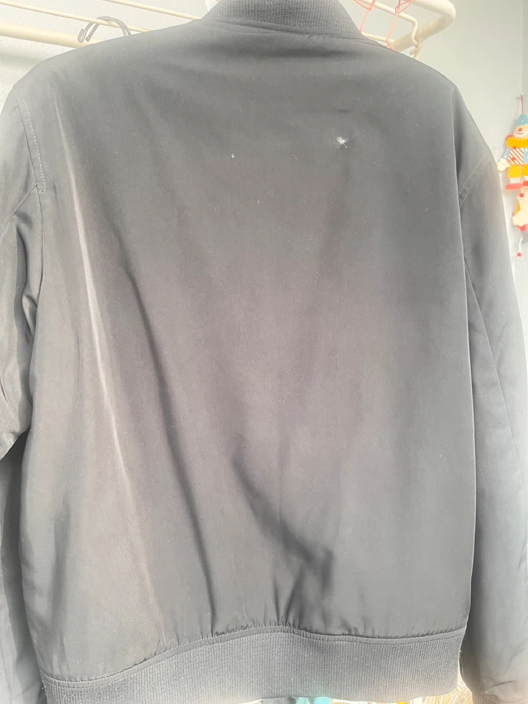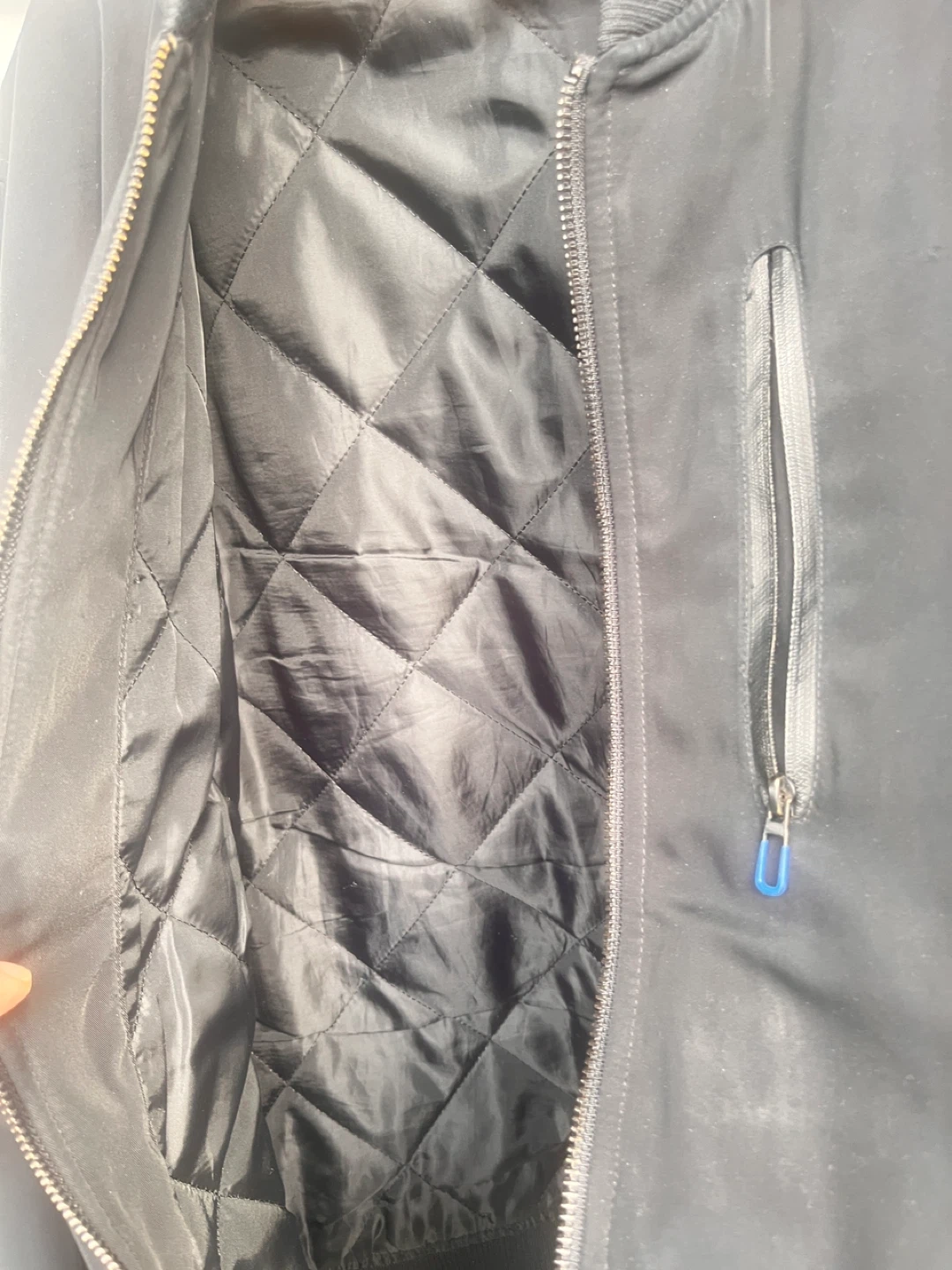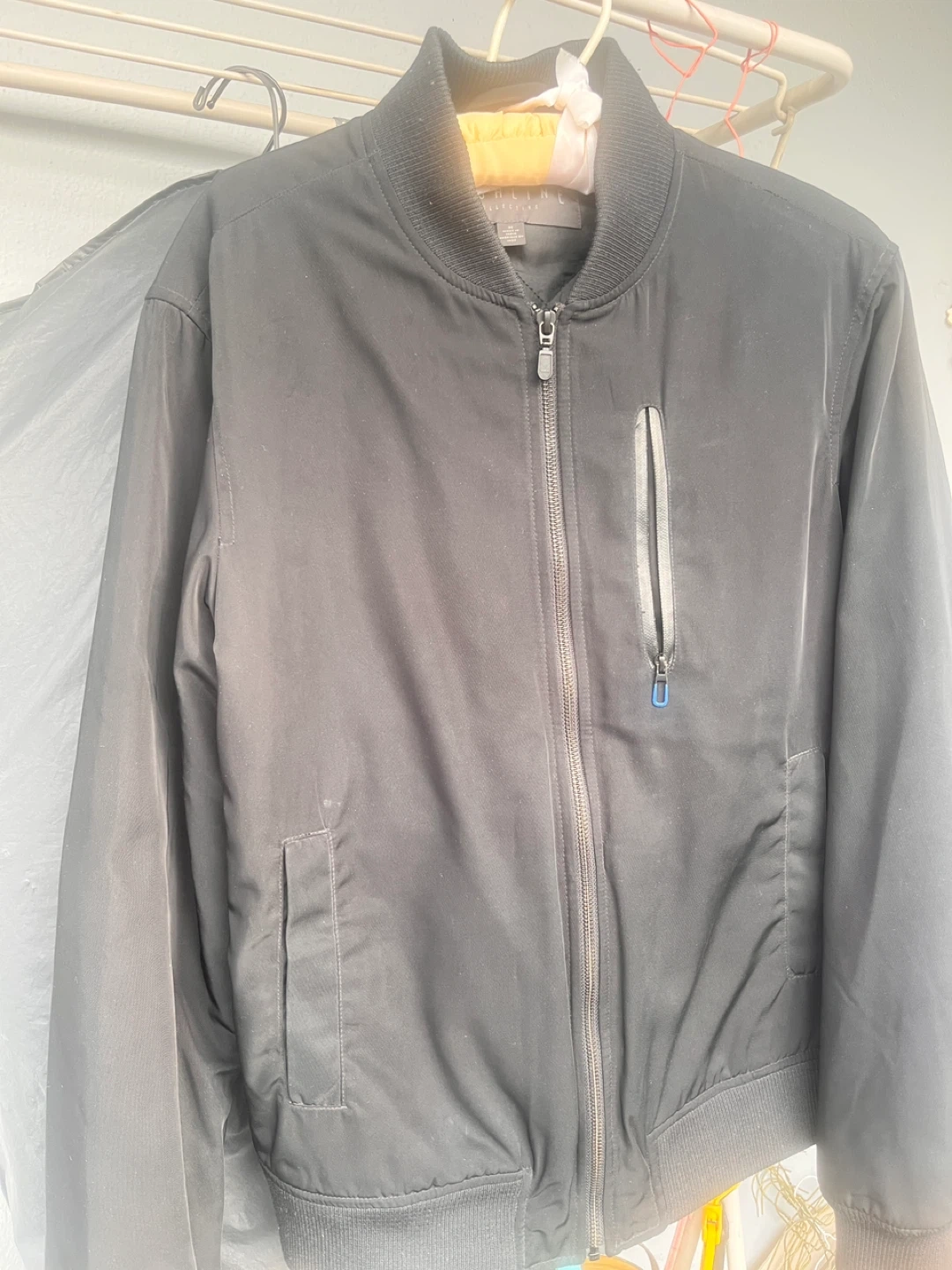 158Selling a Highline Collective bomber jacket in size medium. It's a stylish piece with a quilted interior. The jacket features a zipper closure and a small zippered pocket on the front. Perfect for adding a touch of cool to your wardrobe!