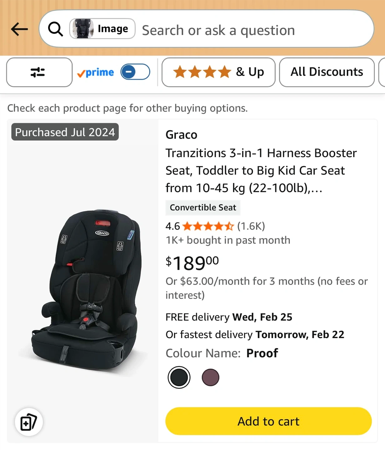 Graco Tranzitions 3-in-1 car seat. Converts from a 5-point harness to a highback booster and then a backless booster. It's designed for kids from 10-45 kg (22-100lb).