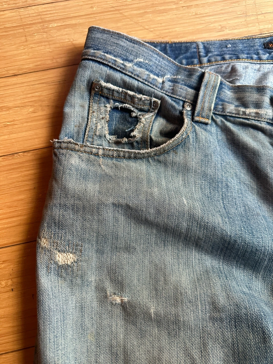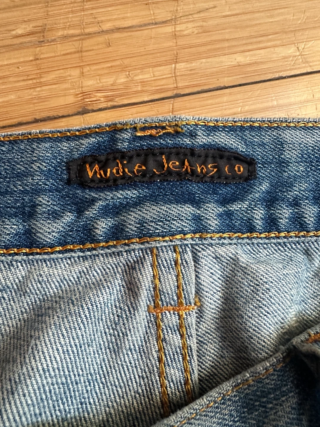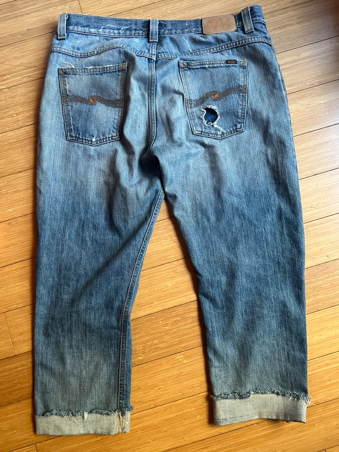 A super great pair of destroyed nudies with factory repair and distressing. No longer fit me. Baggy fit.
