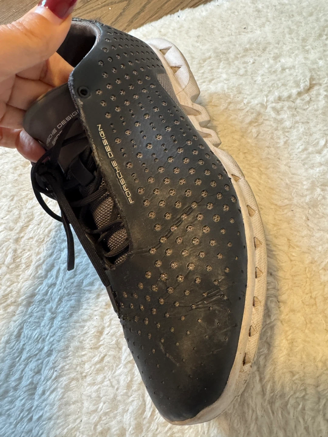 These black Porsche Design Sport sneakers feature a perforated design and lace-up closure. They appear to be a men's size.