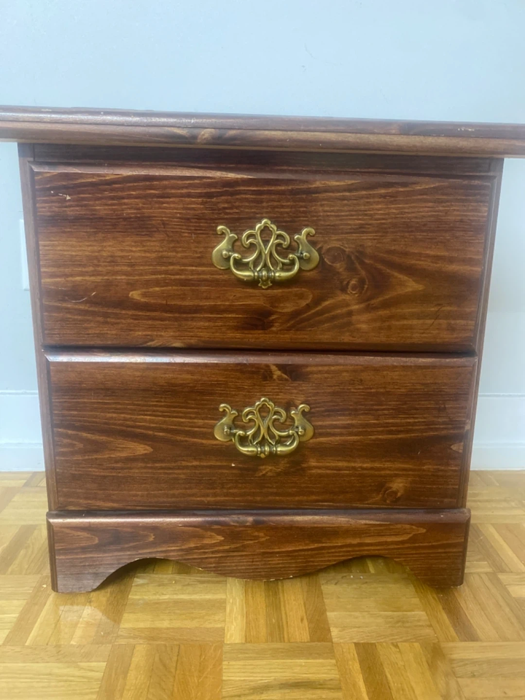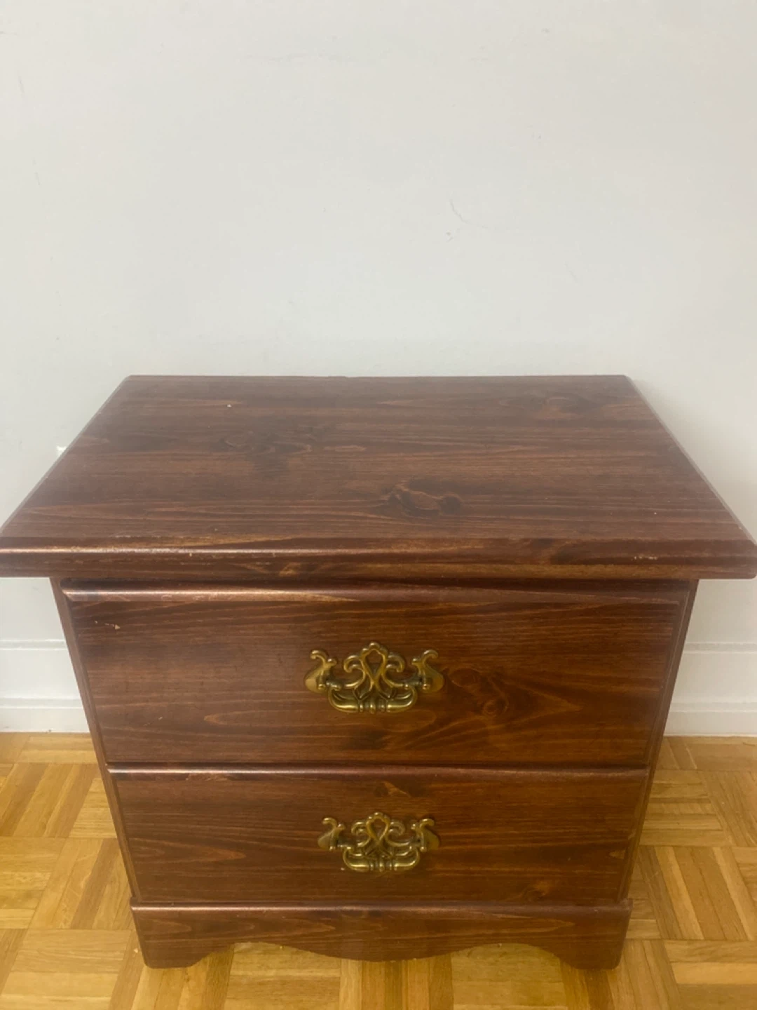 Here's a charming wooden nightstand with two drawers! It's perfect for adding a touch of warmth and functionality to your bedroom. The drawers feature ornate handles, and the wood has a rich, dark finish.